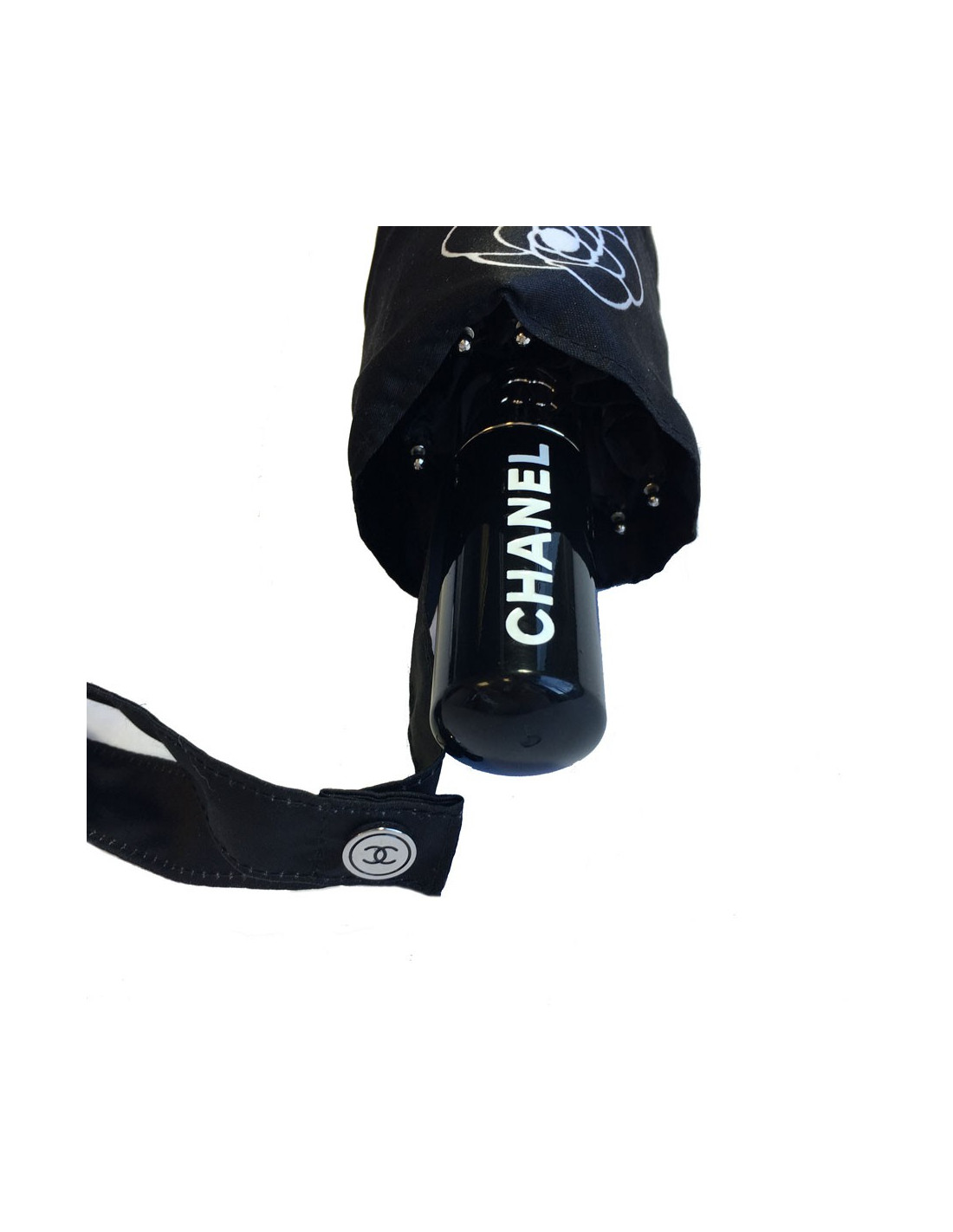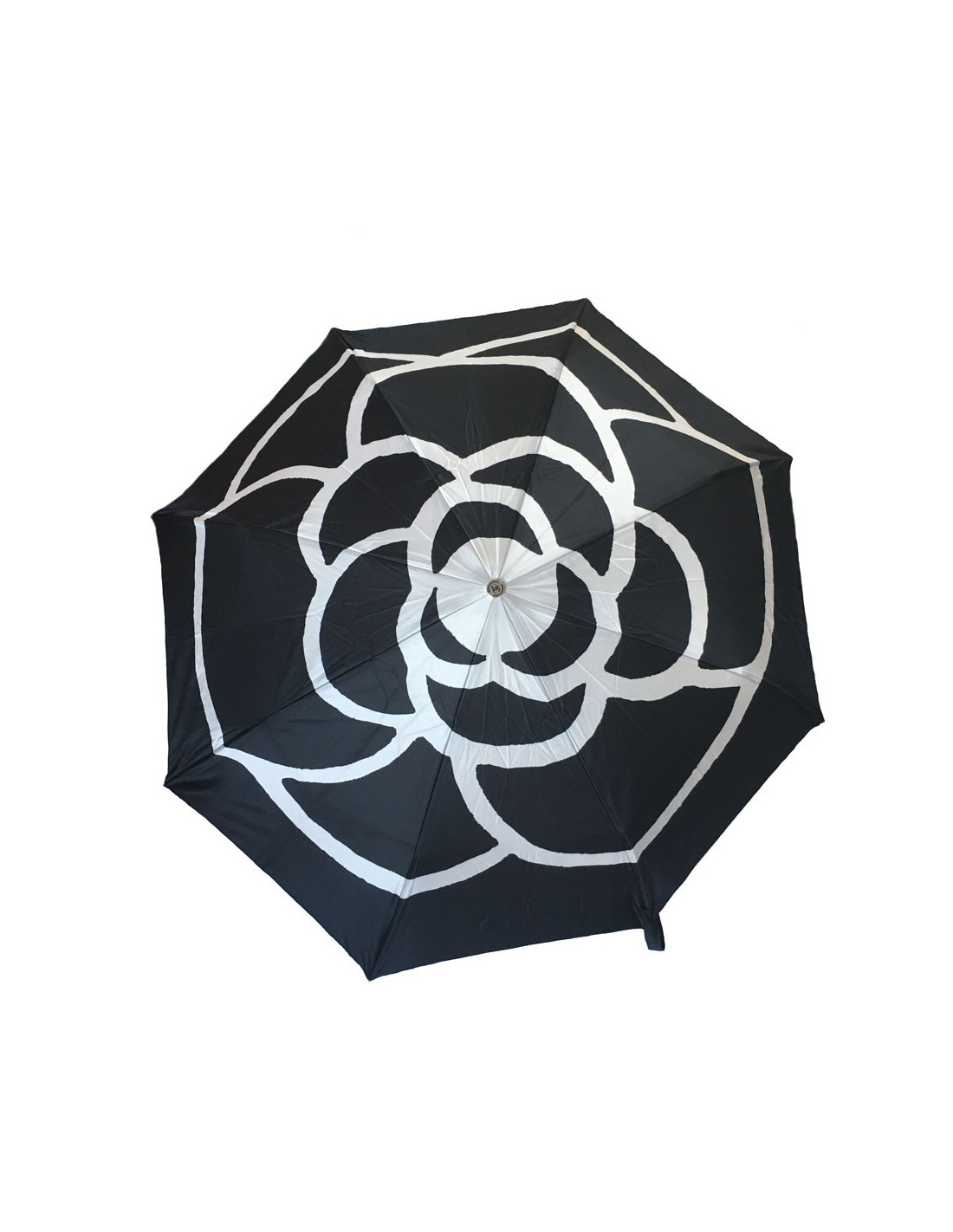 Parapluie CHANEL noir et blanc. Dessin d'un camélia blanc sur fond noir lorsqu'il est ouvert.