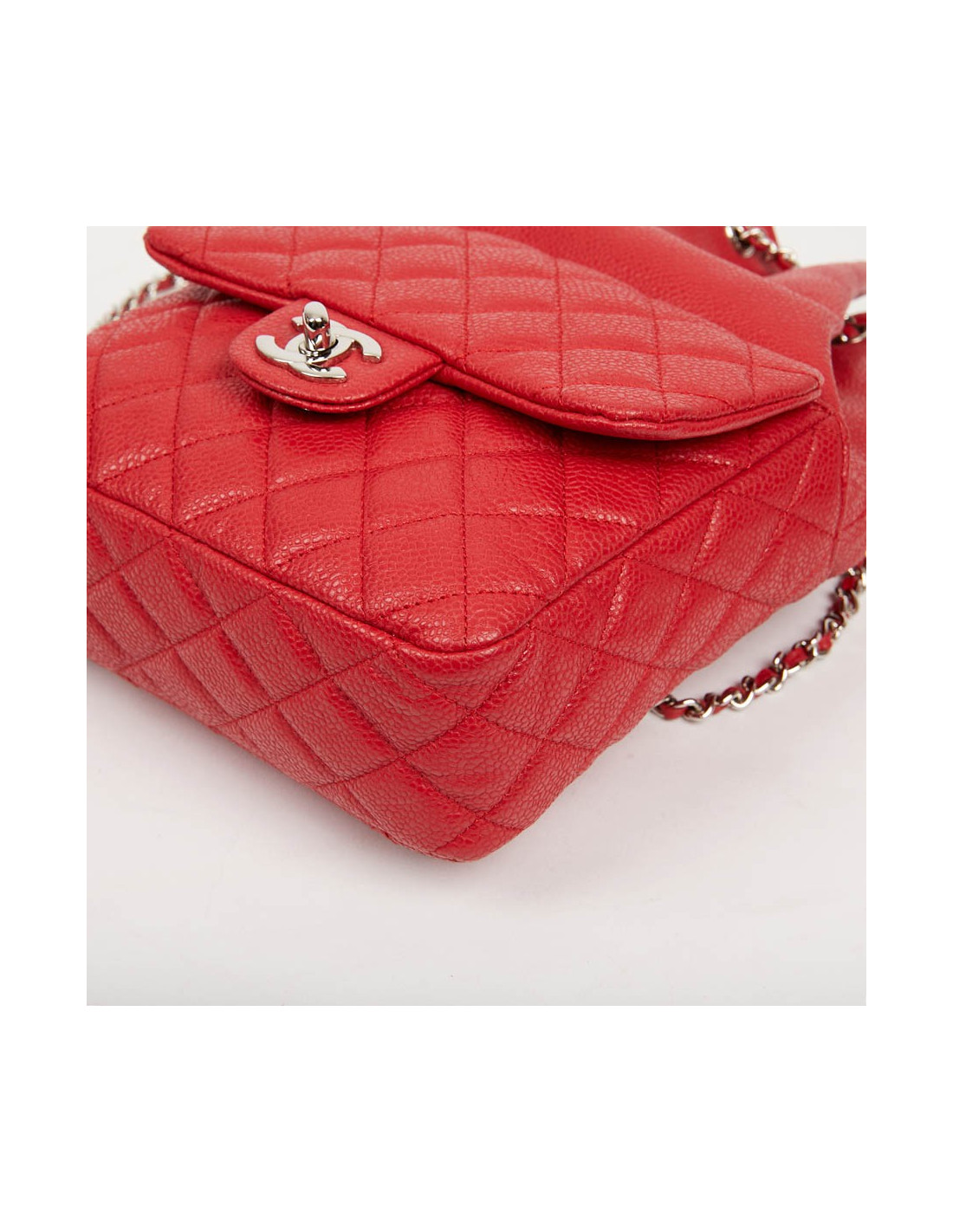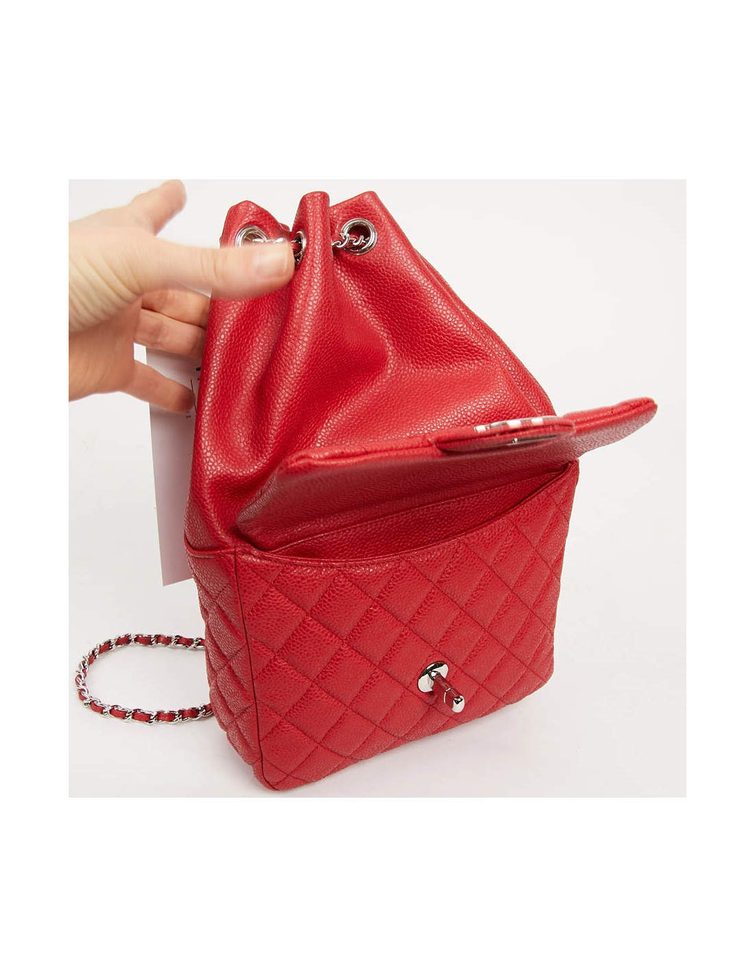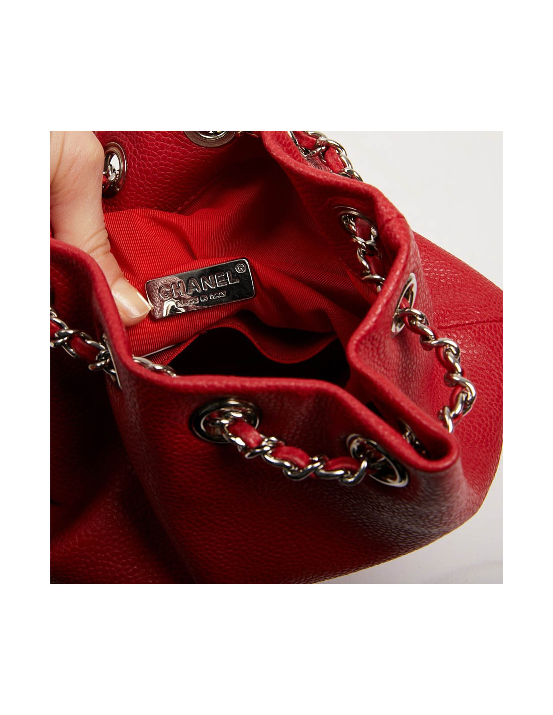 CHANEL small backpack in Grained Red Leather with silver metal jewelry. It has a large storage space as well as a small flat pocket at the front closed by a Mademoiselle clasp (double C).
