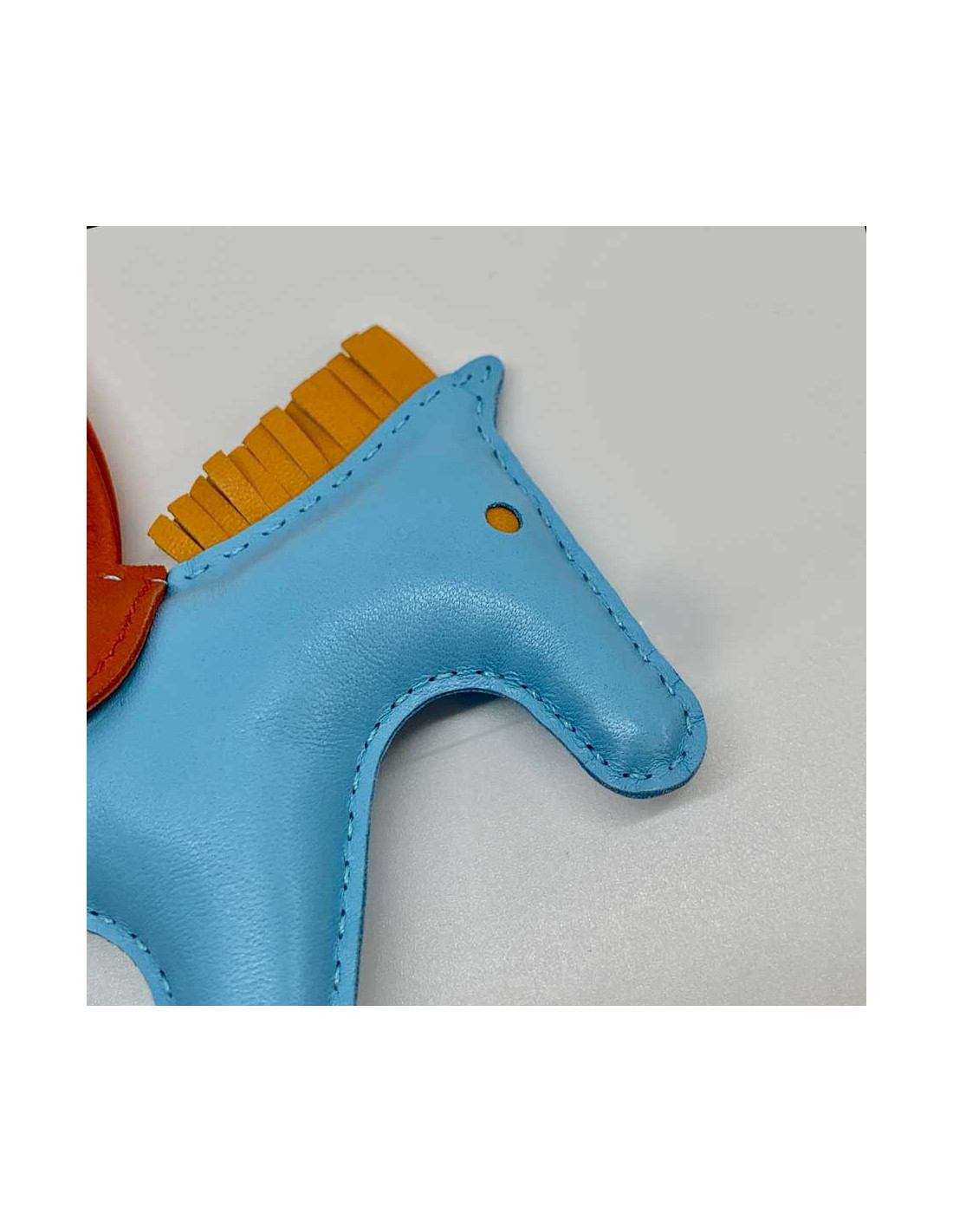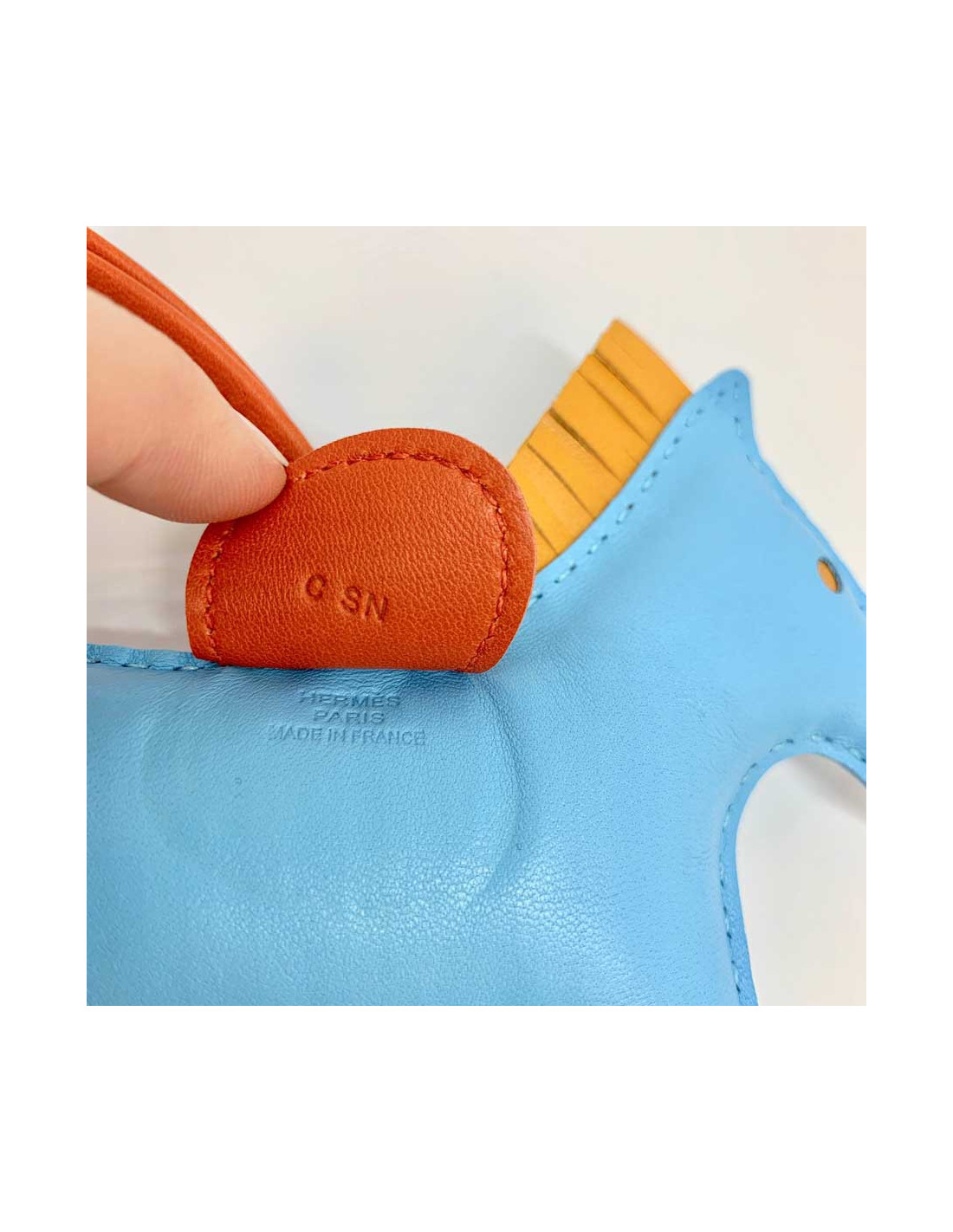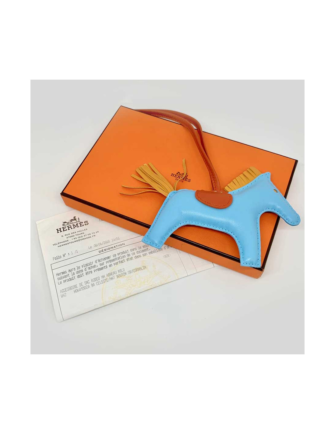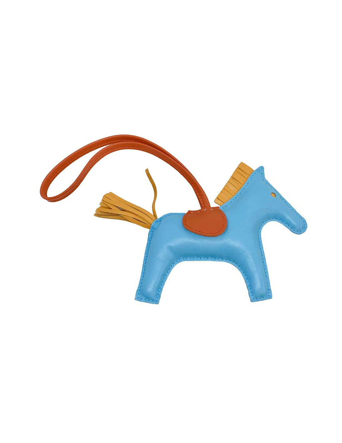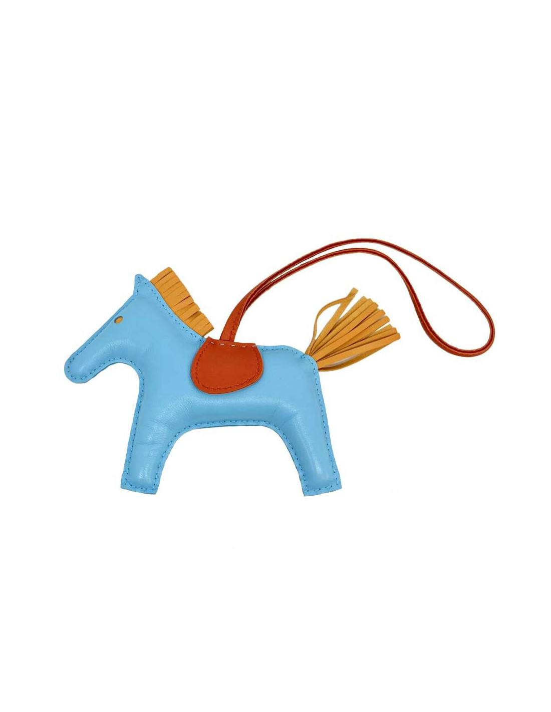 Details : HERMES horse charm, rodeo model, in celestial blue lamb leather, gold button and cornalin. HERMES brand engraved on the leather under the saddle, see photo. The charm will be delivered in its HERMES box with its original invoice.