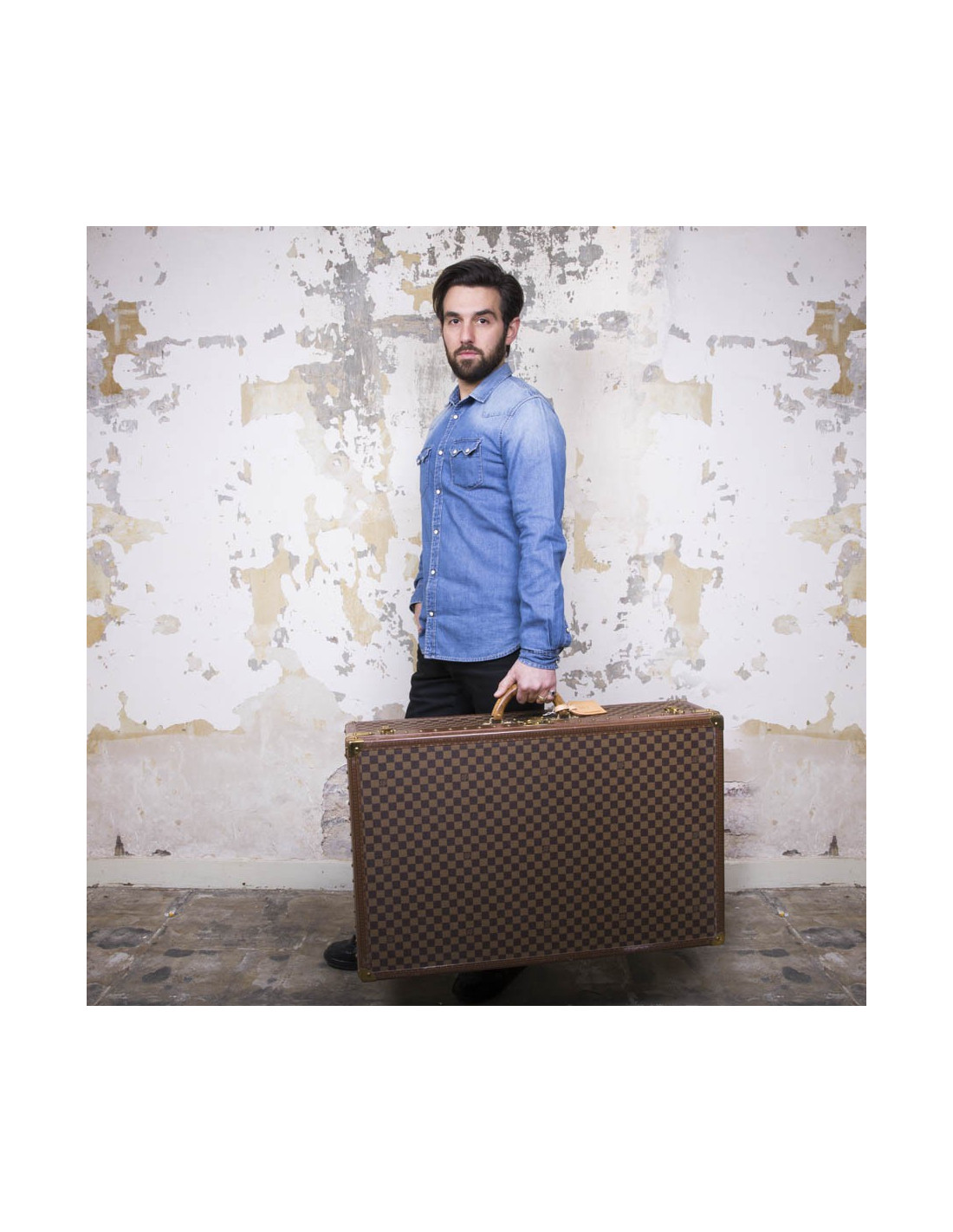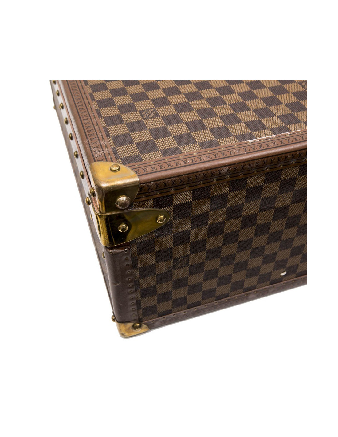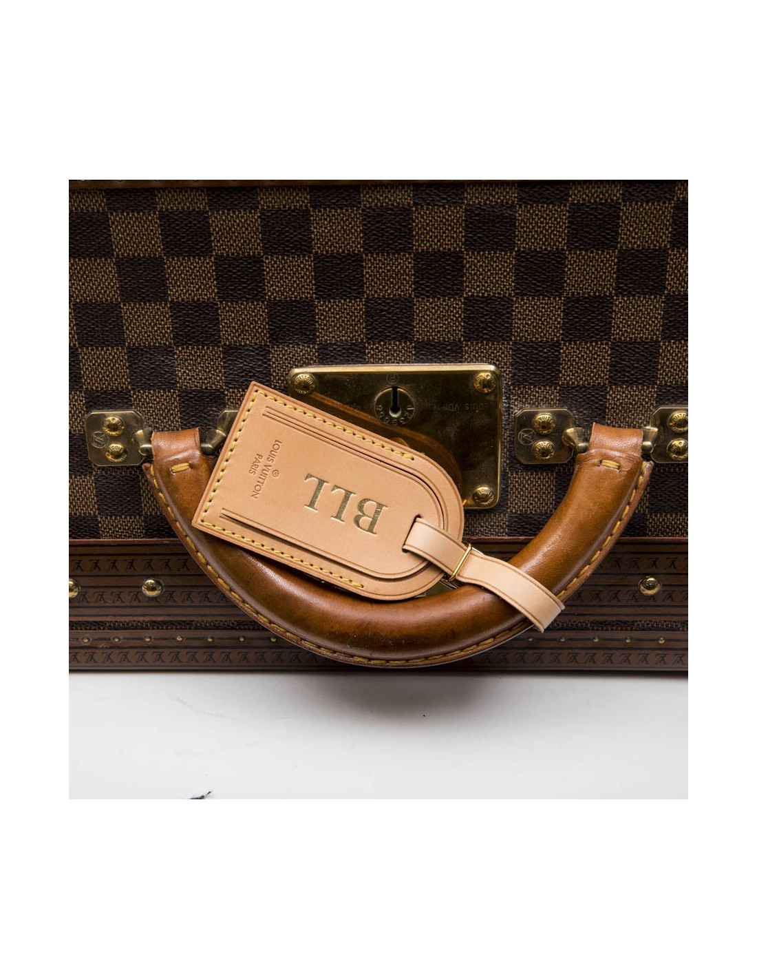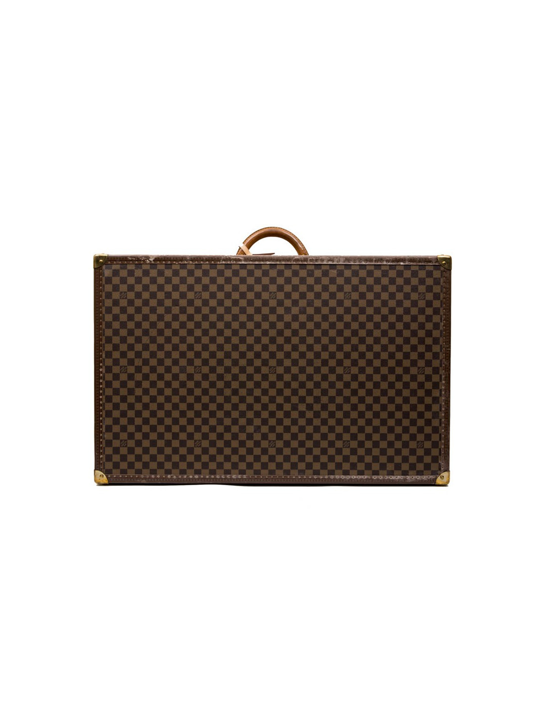 Louis Vuitton suitcase in Damier Ebène canvas with red microfiber fiber lining. The handles are rounded in natural cowhide leather.