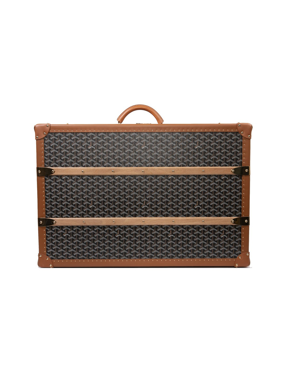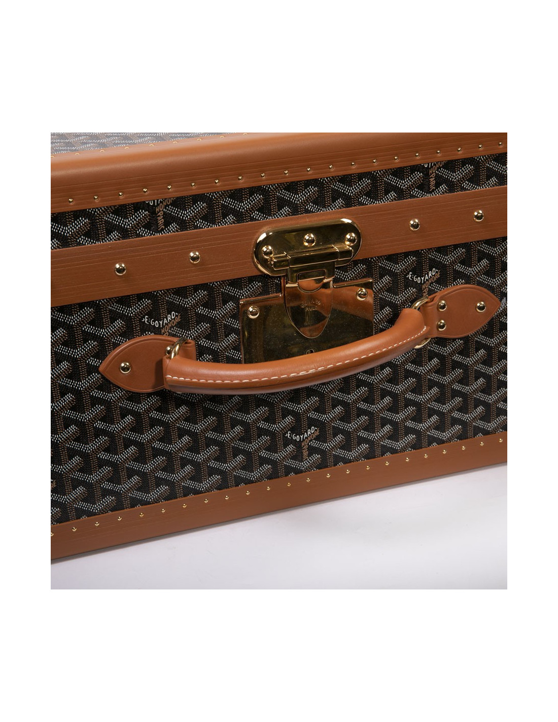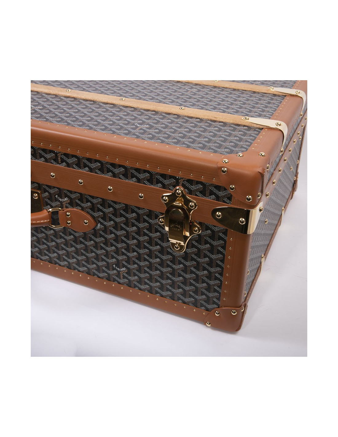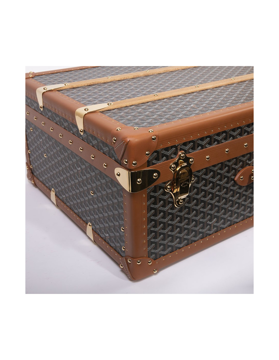 Goyard large travel trunk (hard suitcase) in brown monogrammed canvas with brown and black herringbone and light brown cowhide trim with gold metal rivet.