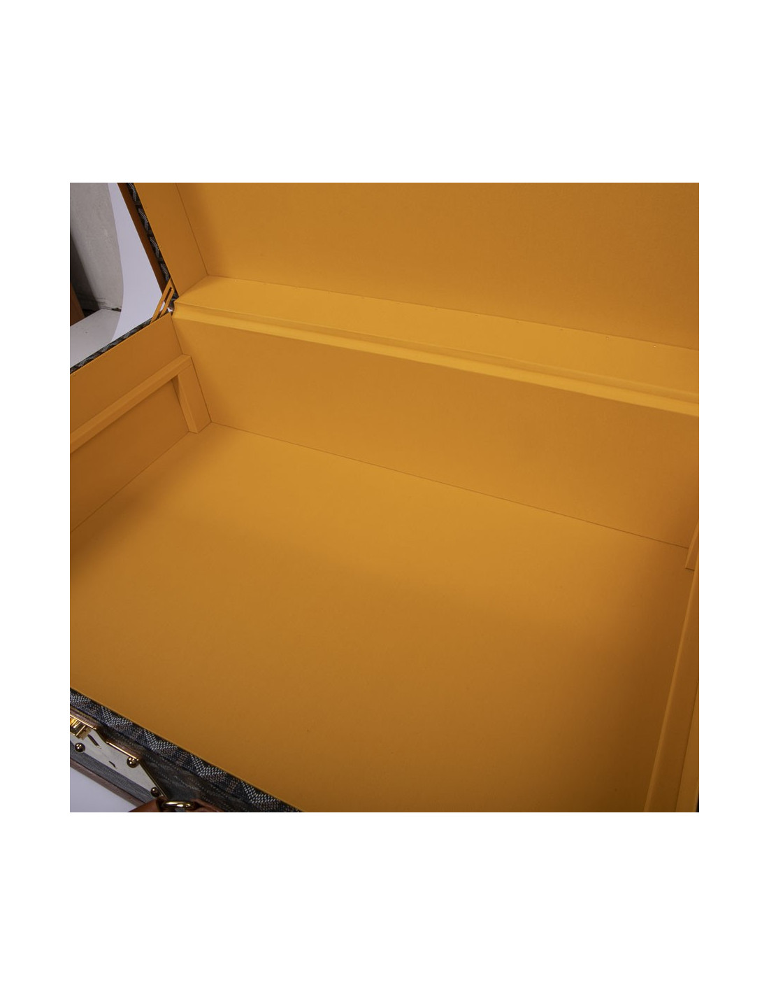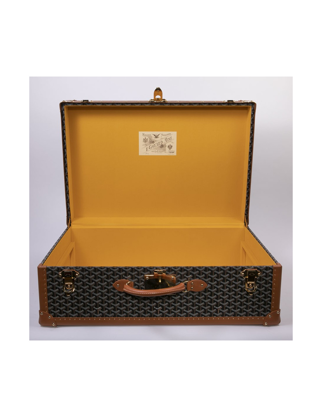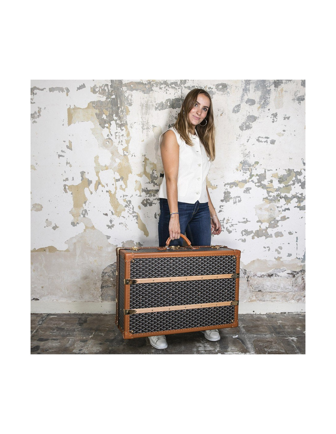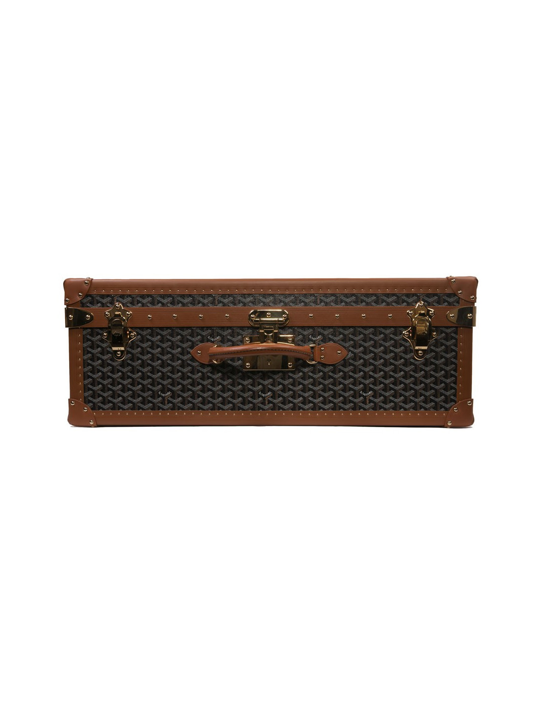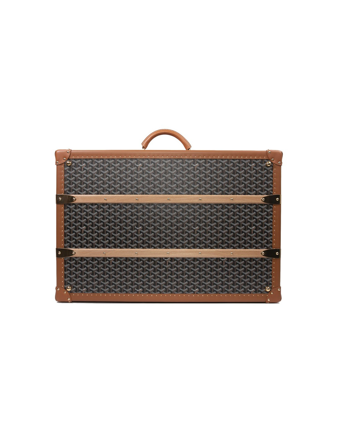 Goyard large travel trunk (hard suitcase) in brown monogrammed canvas with brown and black herringbone and light brown cowhide trim with gold metal rivet.