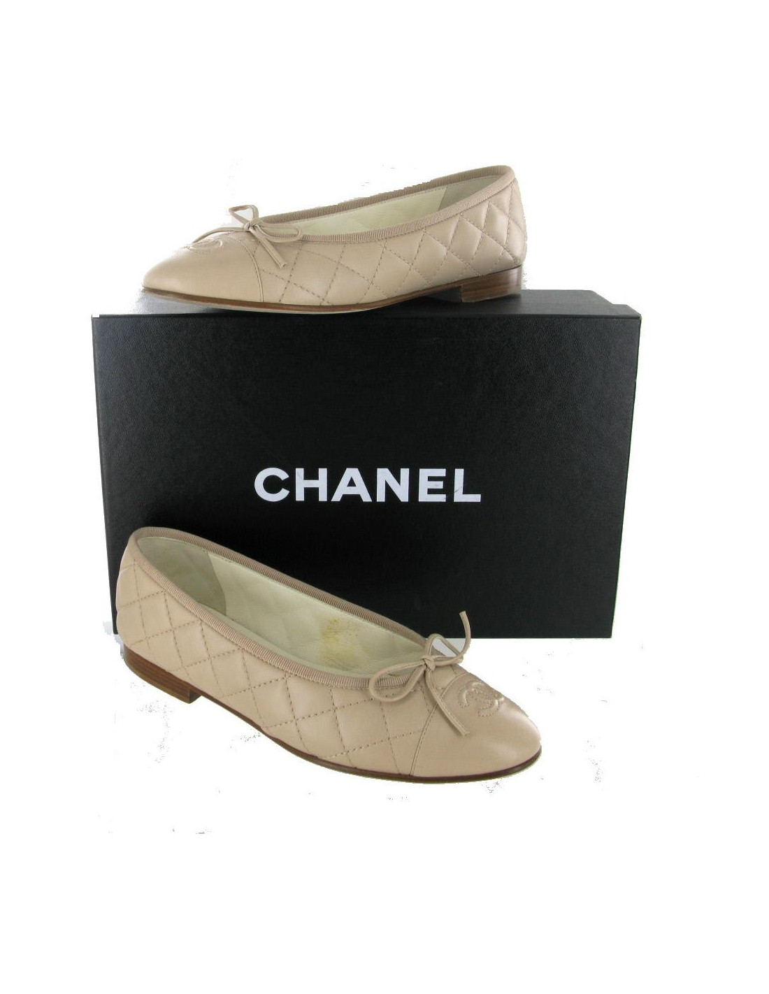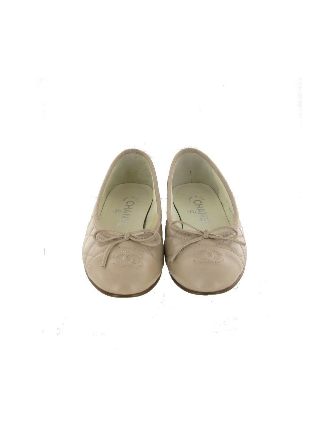 Ballerinas T35.5 CHANEL beige quilted leather. At the front of the shoe the emblematic acronym "CC" is embroidered. There is a yellowish trace inside one of the shoes. Very little worn, they are in very good condition. Delivered with box d ' origin.