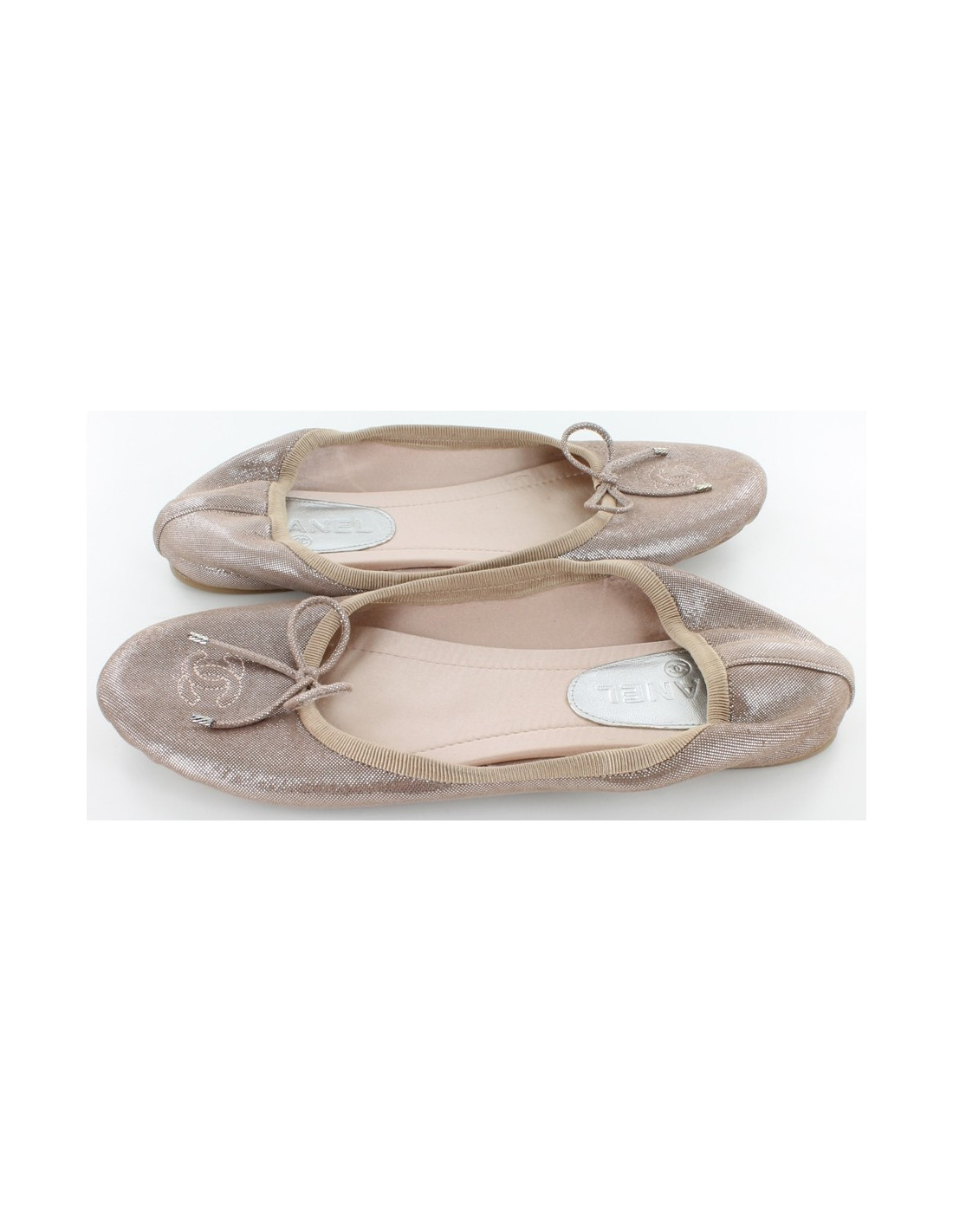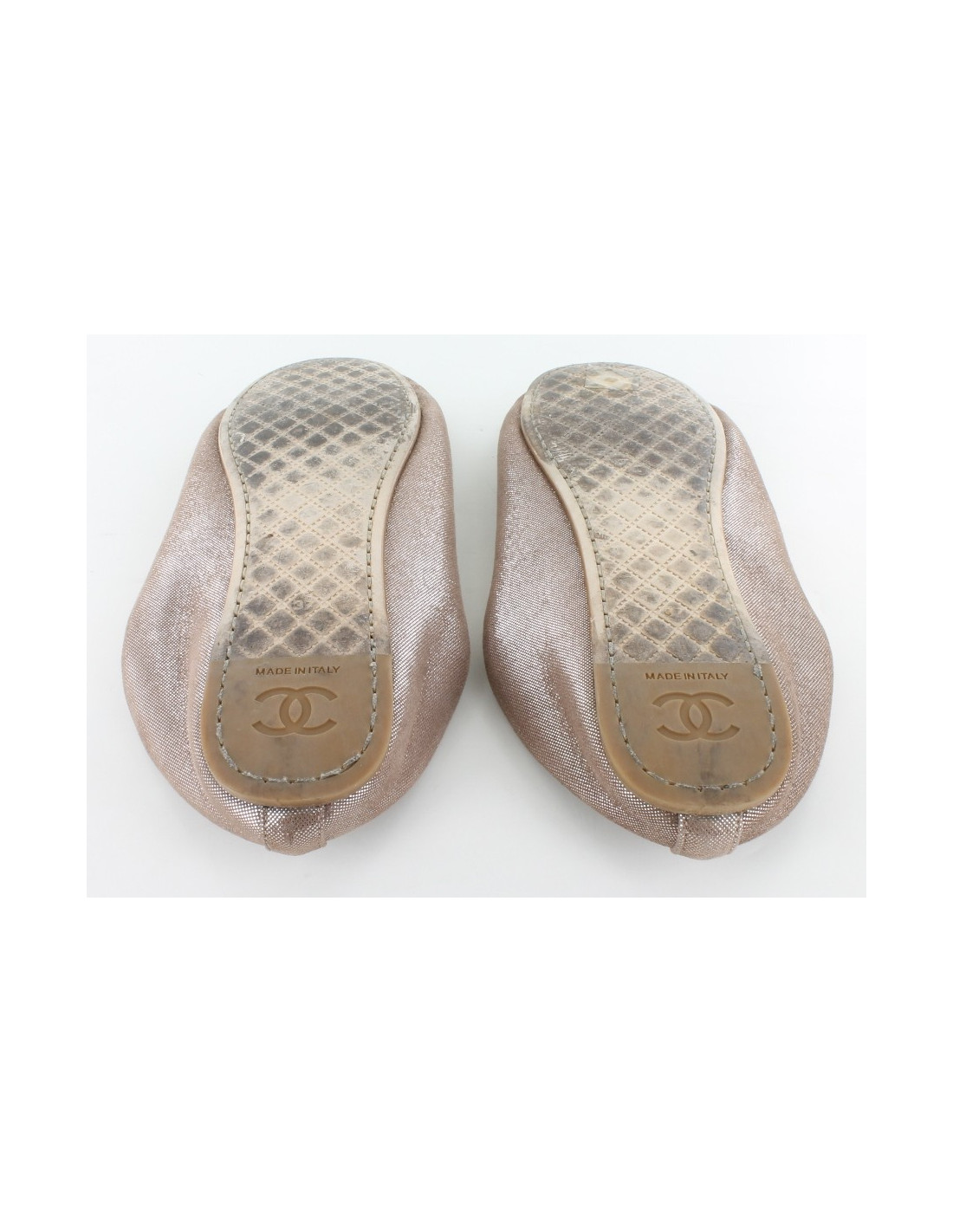 CHANEL ballerinas in pink metallic canvas, size 37. In the spirit of a dance shoe, these ballerinas are very feminine and elegant. The metallic effect of the canvas reflects light. The front of the foot is embroidered a CC mark. Outsole leather liveried CC. Tiny black trace on the left foot to the inside of the foot level. Made in Italy.