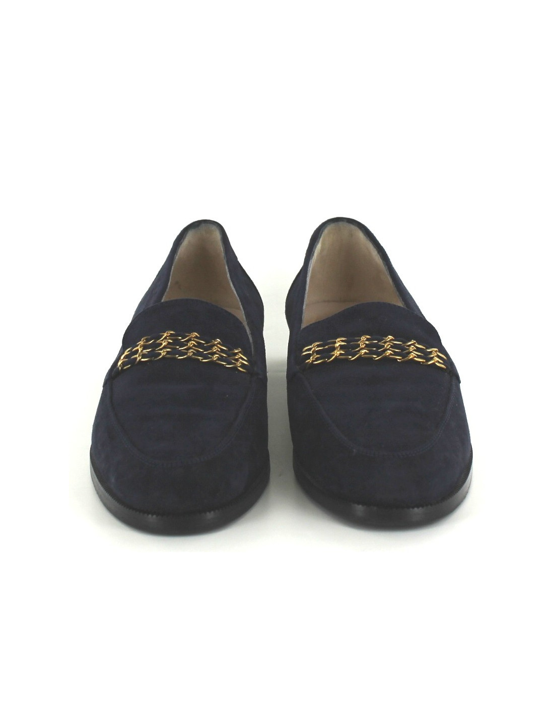CHANEL Navy Blue Suede moccasins, size 37.5. Collection fall-winter 1994. On the front of the foot, three golden chains are embroidered to bring a touch of elegance. CC signature embroidered on the back of the foot. Inner and outer leather soles. Sold in their original box. Made in Italy.