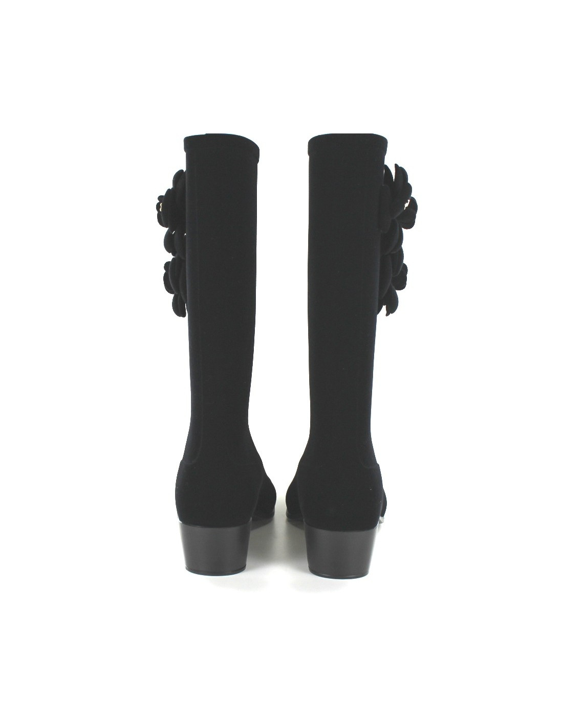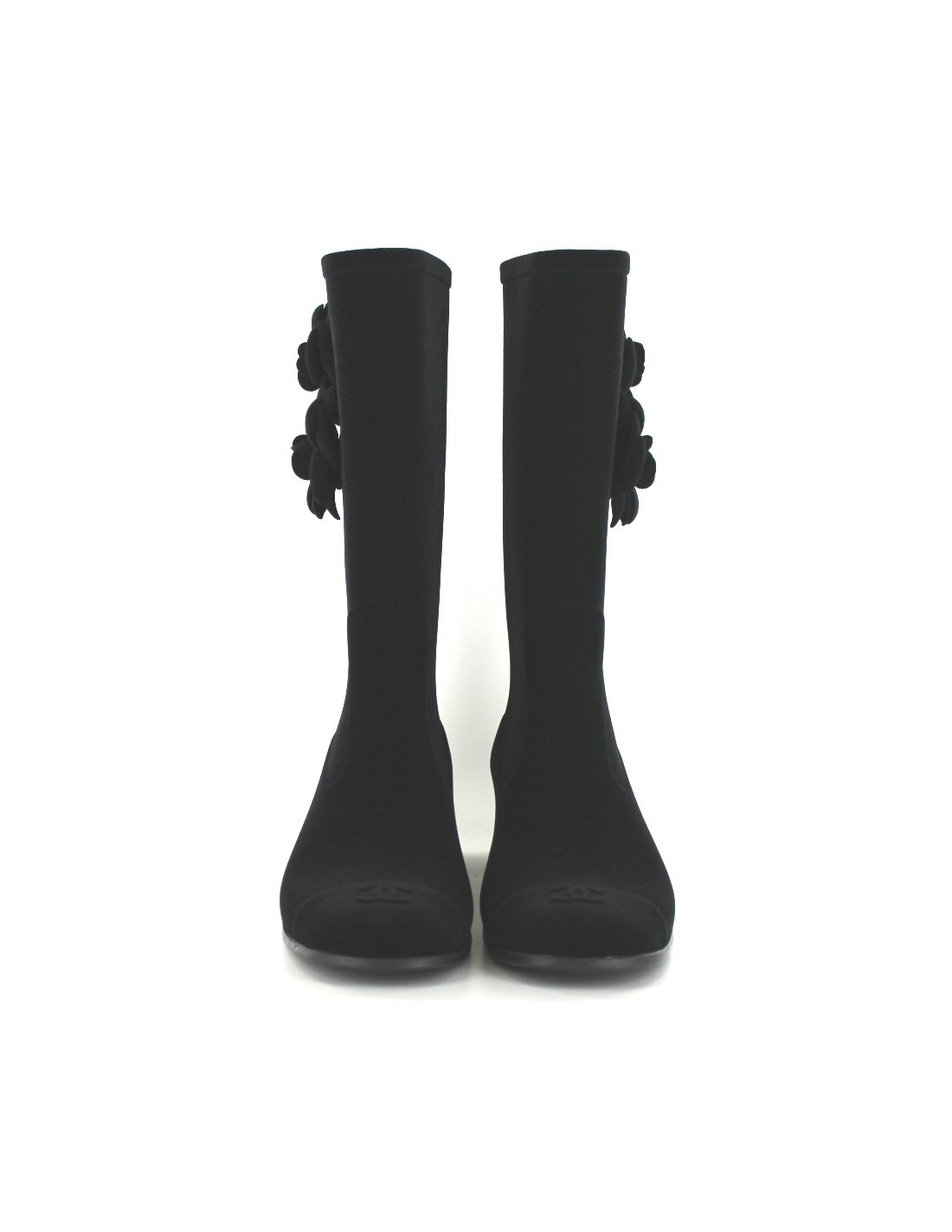Boots CHANEL rain in black felt. Two very nice camélias adorn each bundle. On one of the camellias is sewn a CC signature in gold metal. On the front of the foot, a CC embossed decorates the boots. These shoes are new. Sold with their dustbag. Made in Italy.