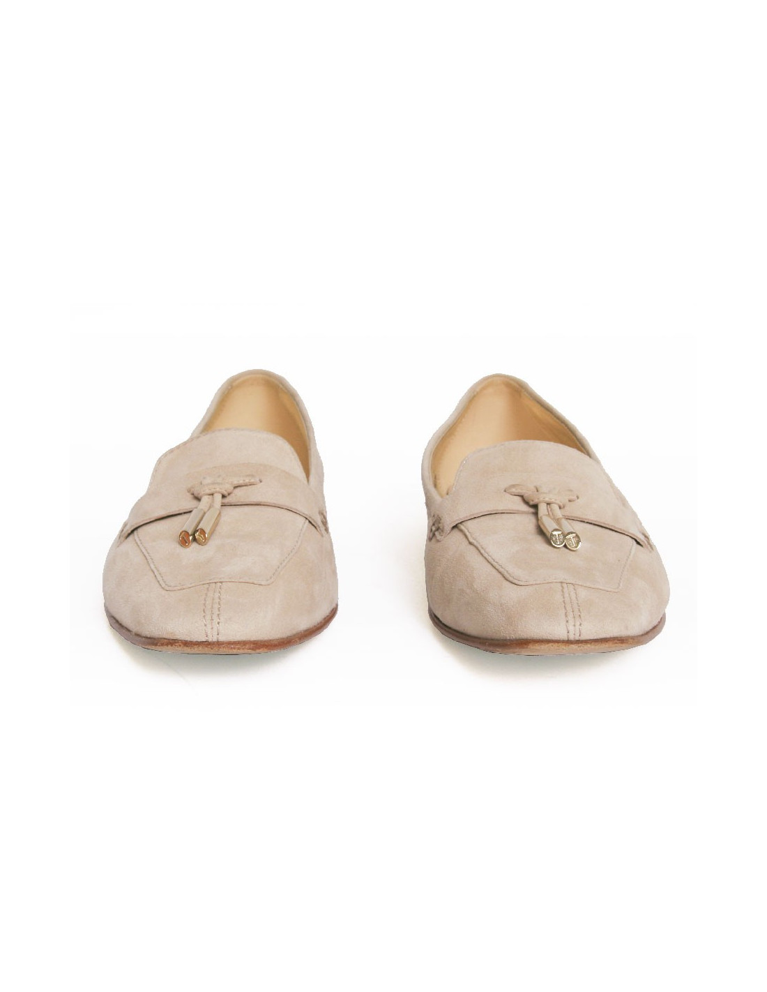Very elegant pair of beige suede Tod's moccasins. Size 38.5. Stitching in the same color. Little knot at the front of the shoe with a golden tip and the "T" for Tod's engraved at the end. In very good condition.