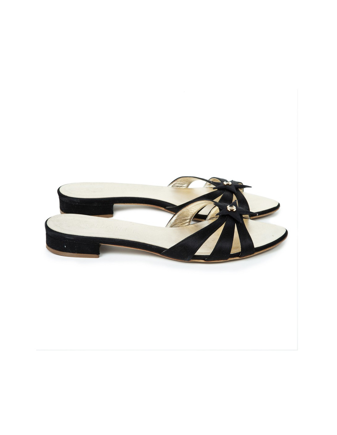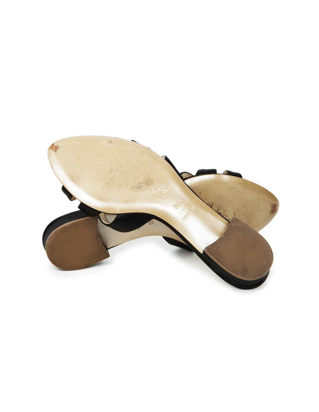 Size 38.5. The acronym 'CC' gold filled with Rhinestones is on a star on the front of the sandal. Insole leather color gold. Small heel. In very good condition.