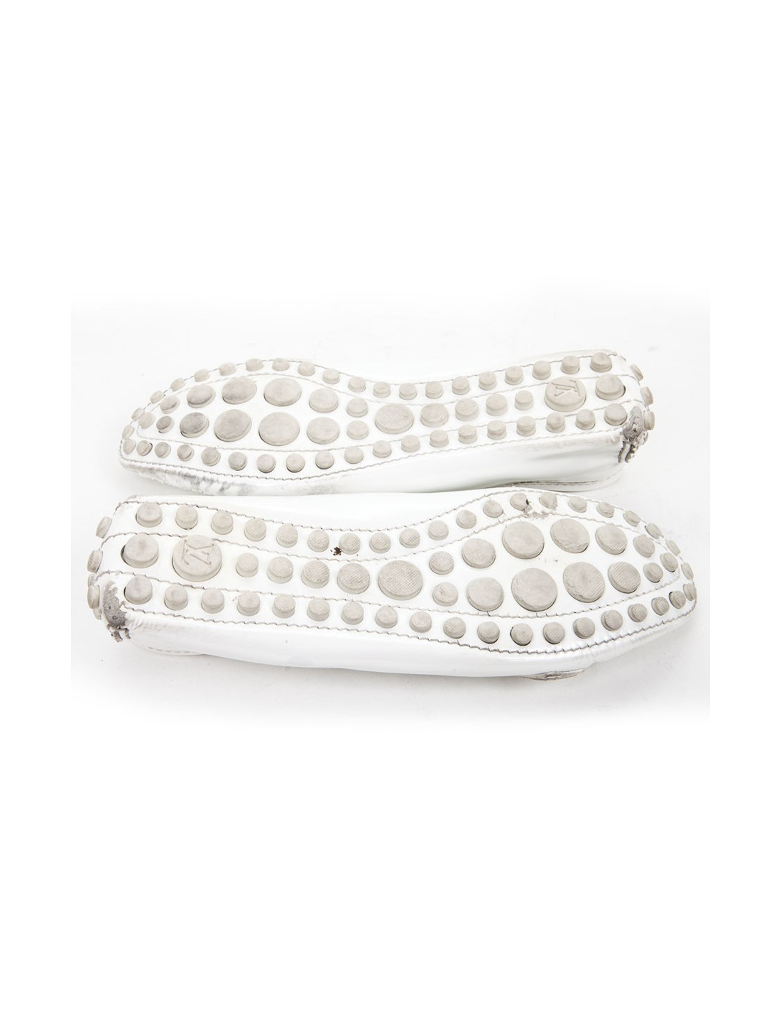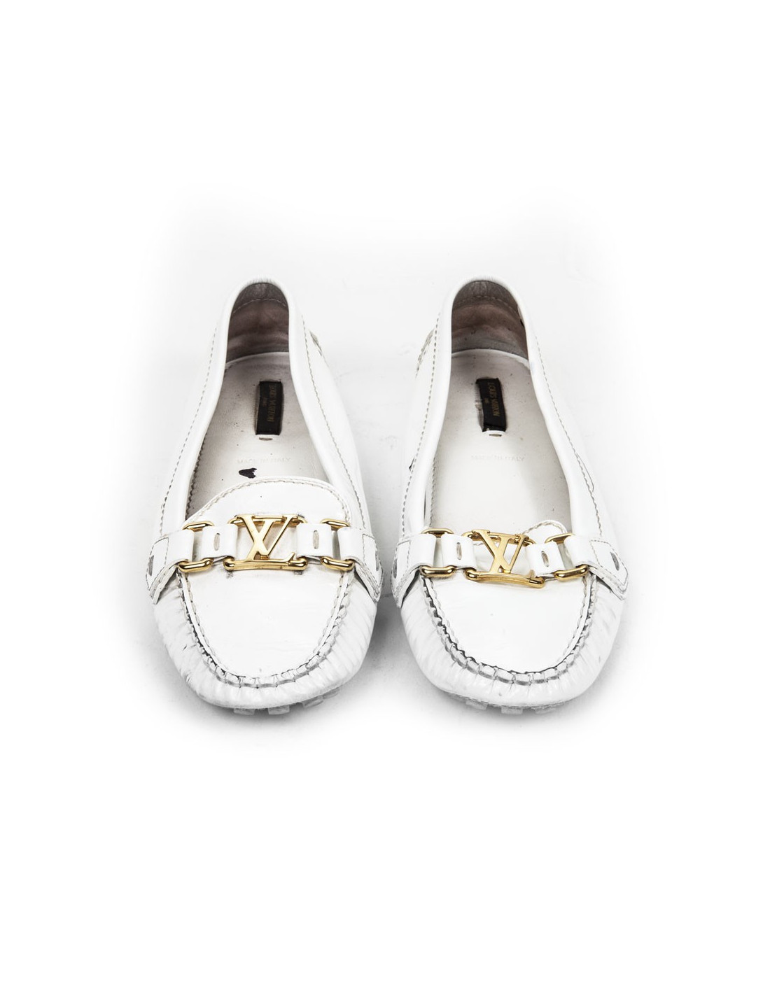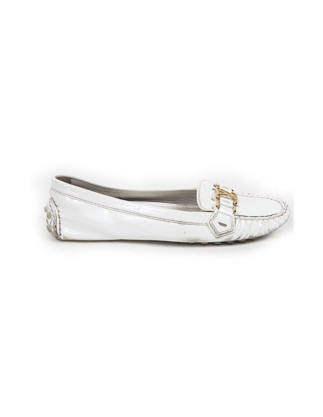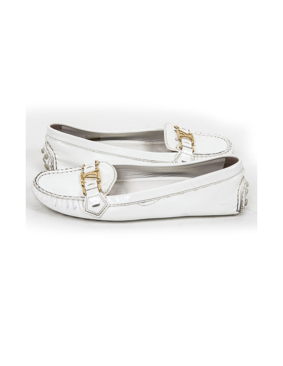 The Maison Louis Vuitton white patent leather loafers. 'LV' jewelry at the front of the shoe is gold metal.