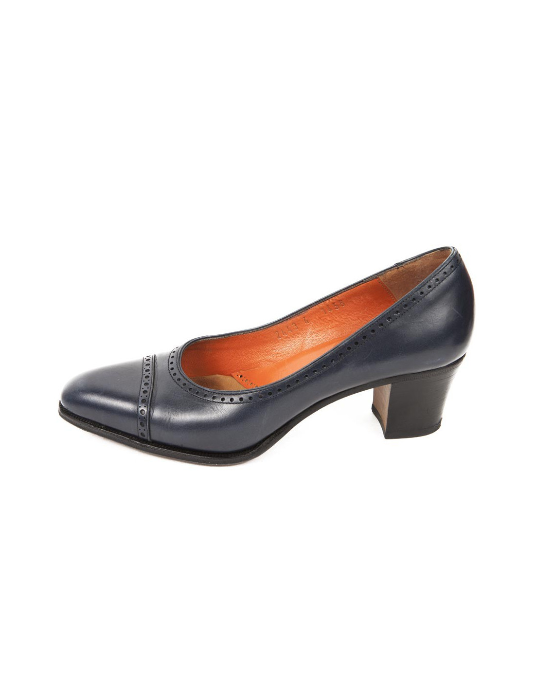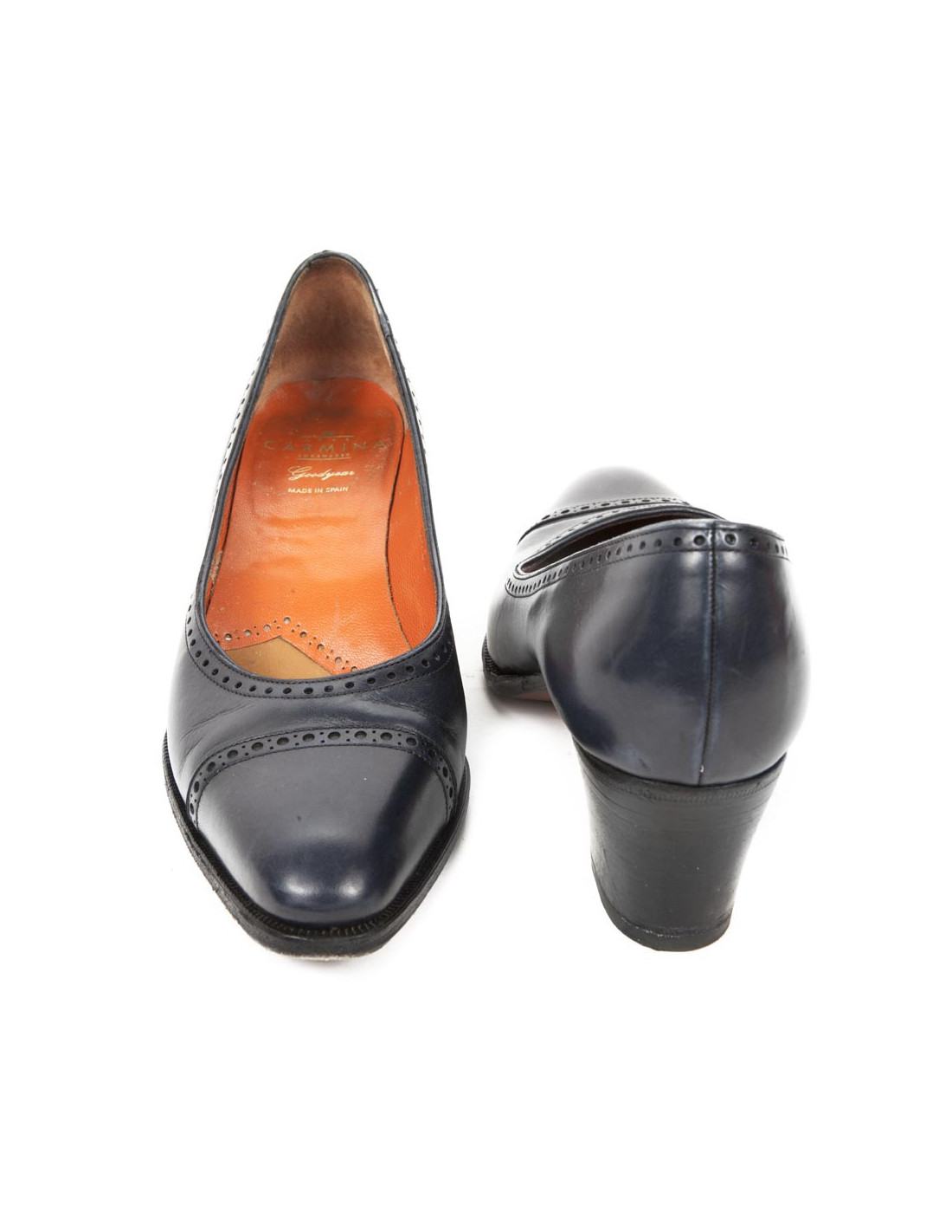 Moccasins with wide, the top 6 cm heel. They are dark blue smooth perforated leather; Brand: CARMIINA.