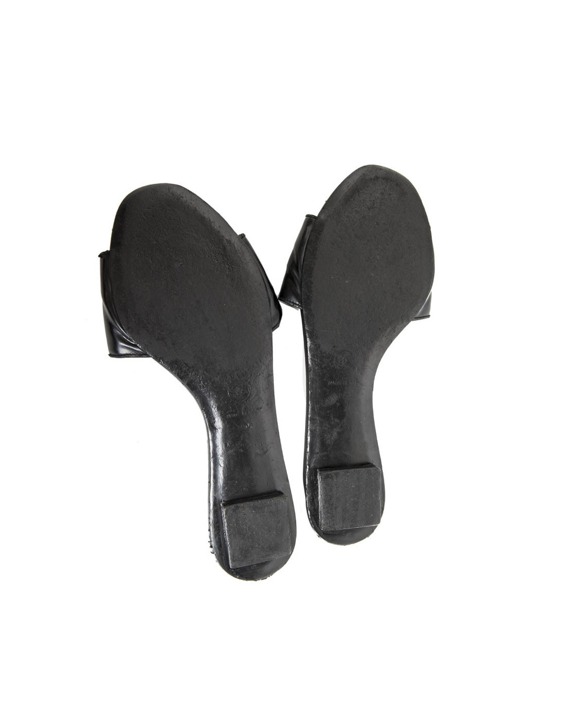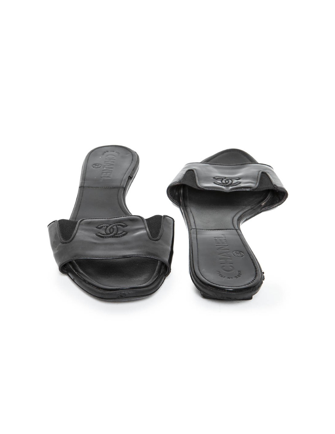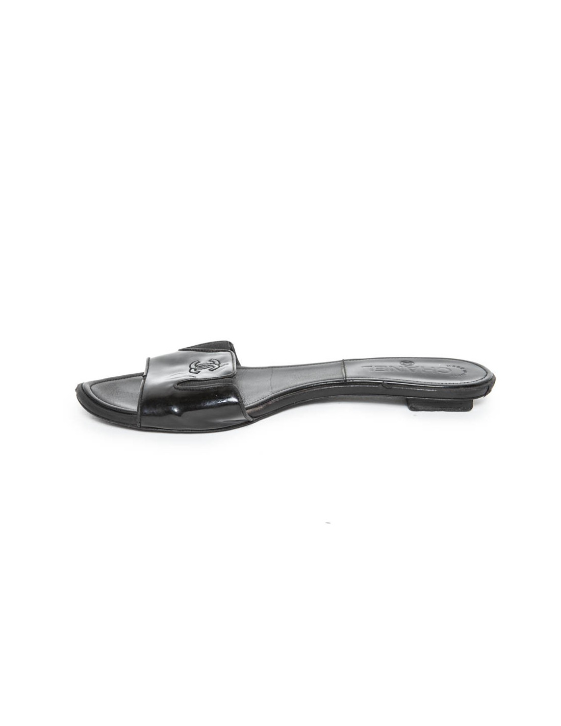 Flat mules CHANEL Black patent leather, registered CC front on leather.