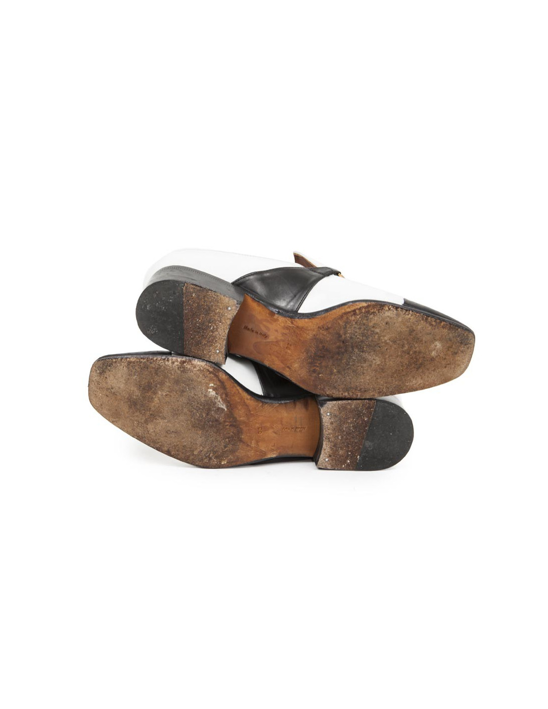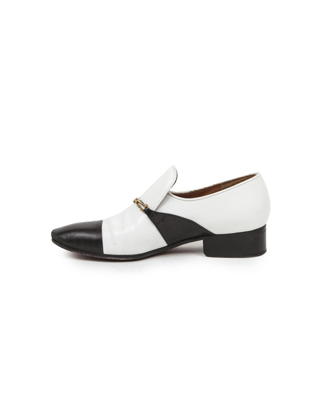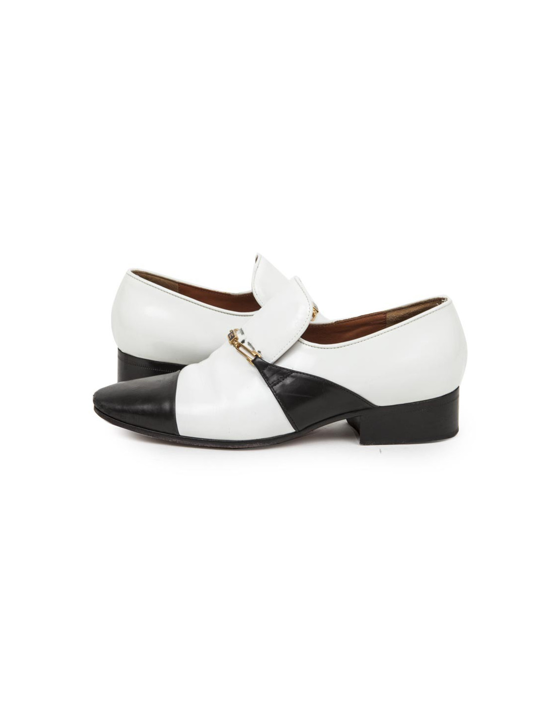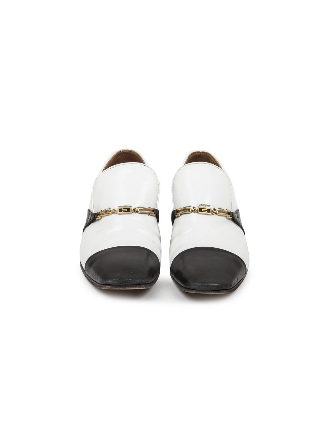CELINE moccasins in bicolor varnished white and black leather with small heels of 3 cm. Golden chain at the front of the shoe.