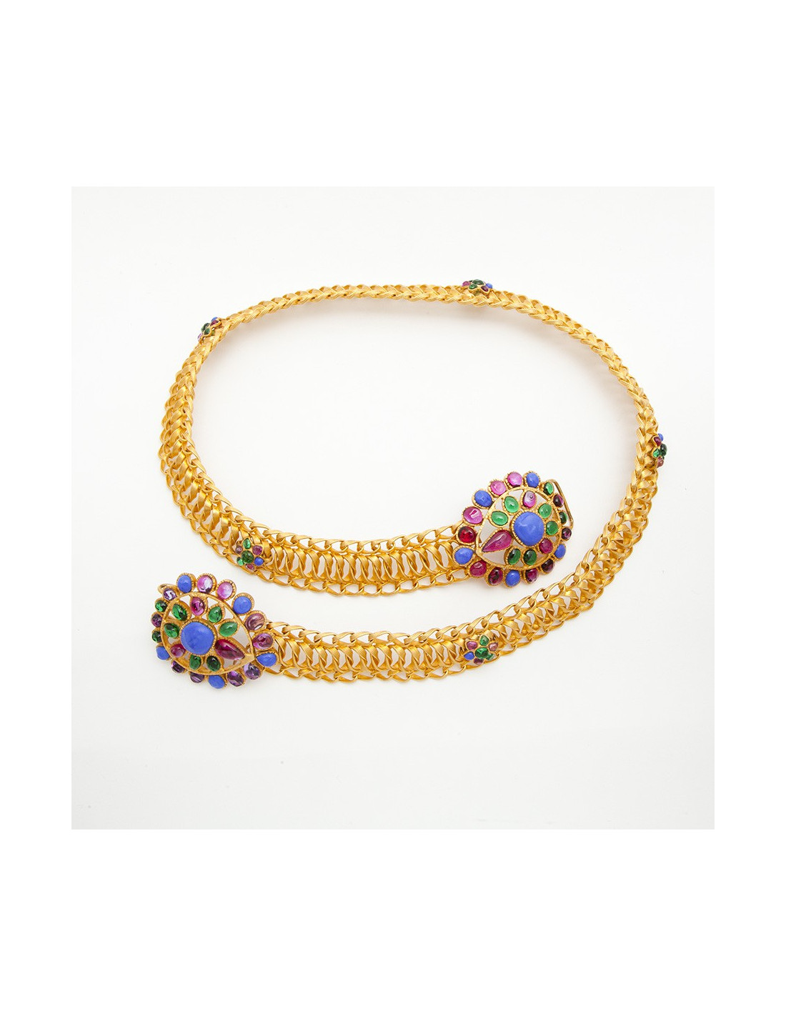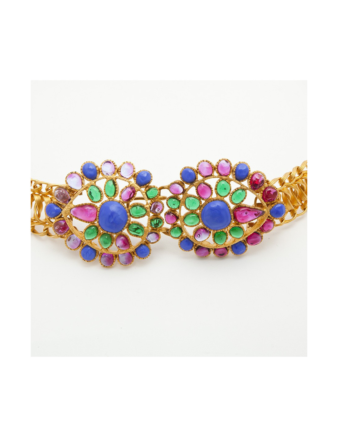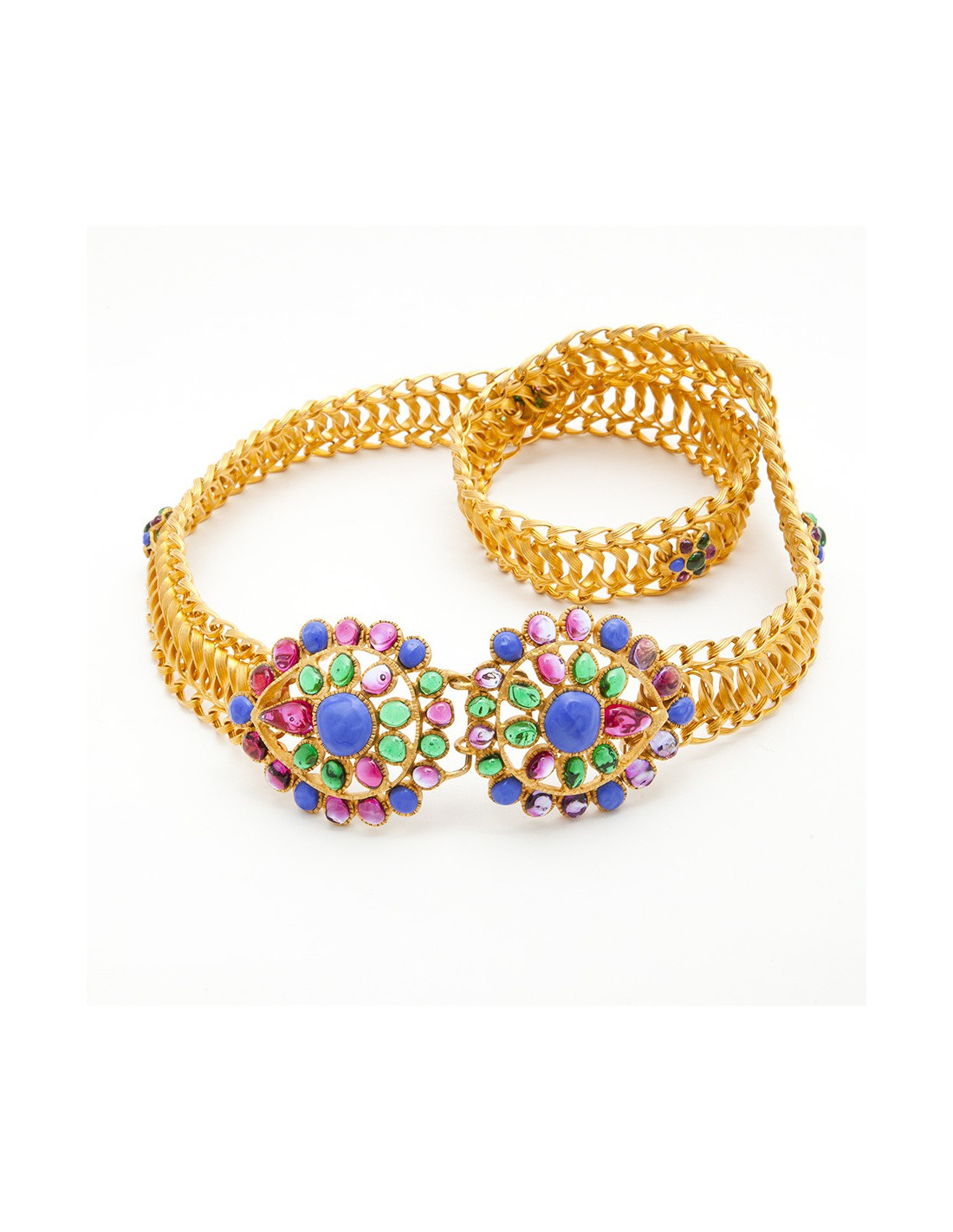Magnificent Métiers d'art Byzantine Couture belt by Maison Gripoix. Vintage piece. Entirely handmade. The cabochons are made of glass paste in emerald, fuchsia and parma colors. The belt links are interlaced and gilded with fine gold. Never worn.