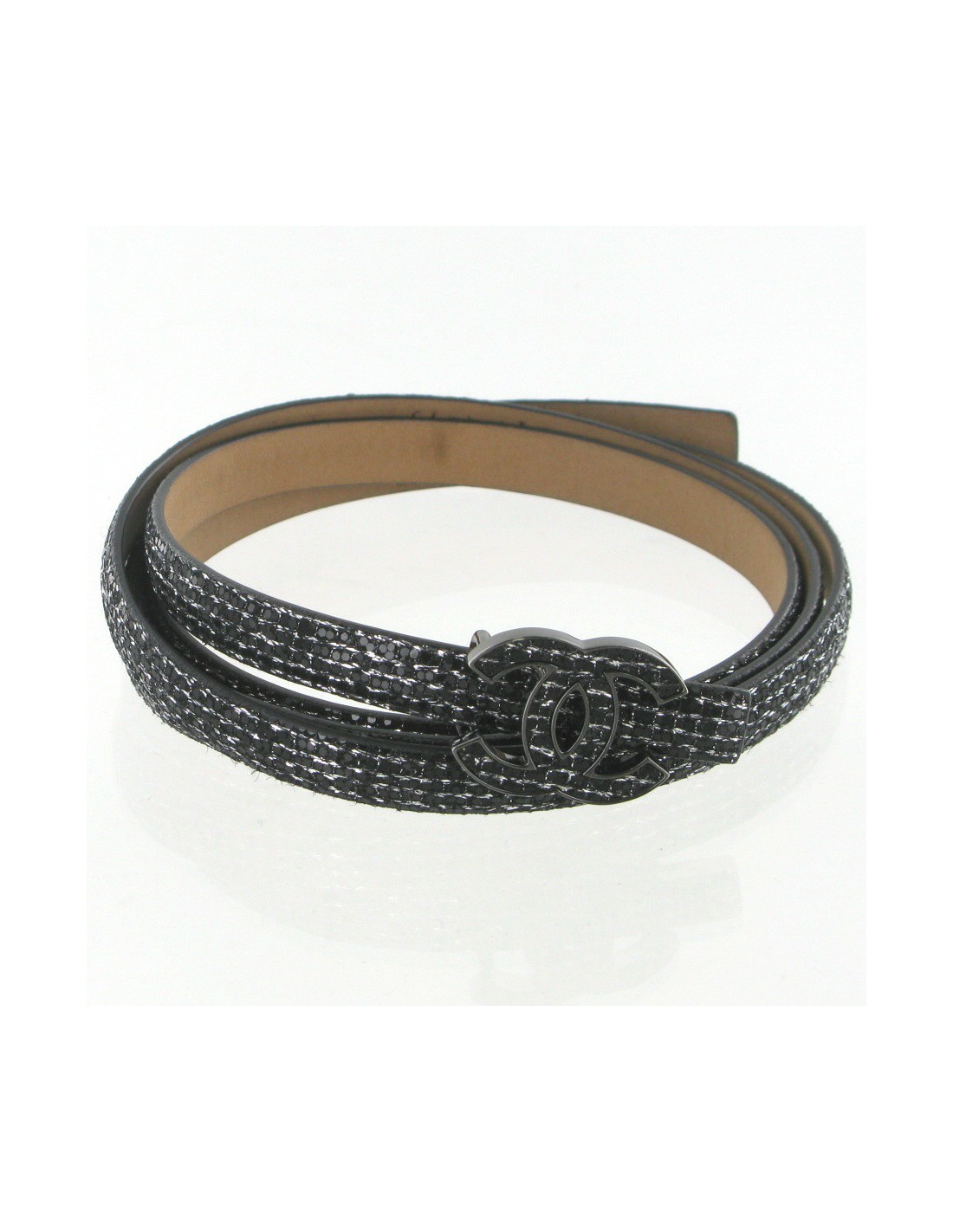 Gorgeous black glitter T95 CHANEL belt. We find the loop signature CC metal ruthenium black glitter and silver son end. The belt is leather in black sequins and silver wire. Current collection.
