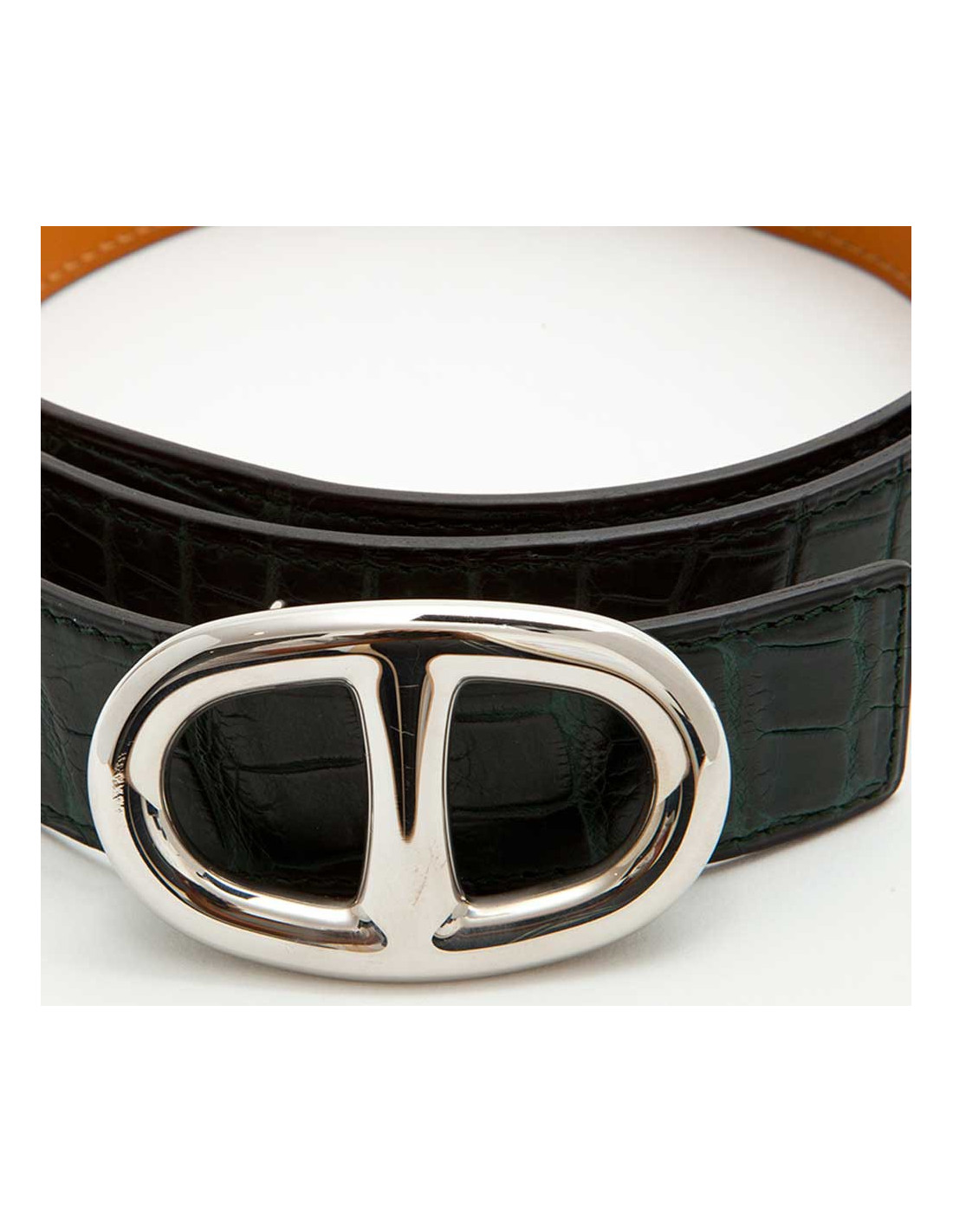 -555.00 € Last items in stock BELTS HERMES man belt in Brown porosus crocodile Size 95 HERMES 20841 2,350.00 € 2,905.00 € Hermes men's belt in brown porosus crocodile, H buckle in brushed palladium silver. Never worn. Small marks on the loop (see photo) Size 95 Dimensions: total length: 107 cm - from the loop to the central hole: 92.5 cm - width: 3.2 cm. H: 6x3.7 cm Belt with three holes, possibility to add. Delivered in a Valois Vintage Paris pouch Add to cart