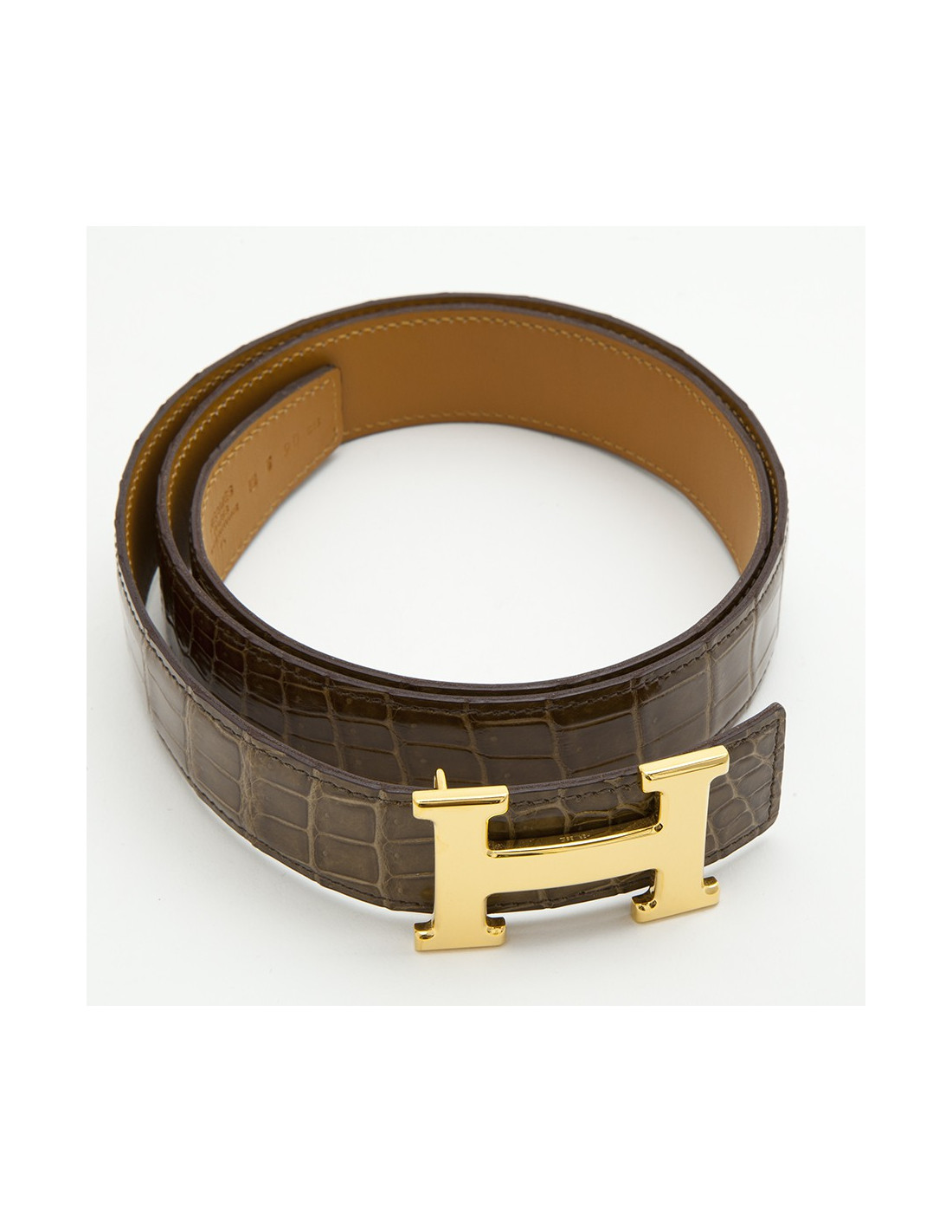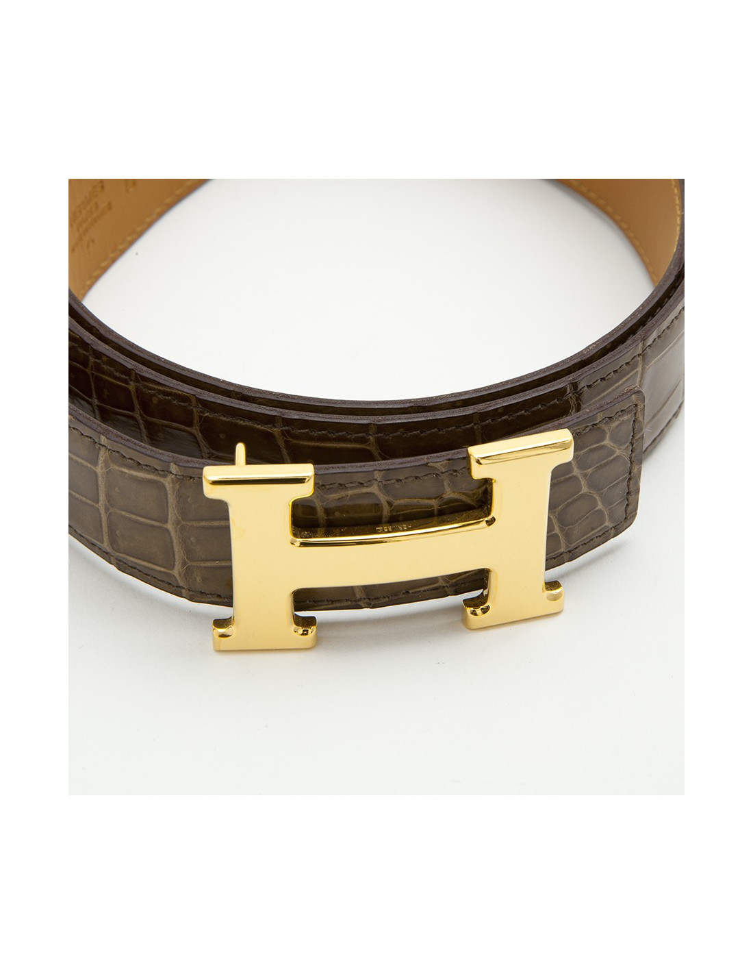-555.00 € Last items in stock BELTS HERMES man belt in Brown porosus crocodile Size 95 HERMES 20841 2,350.00 € 2,905.00 € Hermes men's belt in brown porosus crocodile, H buckle in brushed palladium silver. Never worn. Small marks on the loop (see photo) Size 95 Dimensions: total length: 107 cm - from the loop to the central hole: 92.5 cm - width: 3.2 cm. H: 6x3.7 cm Belt with three holes, possibility to add. Delivered in a Valois Vintage Paris pouch Add to cart