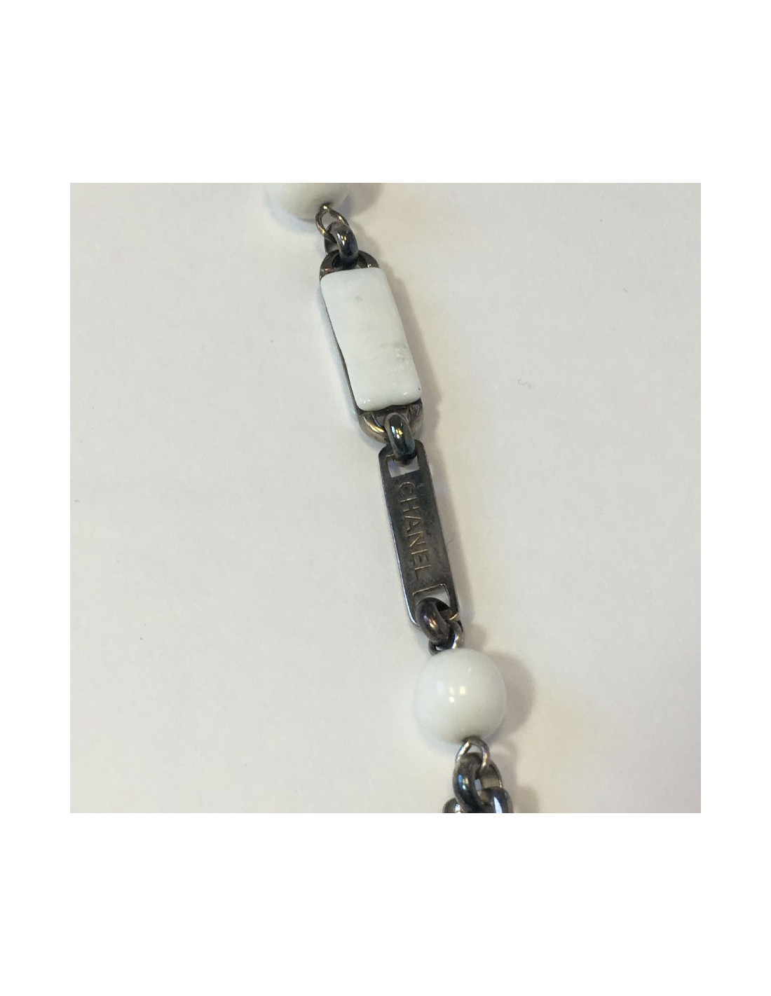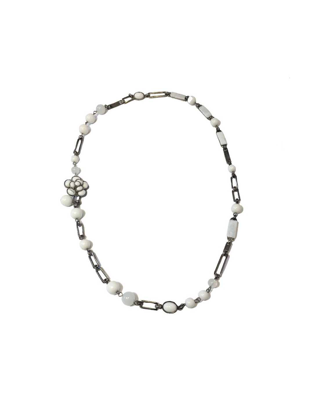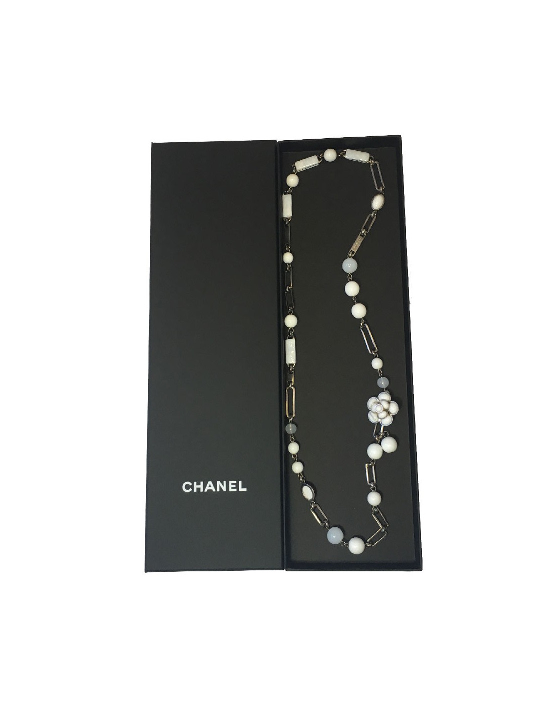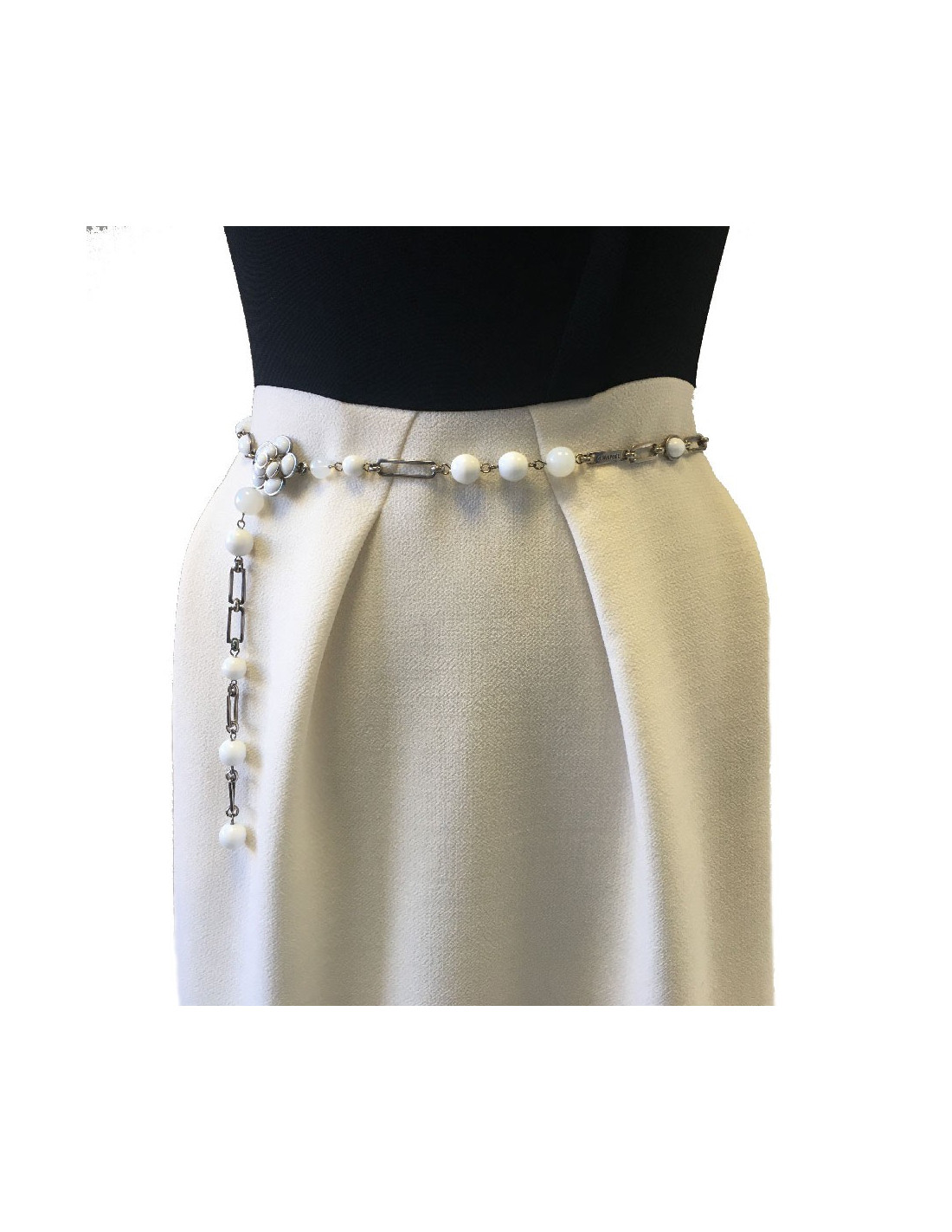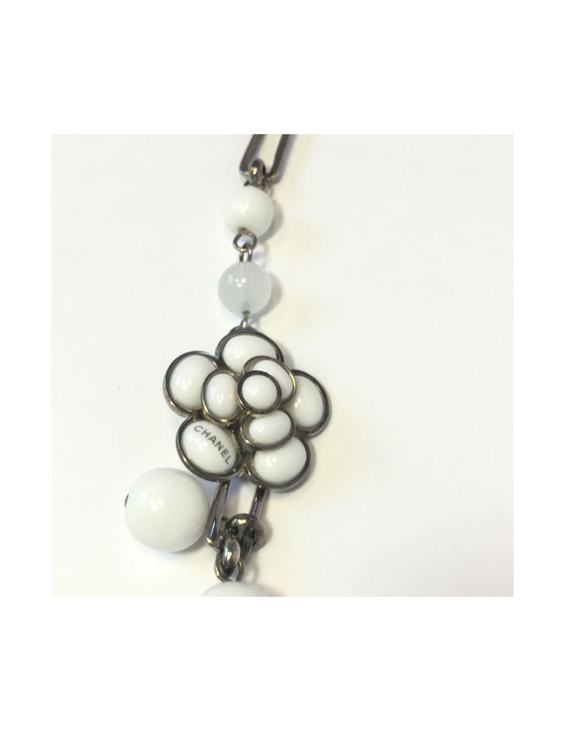 Very beautiful Chanel necklace-belt in white and transparent molten glass. Silver metal chain. Camellia hook clasp in molten glass.