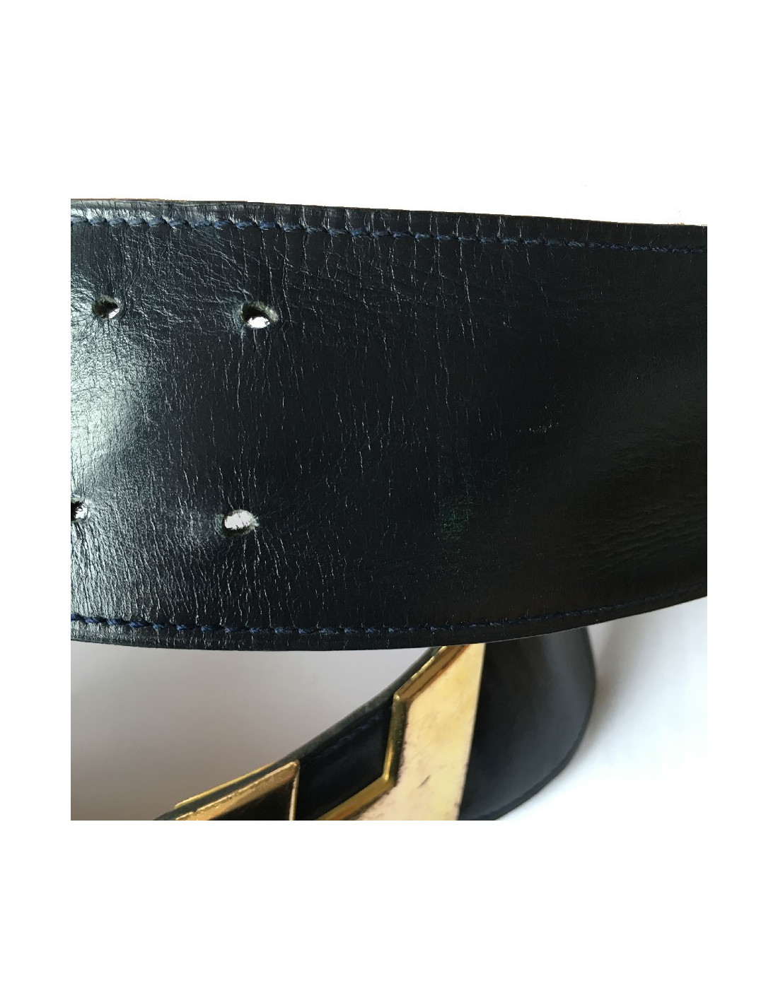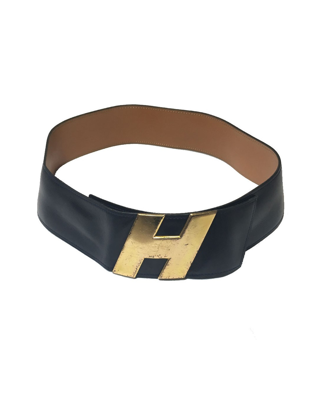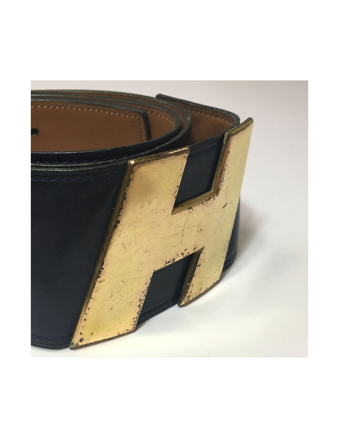 Hermès vintage belt in navy leather, gold leather interior. Hardware H in gilded metal. Hook clasp.