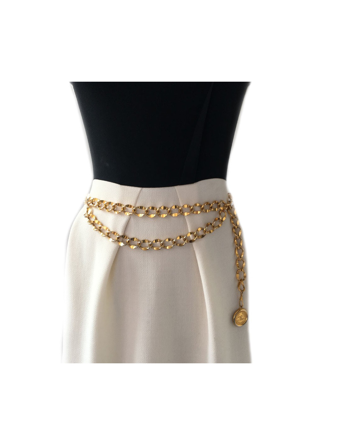 Last items in stock BELTS CHANEL COCO bottle chains belt CHANEL 32682 2,200.00 € CHANEL vintage collector belt Condition : good Made in FranceGender : womanMaterial : metalColors : gold (has darkened with age)Measurements : length 75 cm, width 2 cm, chain 13 cm, pendant 2,5 x 4 cmStamp : yesYear: circa ‘80Details : vintage, Chanel logo engraved on the clasp, "Coco Chanel" pendant in the shape of a perfume bottle. Collector's item. Add to cart