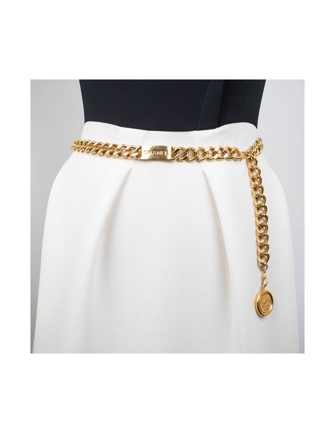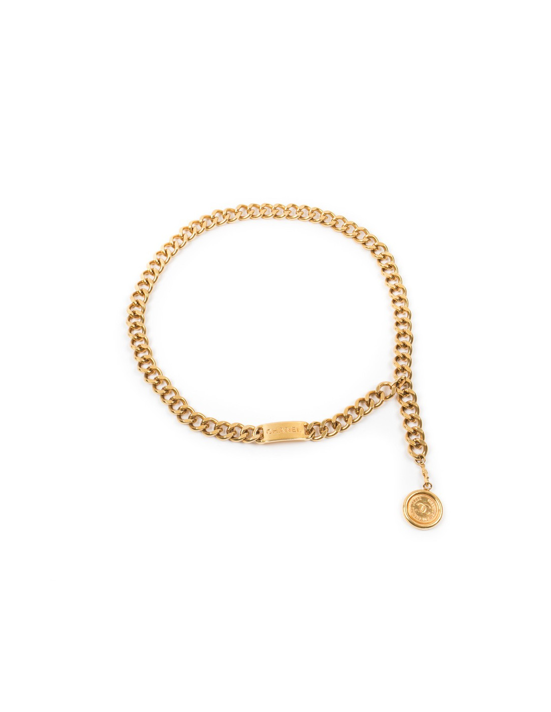 Vintage Chanel belt in gilt metal chain, plaque with Chanel inscription and medal.