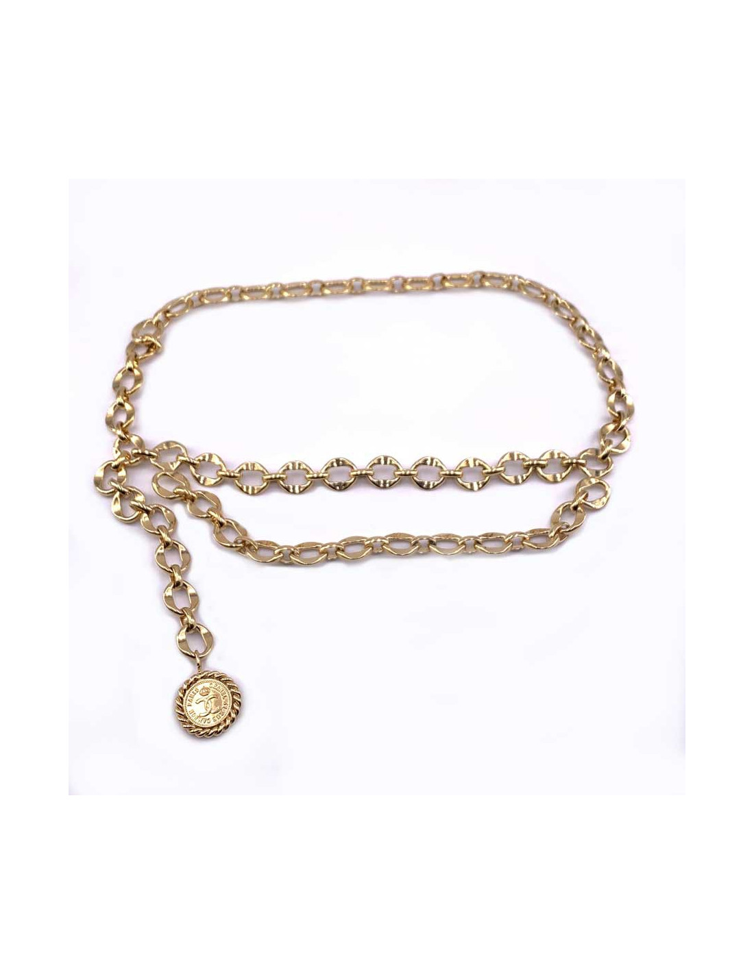 -250.00 € Last items in stock BELTS CHANEL vintage gilded quilted chain belt CHANEL 31956 1,250.00 € 1,500.00 € CHANEL vintage gilded hammered chain belt Condition : very goodMade in FranceMaterial: metalColor : goldMeasurements : 85 cmHardware : gold finish metalStamp : yesVintage prior to 1990 Add to cart