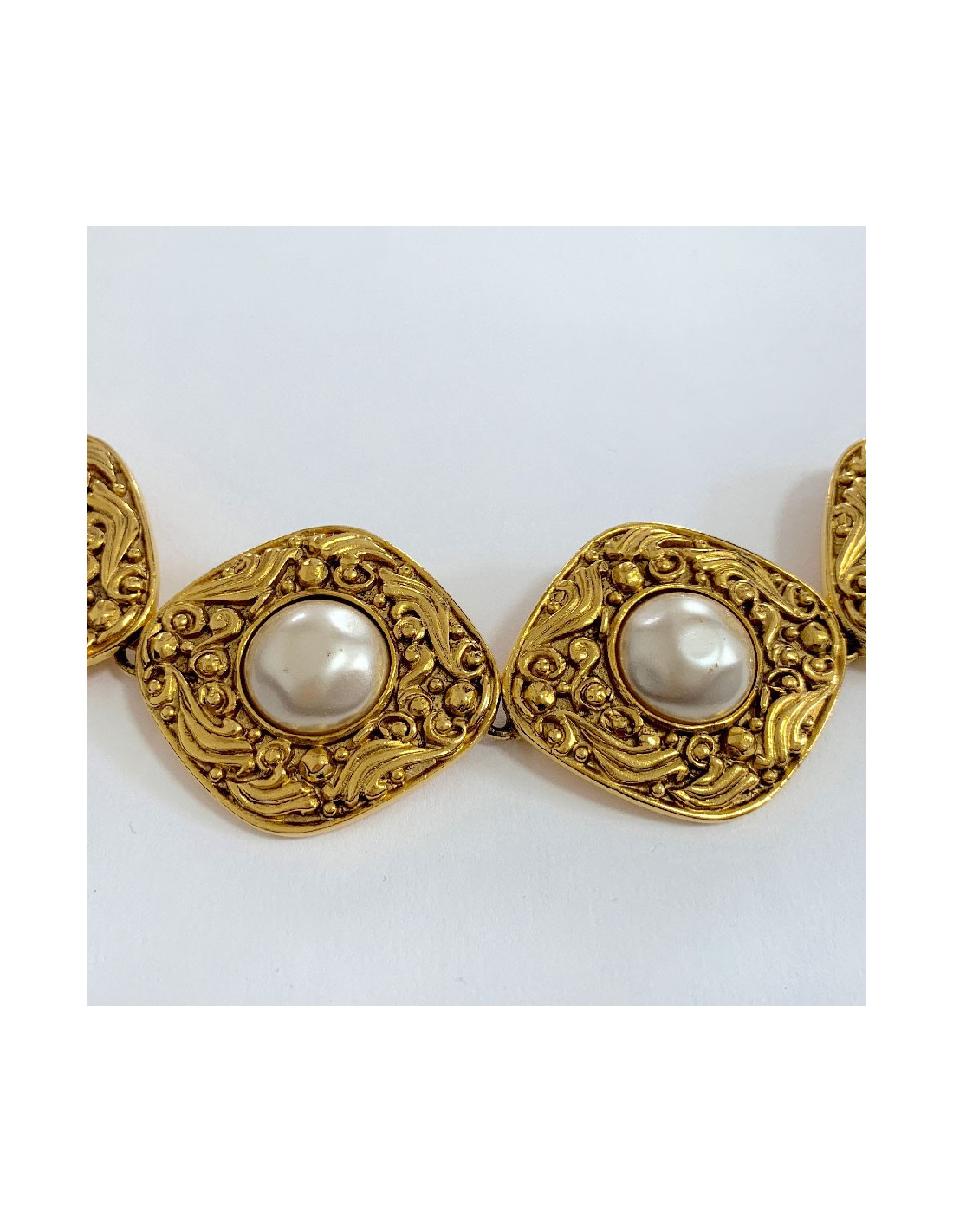 Made in the 80's. The gilded metal is worked and in very good condition. The pearls are quite large. Some have slightly chipped mother-of-pearl (see photo).