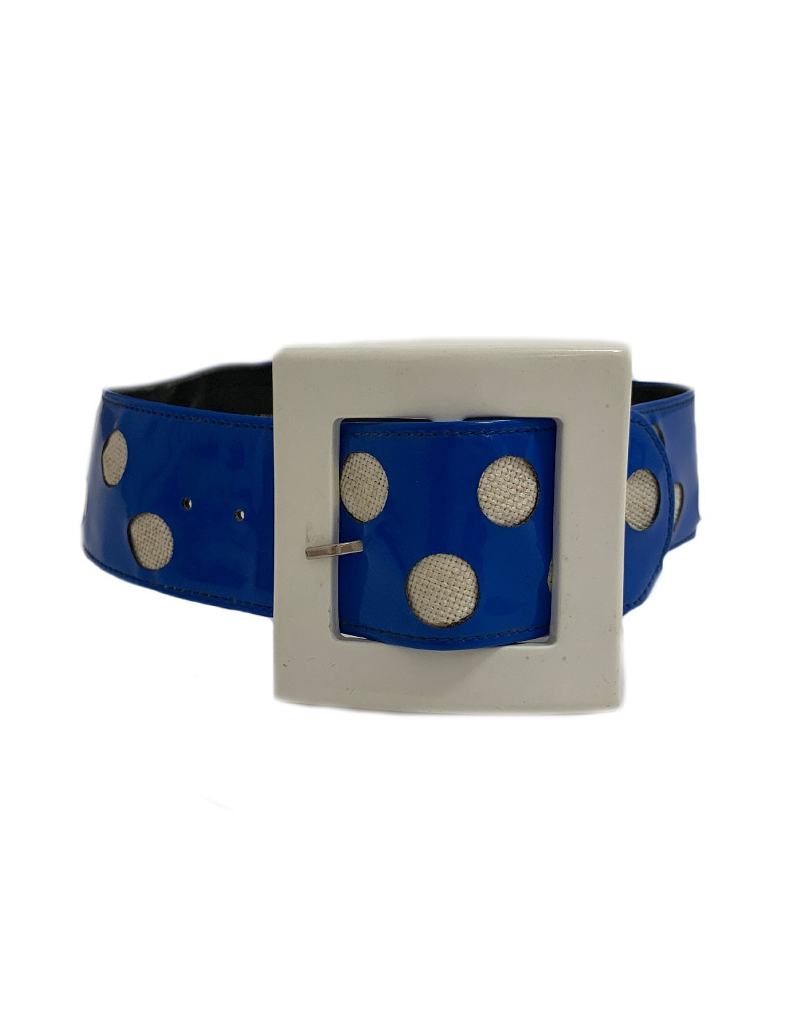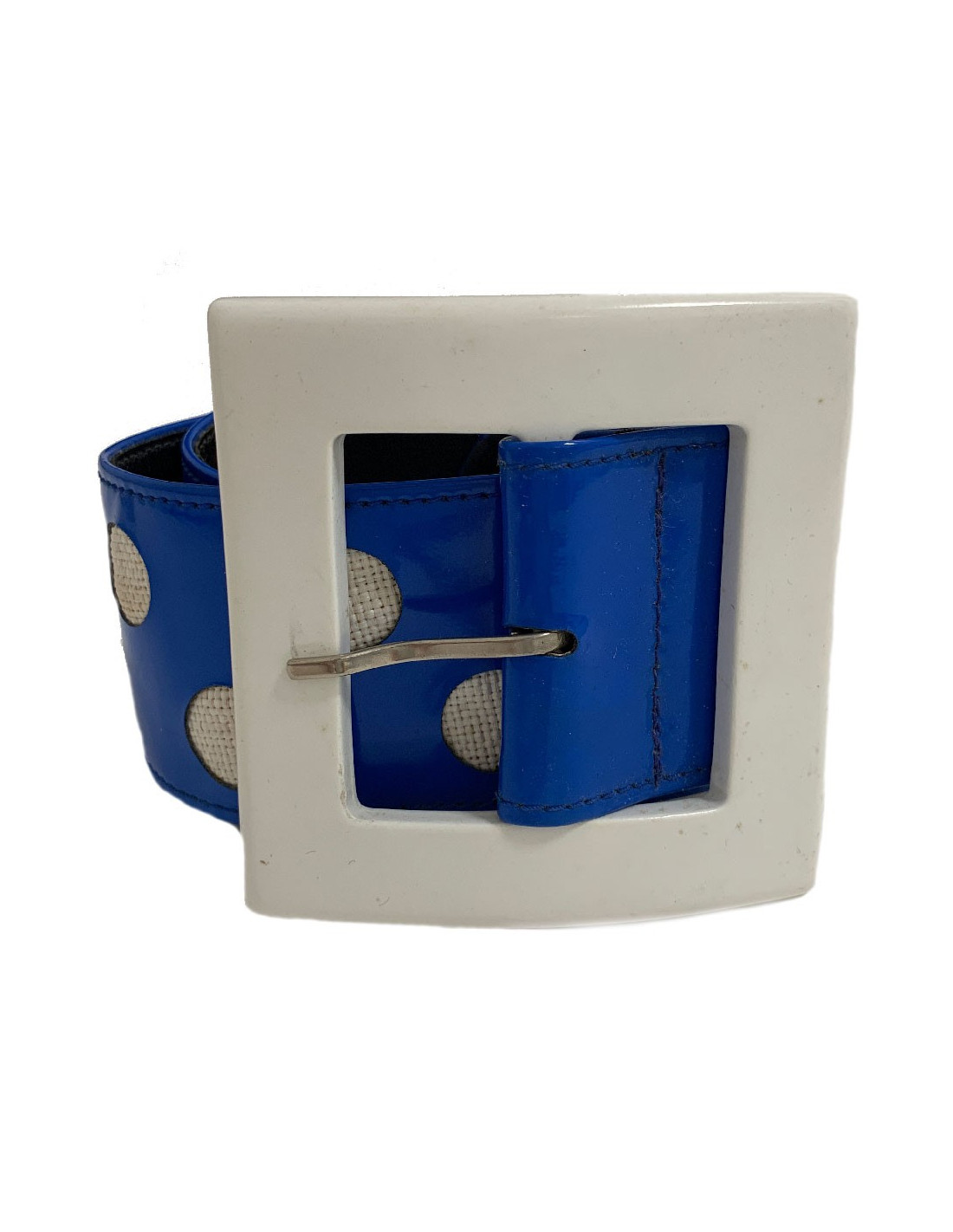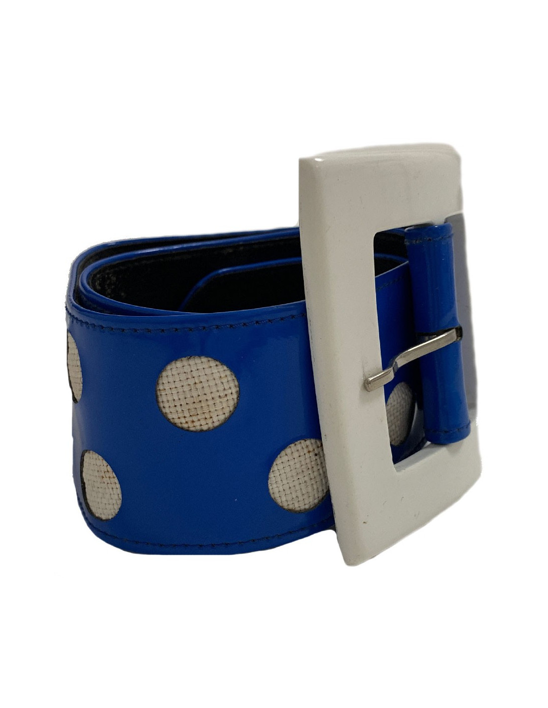 Very 70's! Vintage belt by Maison Jean Louis Scherrer in blue vinyl and white plastic.