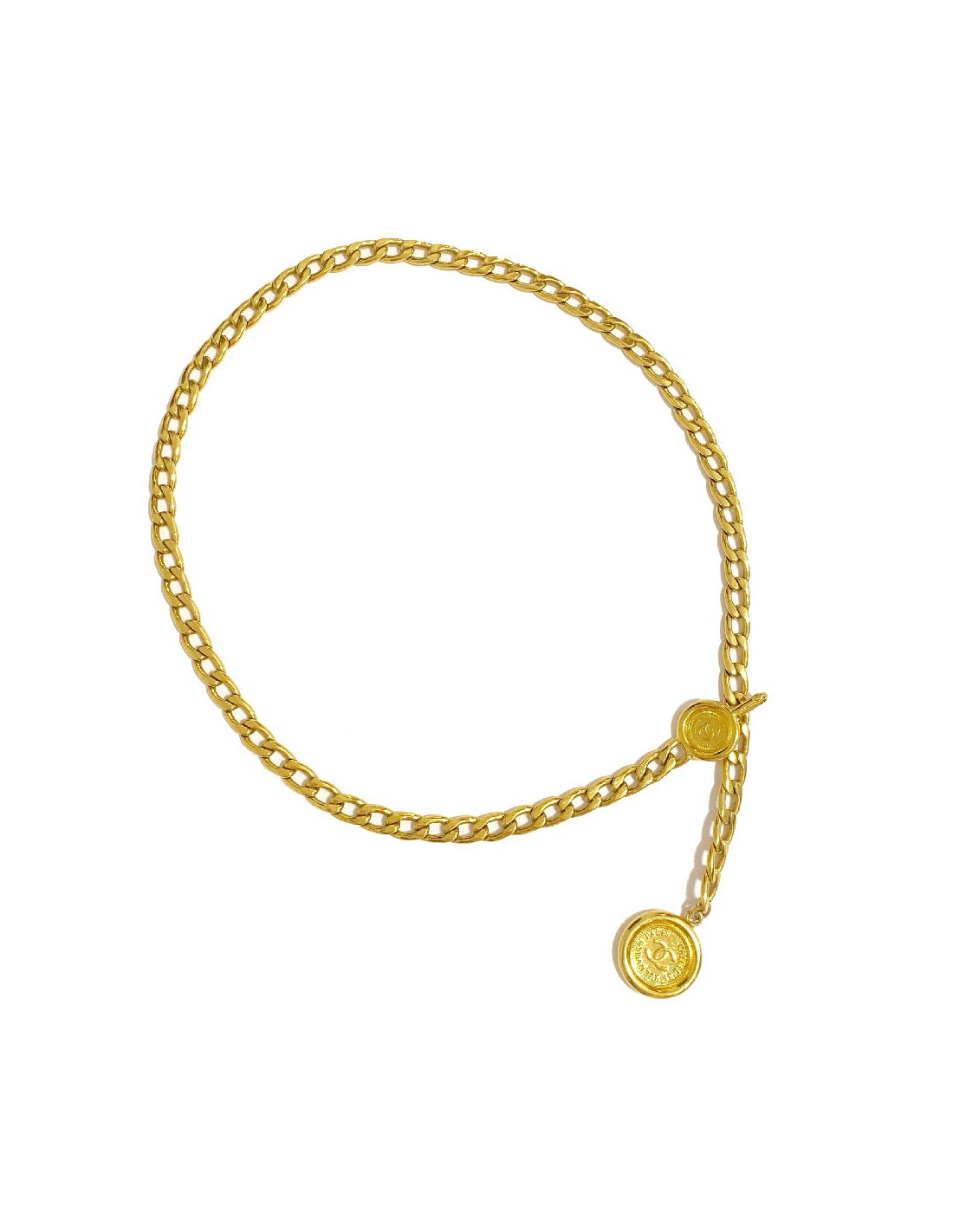Last items in stock BELTS CHANEL COCO bottle chains belt CHANEL 32682 2,200.00 € CHANEL vintage collector belt Condition : good Made in FranceGender : womanMaterial : metalColors : gold (has darkened with age)Measurements : length 75 cm, width 2 cm, chain 13 cm, pendant 2,5 x 4 cmStamp : yesYear: circa ‘80Details : vintage, Chanel logo engraved on the clasp, "Coco Chanel" pendant in the shape of a perfume bottle. Collector's item. Add to cart