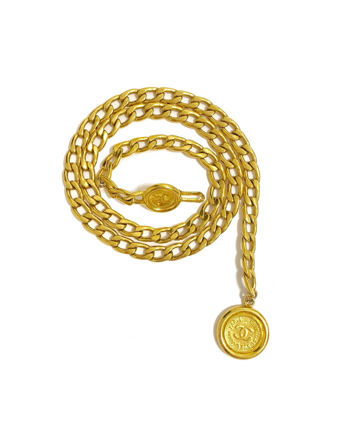 Last items in stock BELTS CHANEL Vintage couture belt CHANEL 32692 1,250.00 € CHANEL Vintage couture belt Condition : goodMade in FranceGender : womanMaterials : metal, resinColors : gold, light pinkMeasurements : length 69 cm, width 1,5 cm, chain 9 cm, pendant diameter 2,5 cmStamp : noyear : 80'sDetail : Couture collection, small round pendant in pink resin with lion's head, metal clasp slightly oxidized Add to cart