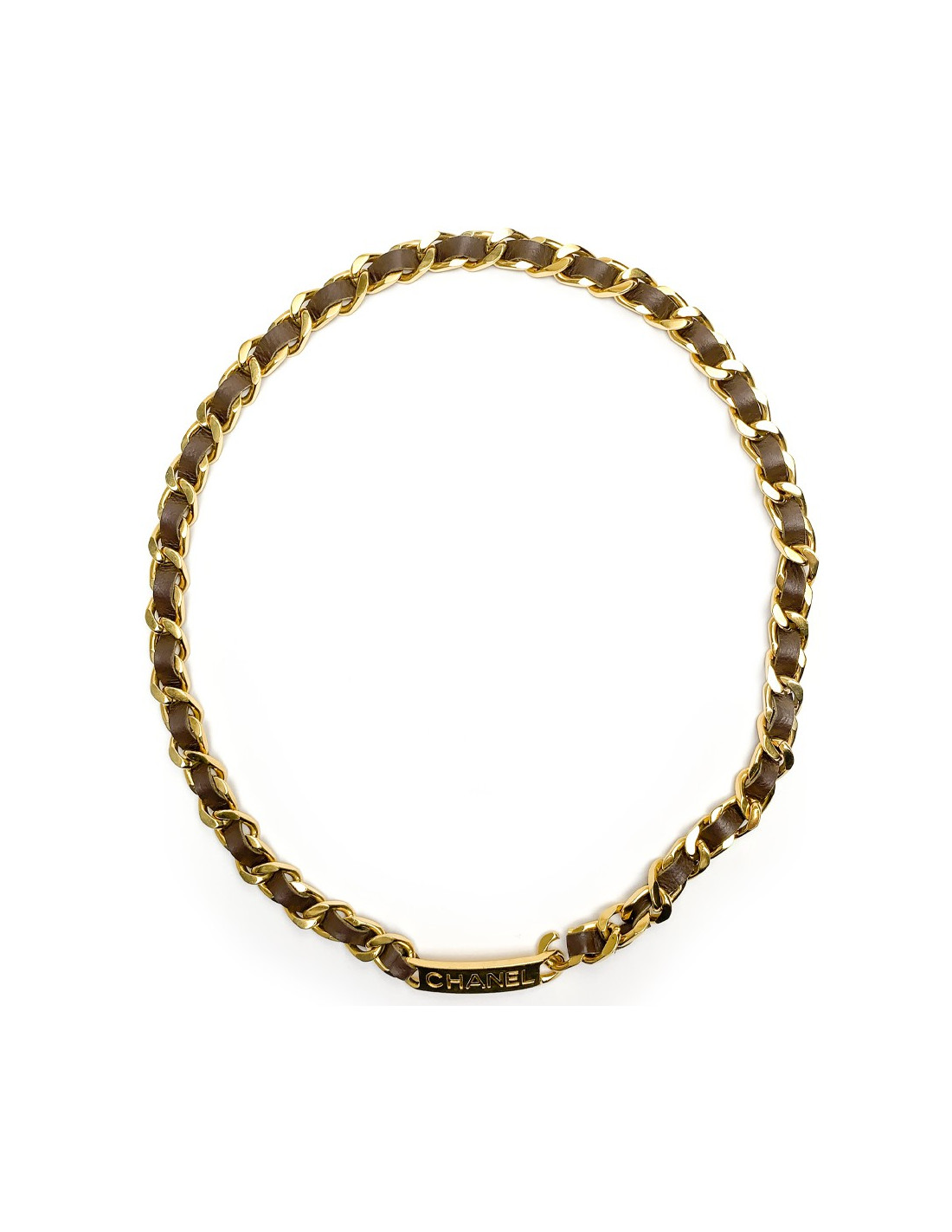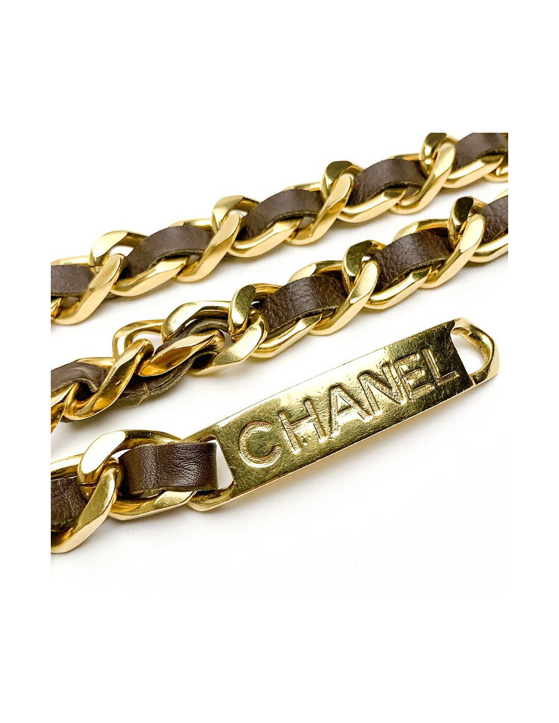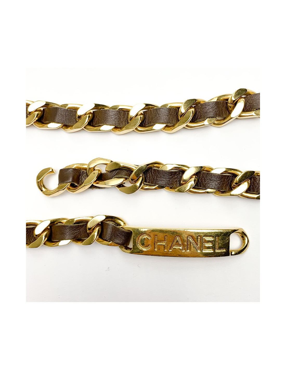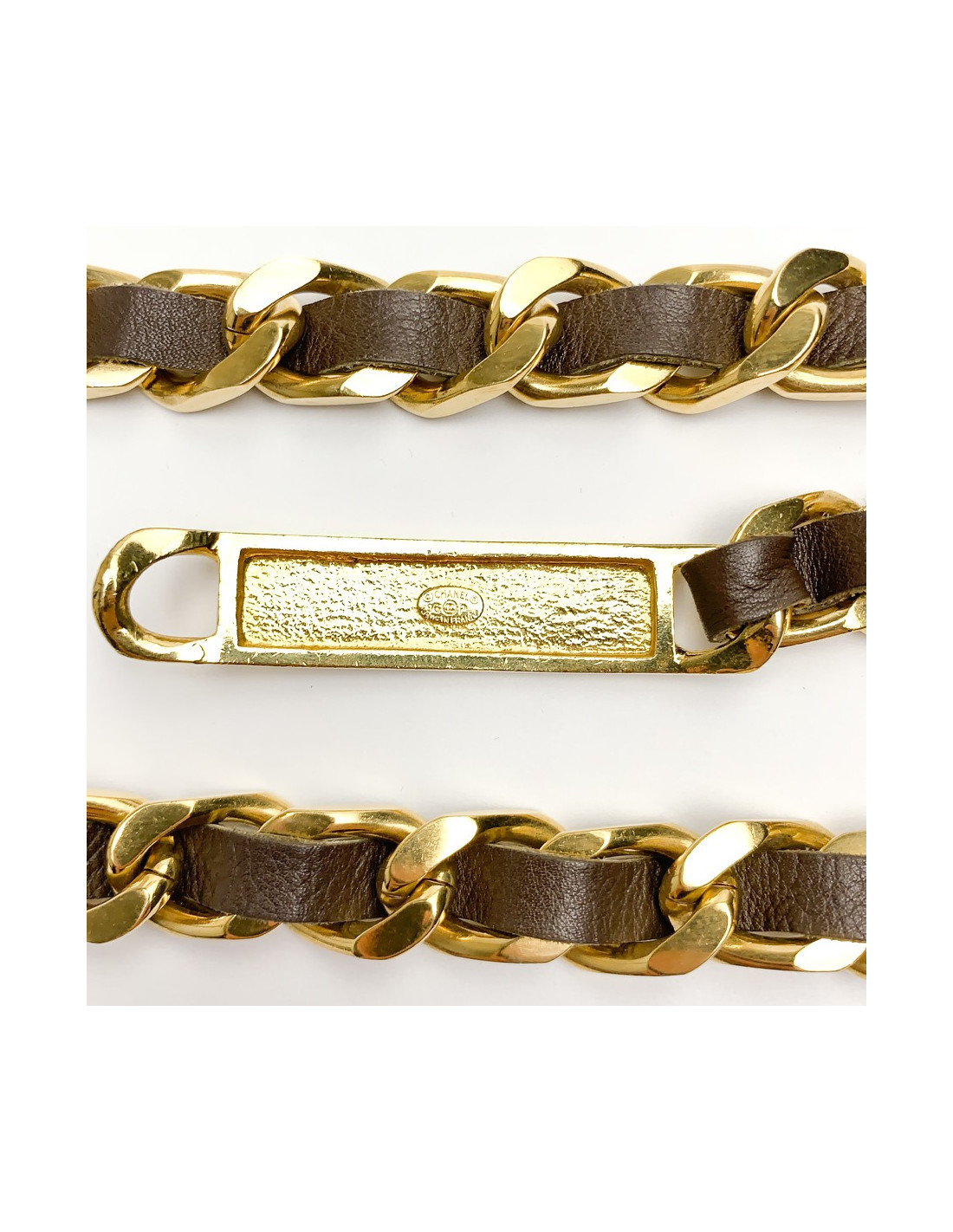 The belt is from the House of Chanel. It represents a metal chain gilded with fine gold interlaced with brown leather. On the central gilded plate is engraved "Chanel".
