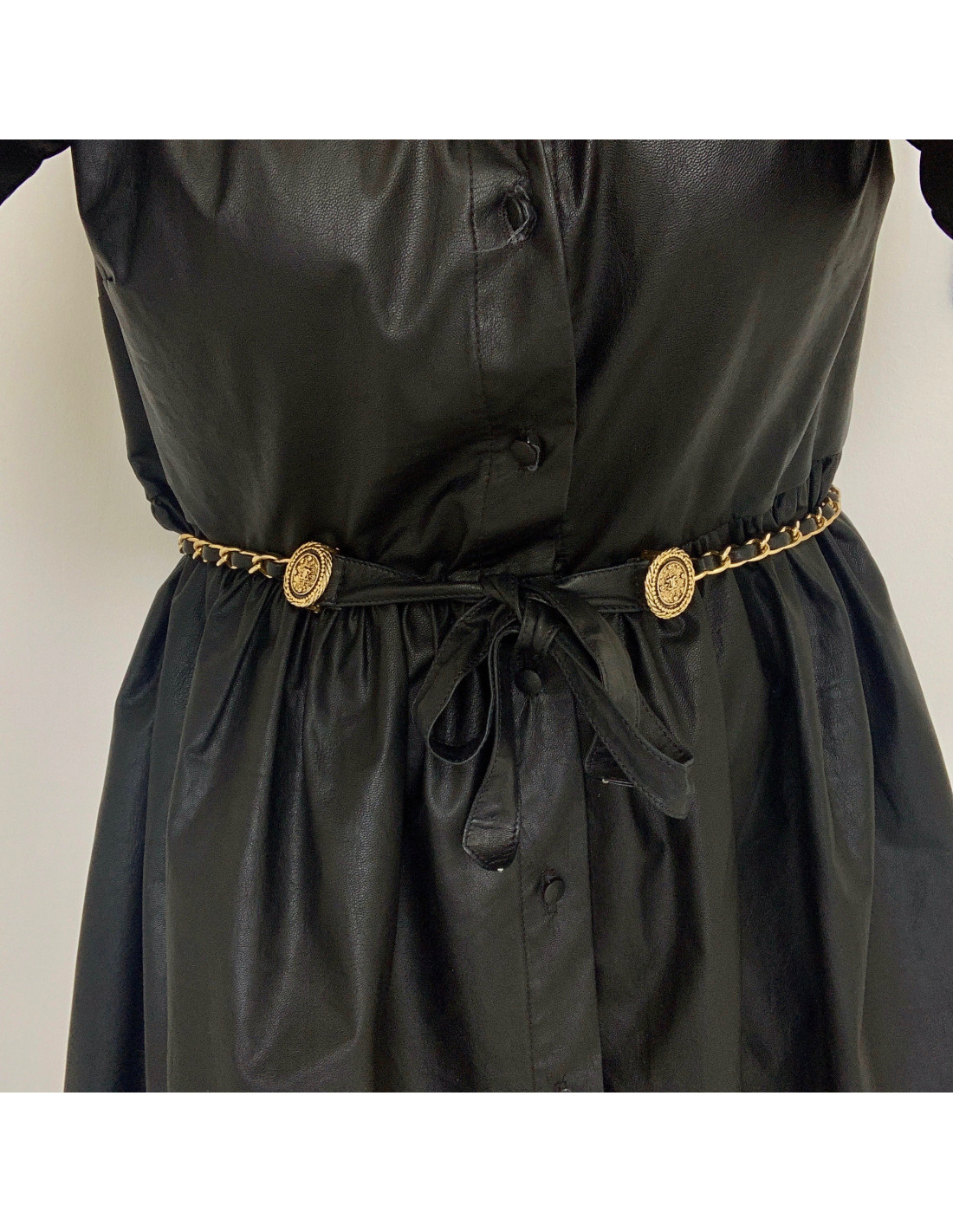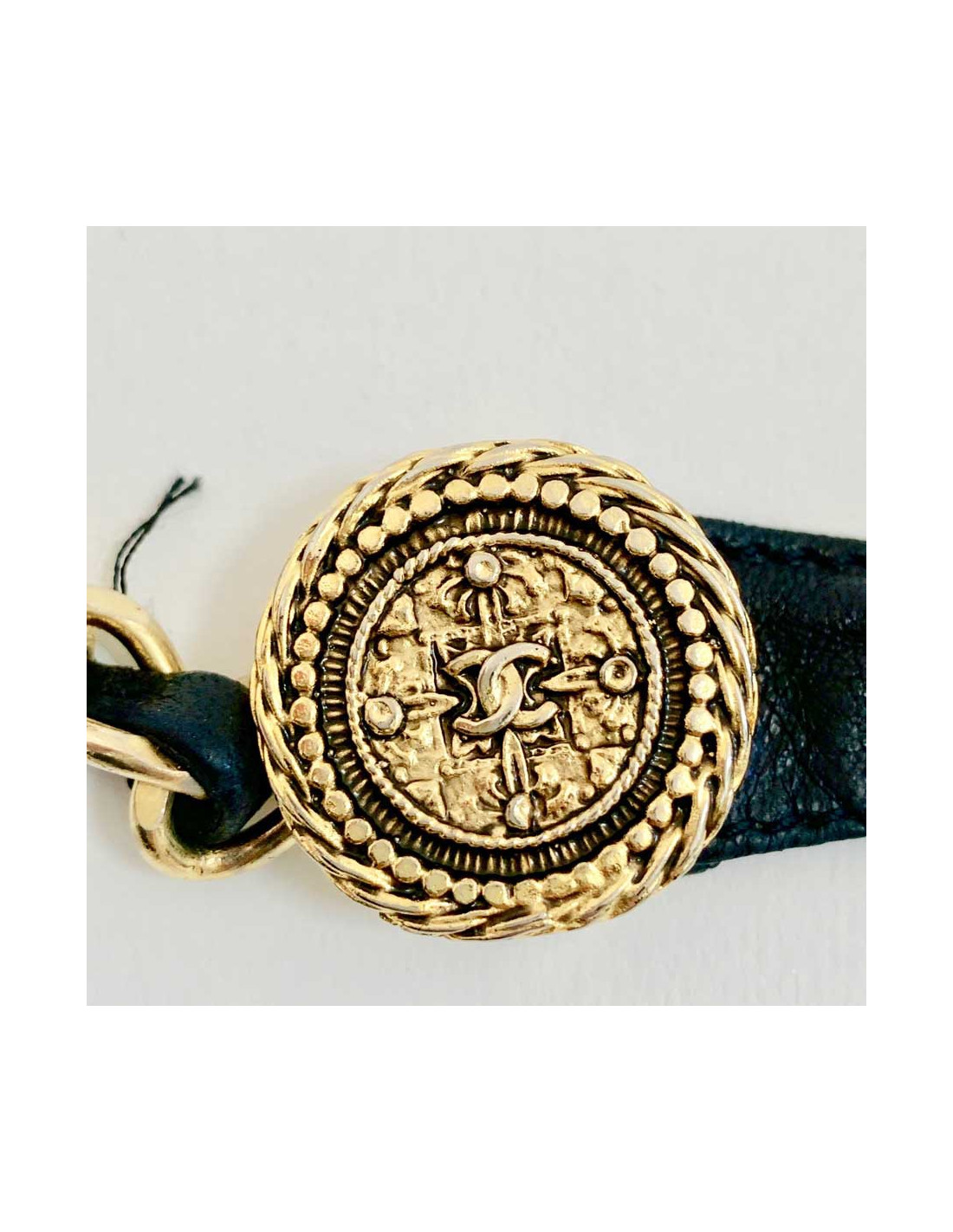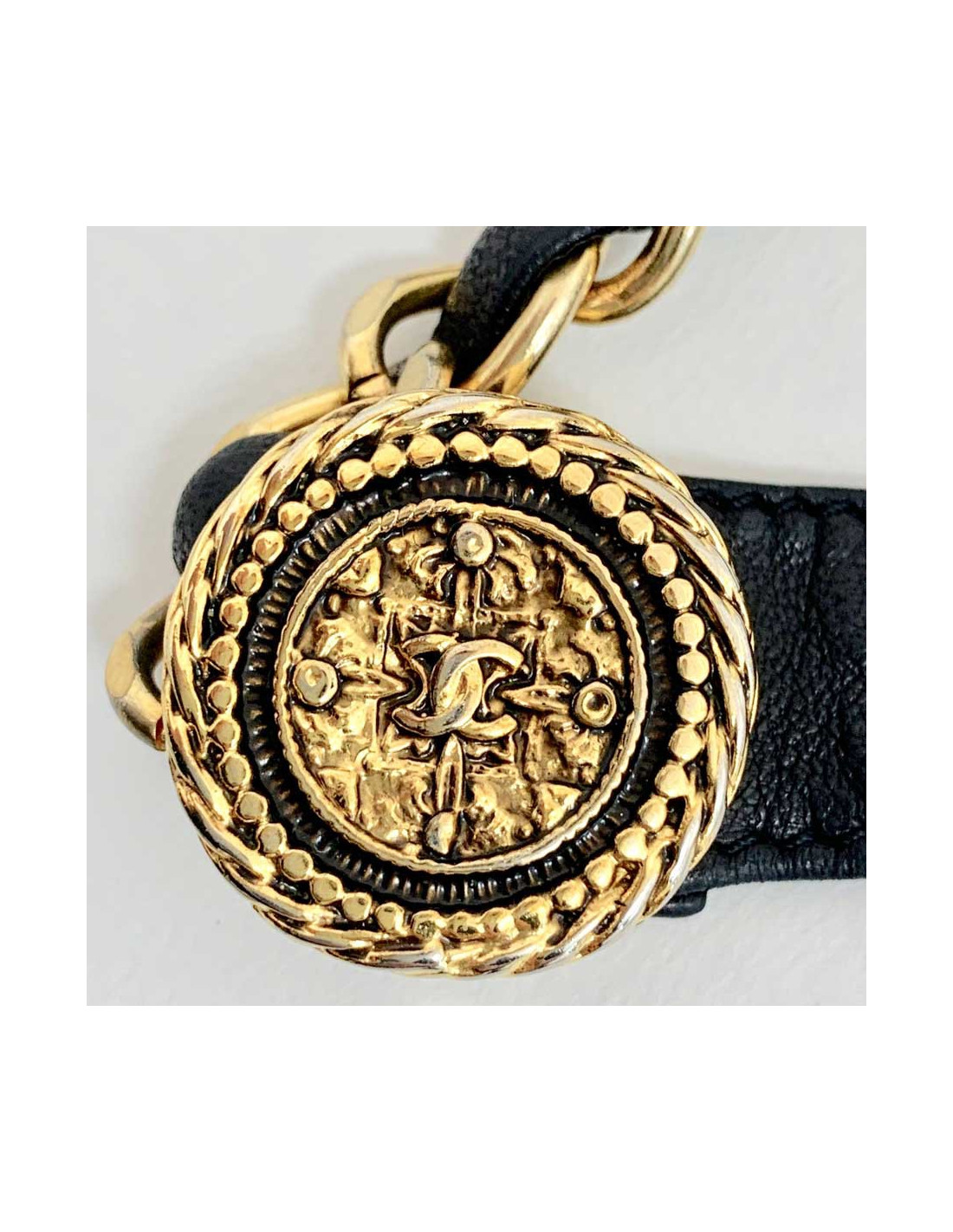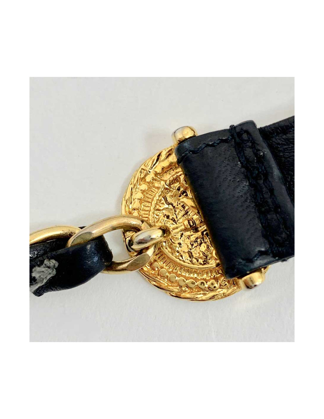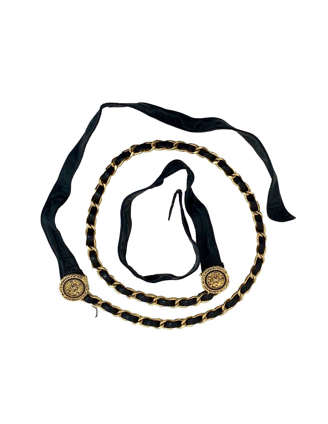 Sold BELTS CHANEL chain and leather belt CHANEL 31891 1,100.00 € CHANEL chain and leather belt Condition : very goodMade in FranceMaterials: leather, metalColors : black, goldMeasurements : 75 cmVintage Details: the leather part has been replaced. View