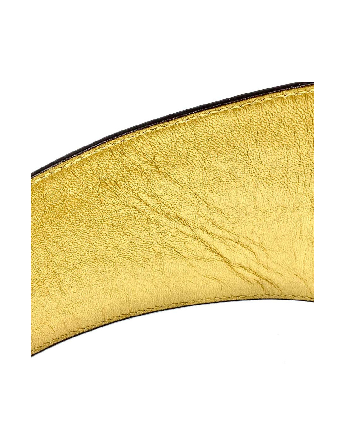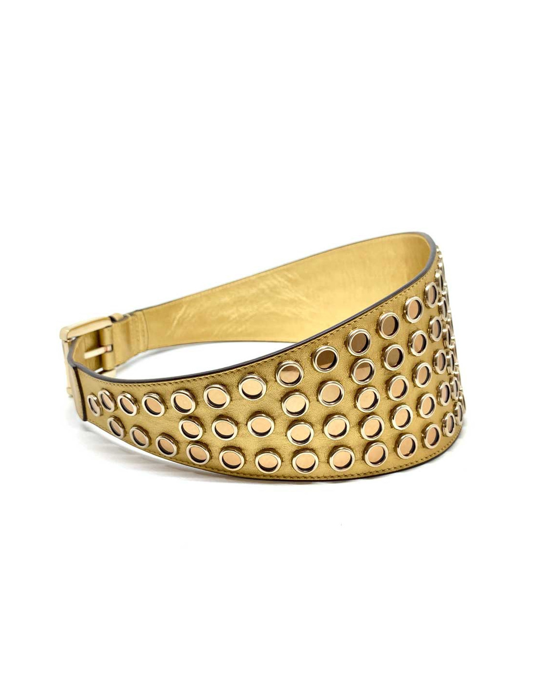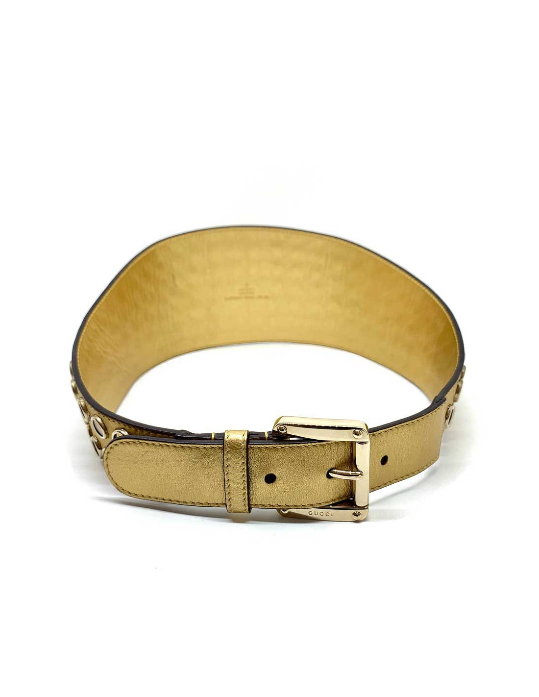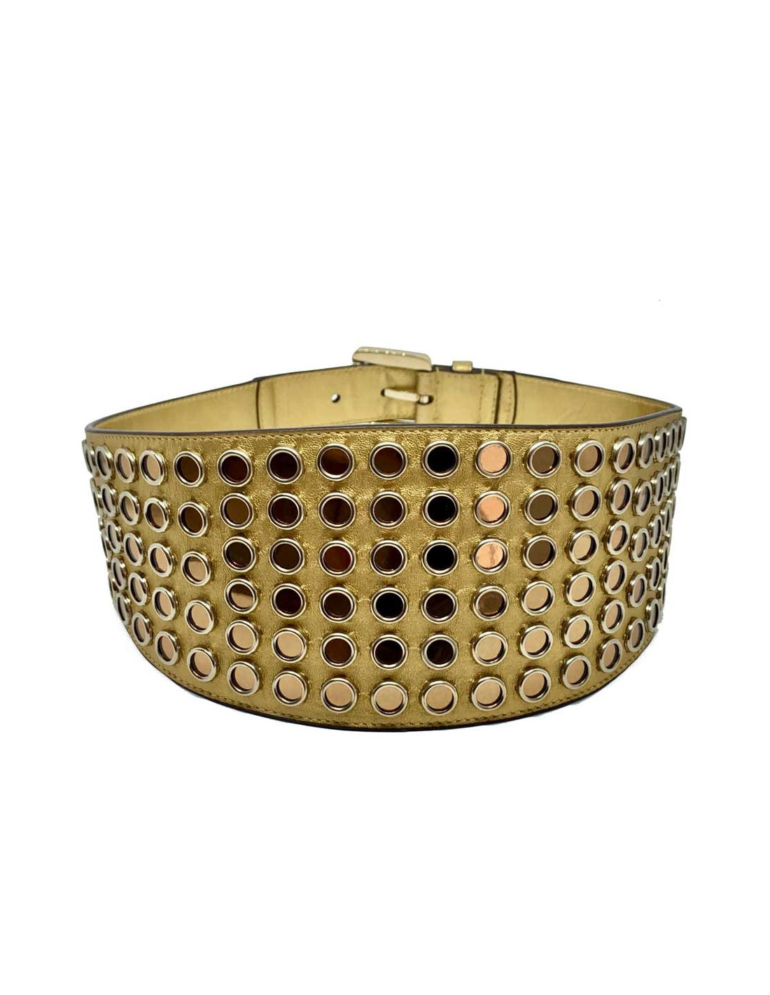 Wide belt of the Gucci House. The belt is made of gold-colored leather. It is set with a multitude of small circles with a mirror effect that gives it a sophisticated look.