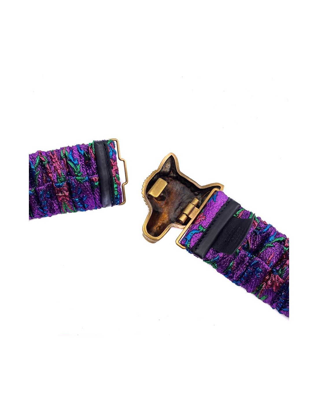 Last items in stock BELTS CHANEL Couture molten glass belt CHANEL 32686 2,570.00 € CHANEL Couture handmade belt Condition : very goodMade in FranceGender : womanMaterials : metal mesh, molten glassColors : gold, amethyst, emeraldSize: 75FRMeasurements : total length 75 cm (non-adjustable) x height 5 cm, molten glass brooch : 5 x 5 cmStamp : yesYear : 1996Hardware : gold finish metalDetails : hook clasp, large two-tone molten glass... Add to cart