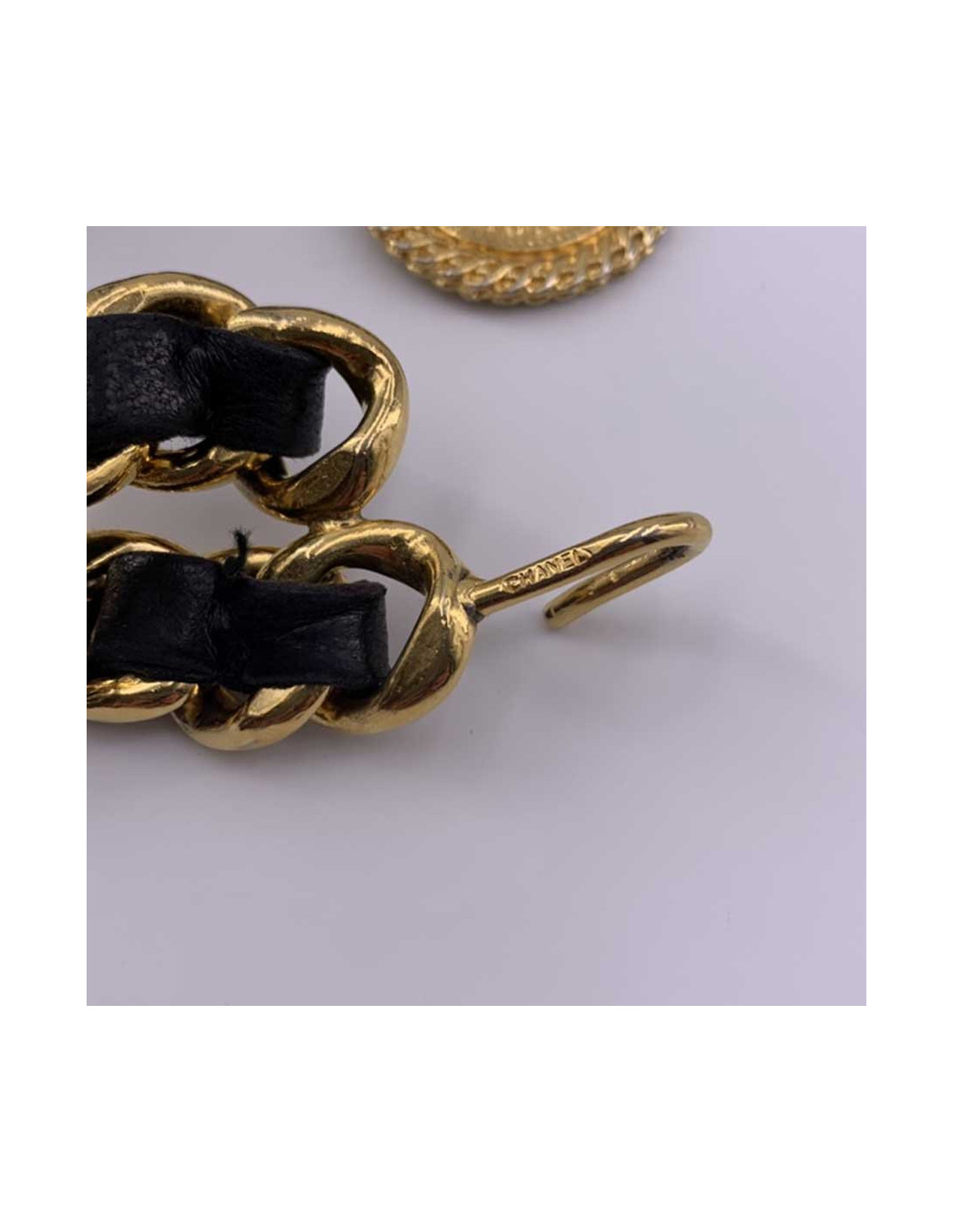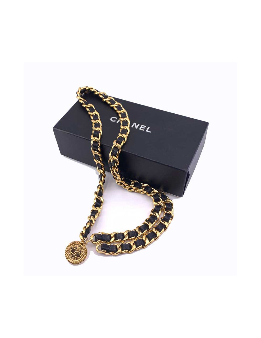 Last items in stock BELTS CHANEL Vintage couture belt CHANEL 32692 1,250.00 € CHANEL Vintage couture belt Condition : goodMade in FranceGender : womanMaterials : metal, resinColors : gold, light pinkMeasurements : length 69 cm, width 1,5 cm, chain 9 cm, pendant diameter 2,5 cmStamp : noyear : 80'sDetail : Couture collection, small round pendant in pink resin with lion's head, metal clasp slightly oxidized Add to cart