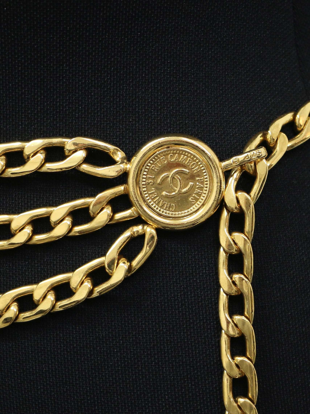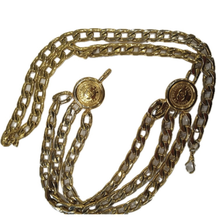 Last items in stock BELTS CHANEL vintage copper chain and leather belt CHANEL 34963 1,710.00 € CHANEL vintage charms CC belt Fall 1997 Condition : very goodGender : womanCollection : beltMaterials : metal, leatherColors : copper, brownMeasurements : total length 82 cm, width 2 cmStamp : yesYear : Fall 1997Hardware: aged copper finish metalDetails : Vintage belt with 8 CC charms. Hook clasp, Chanel signature on top. Belt adjusts to 14 cm. Add to cart
