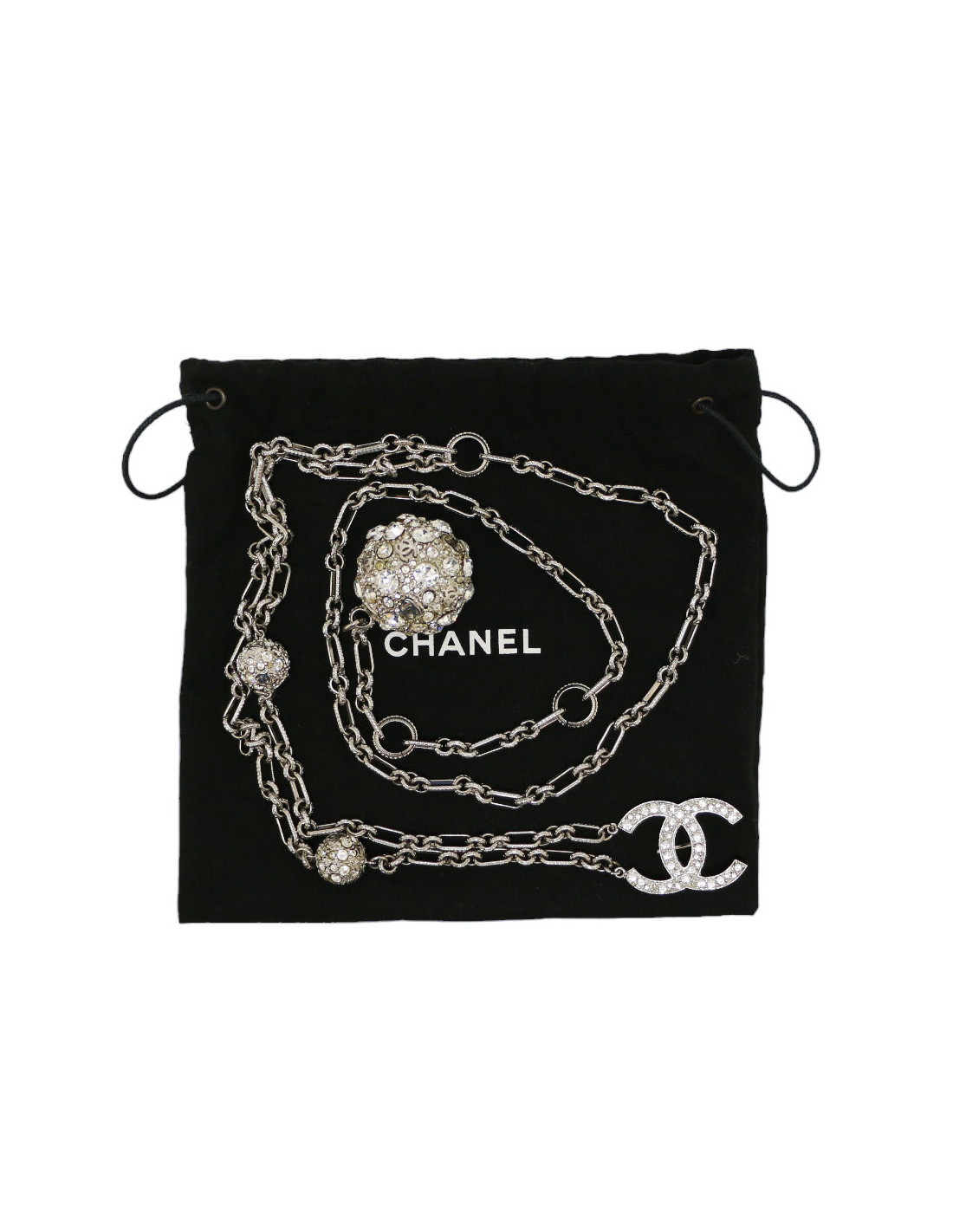 Details : chain belt adjustable by to rings. Three spheres of different sizes and a CC monogram paved in Swarovski crystals.