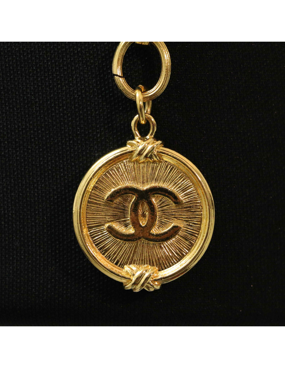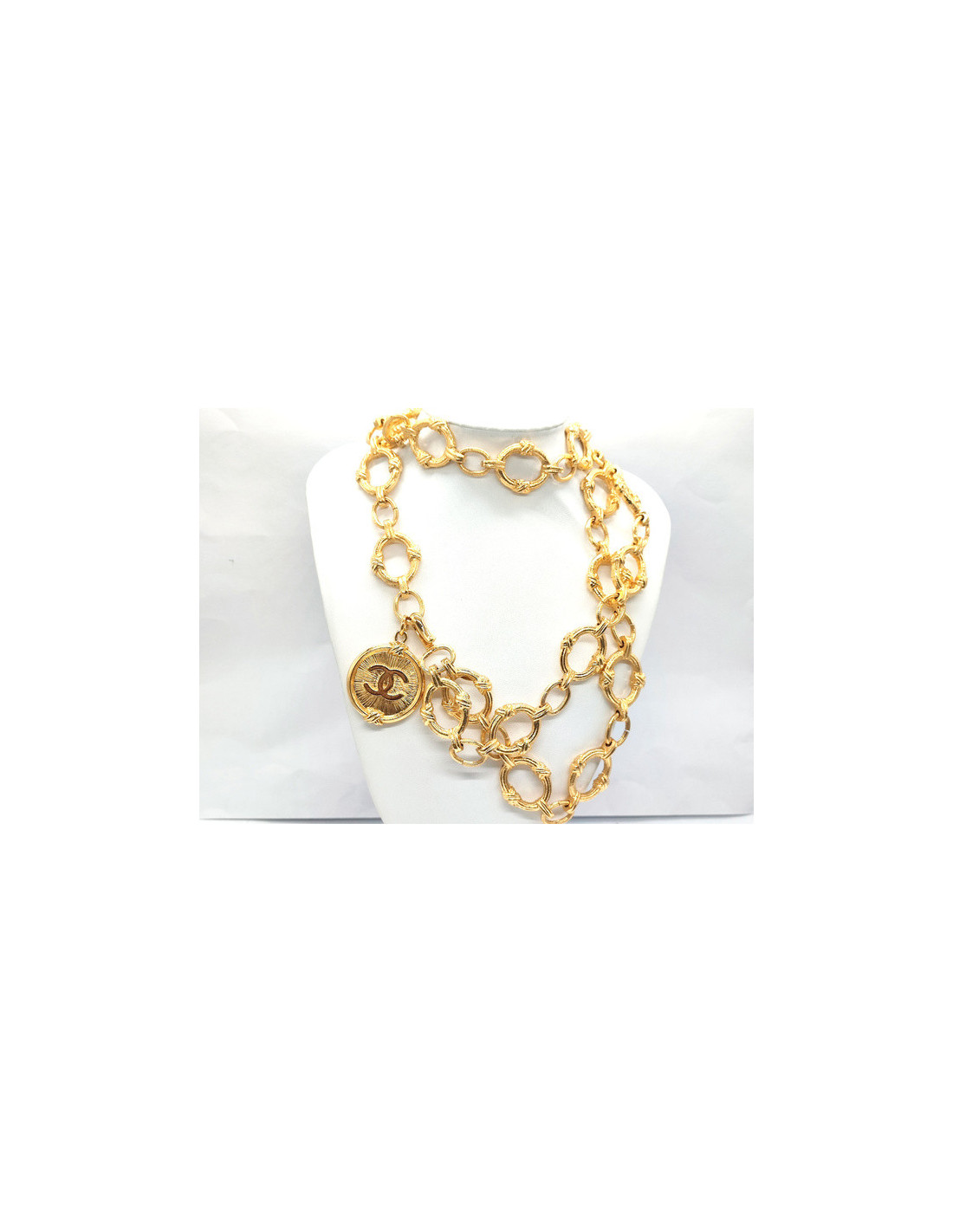 Details : double belt with large CC medallion. The belt is adjustable, as the hook attaches to any link on the chain.