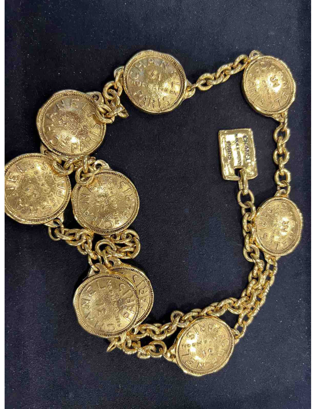 -250.00 € Last items in stock BELTS CHANEL vintage gilded quilted chain belt CHANEL 31956 1,250.00 € 1,500.00 € CHANEL vintage gilded hammered chain belt Condition : very goodMade in FranceMaterial: metalColor : goldMeasurements : 85 cmHardware : gold finish metalStamp : yesVintage prior to 1990 Add to cart