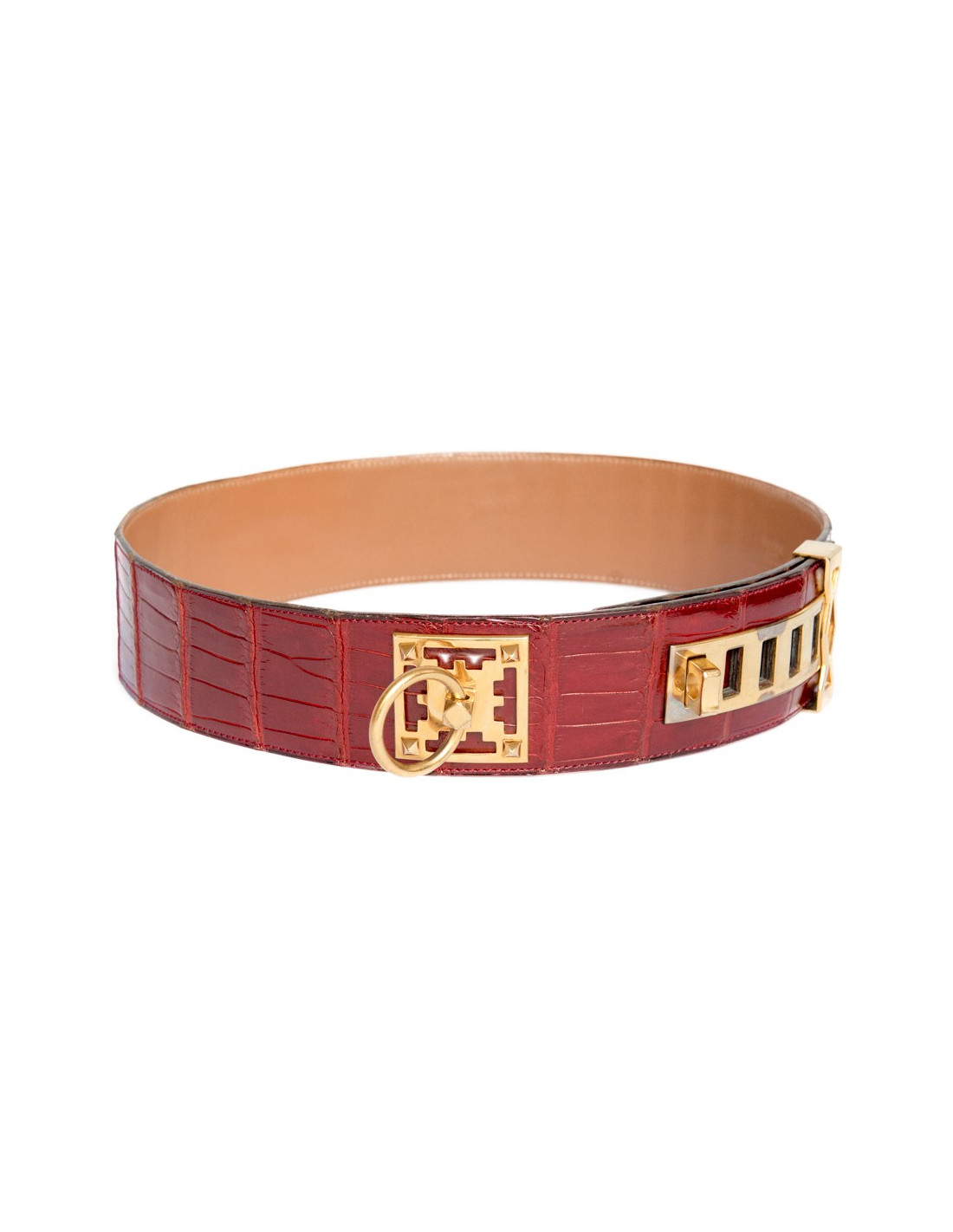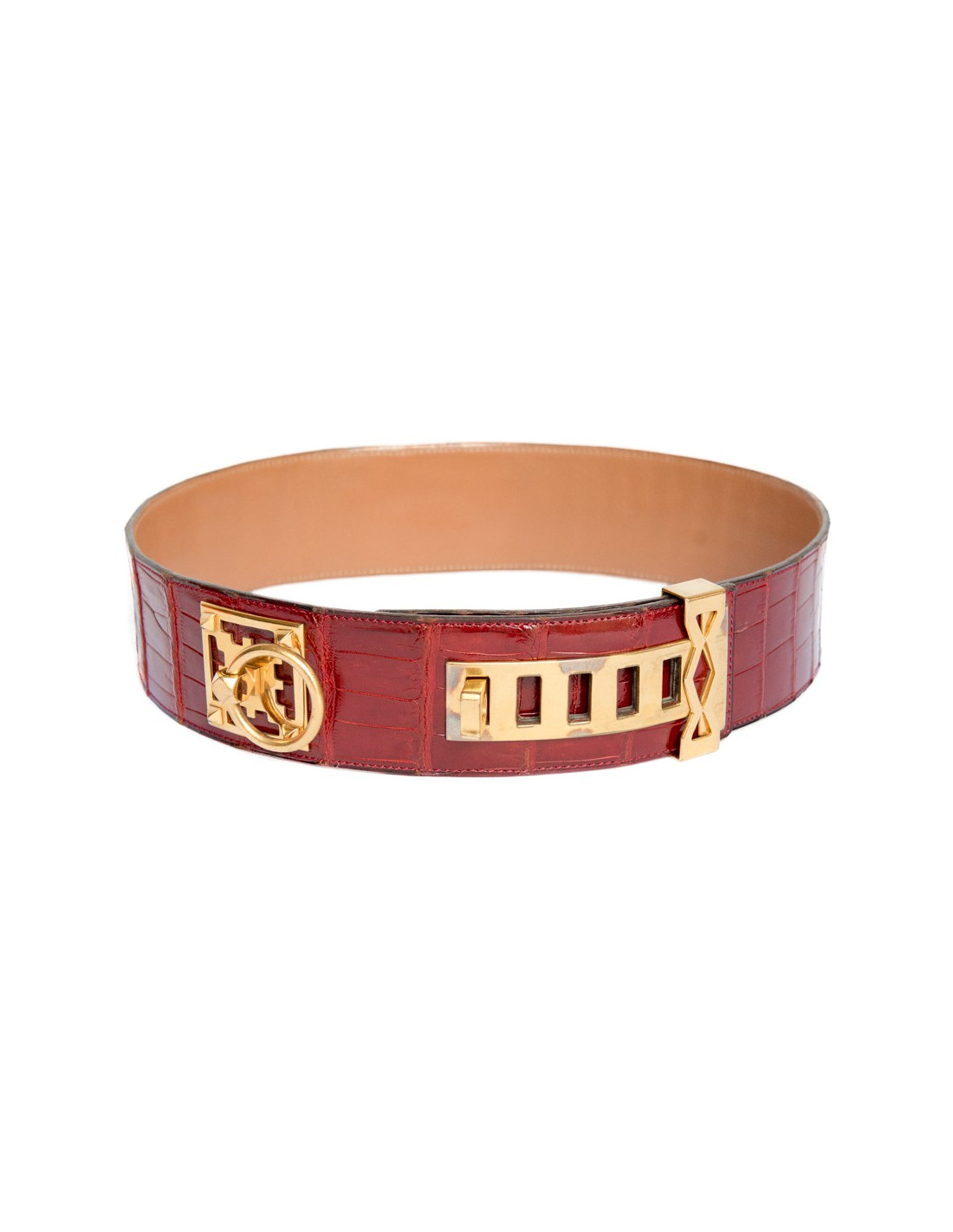 Rare belt Hermes, probably the ancestor of the Fido in crocodile porosus red Ember, and Interior in box gold. The jewellery designs are exceptional and golden.