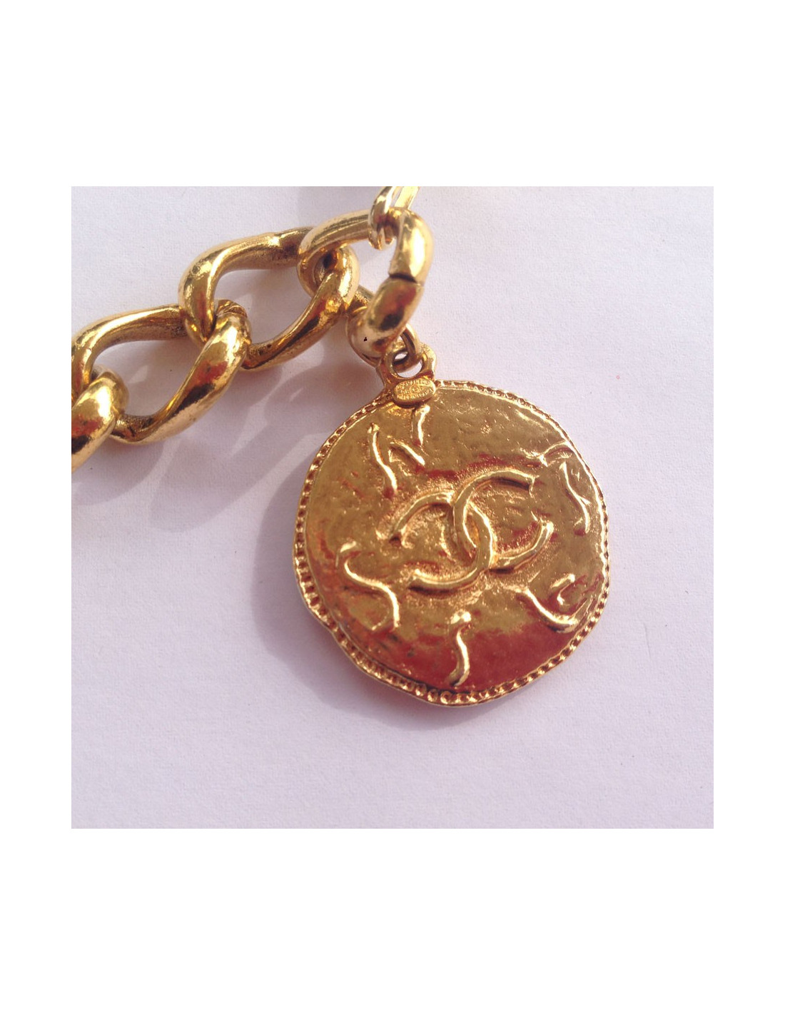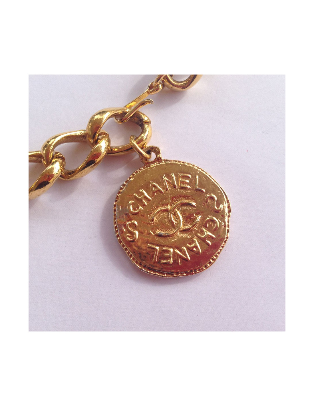 90's! Very beautiful and timeless CHANEL House in golden chain belt. Vintage. The belt ends with a medal to the abbreviation CC on one side and the inscription CHANEL on the other. Gold rose slightly on a small corner of the medal. A hook closure. In very good condition.