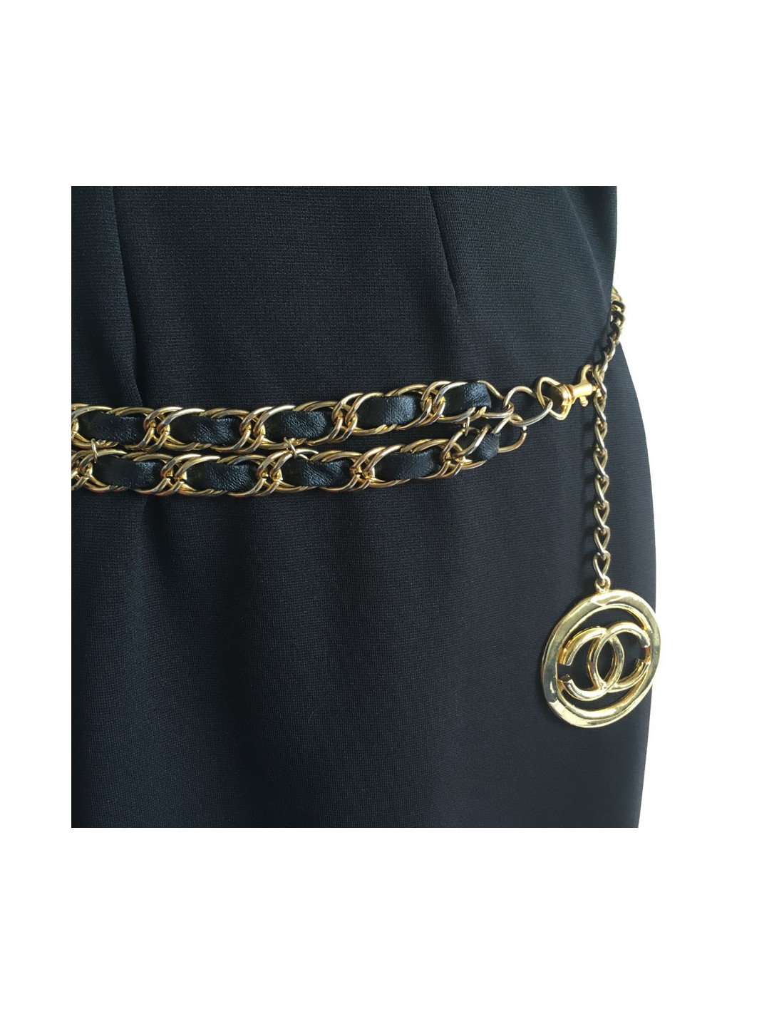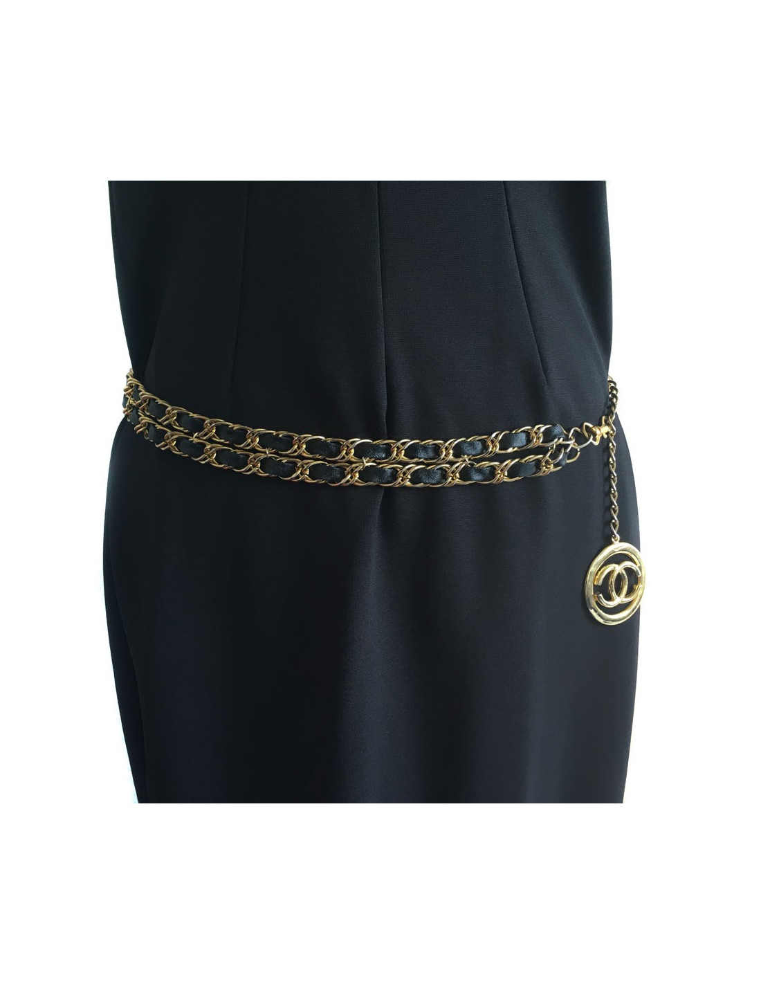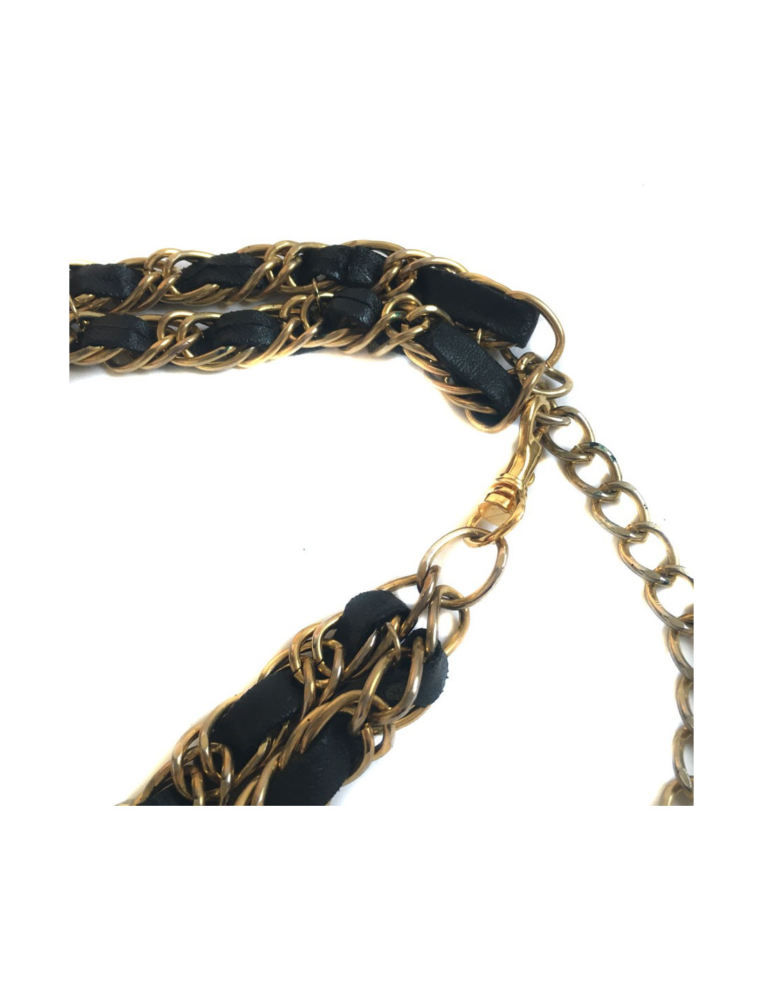 CHANEL vintage belt double row chain Golden interlaced with black leather. The belt ends with a CC in a round, all gold metal. Gilding is a little faded throughout the belt.