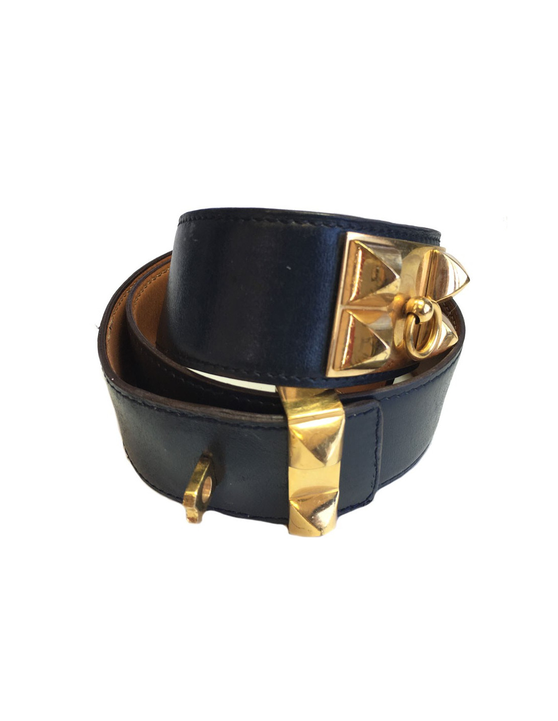 Navy blue leather belt HERMES CDC "Fido". Loop and jewellery gold metal. Brown leather interior. Approximately size 72 (missing indication of size on the belt)