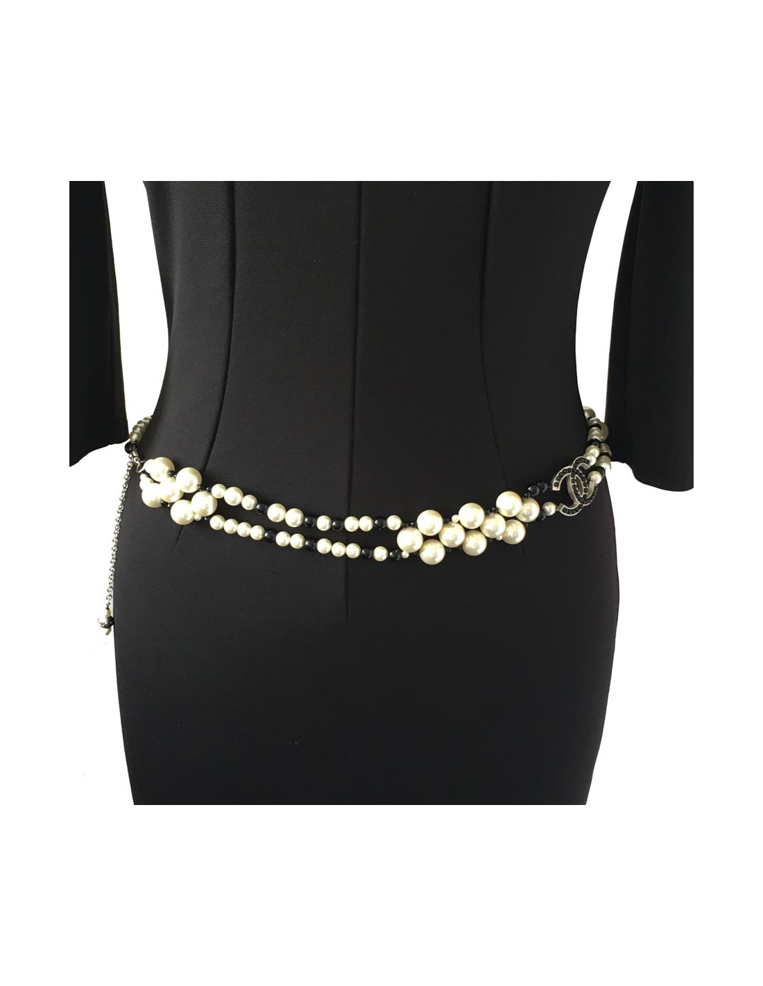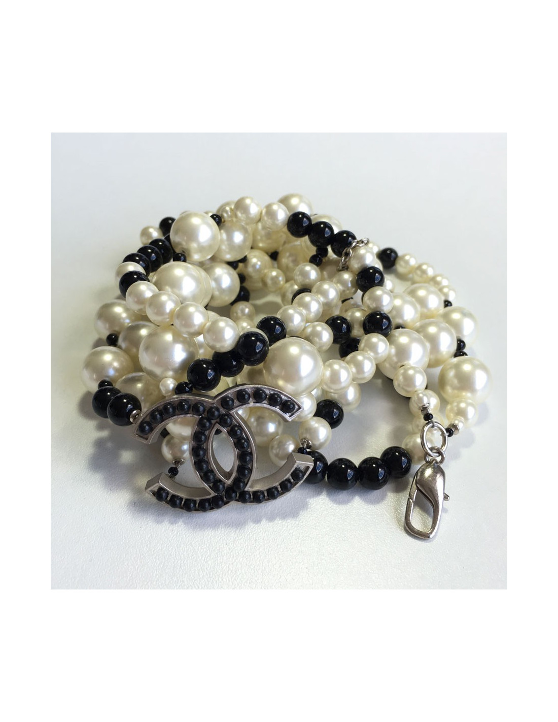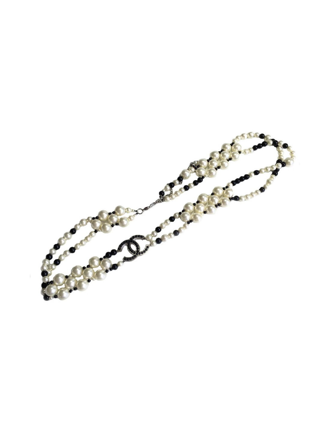 Sublime ceinture-sautoir CHANEL en perles nacrées et perles noires, un CC en métal argenté serti de petites perles. En très bon état.