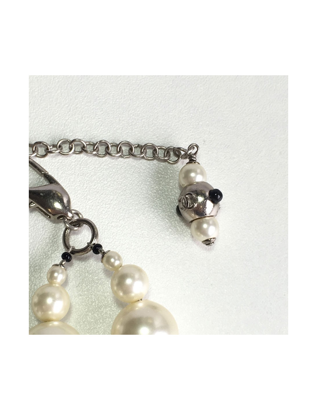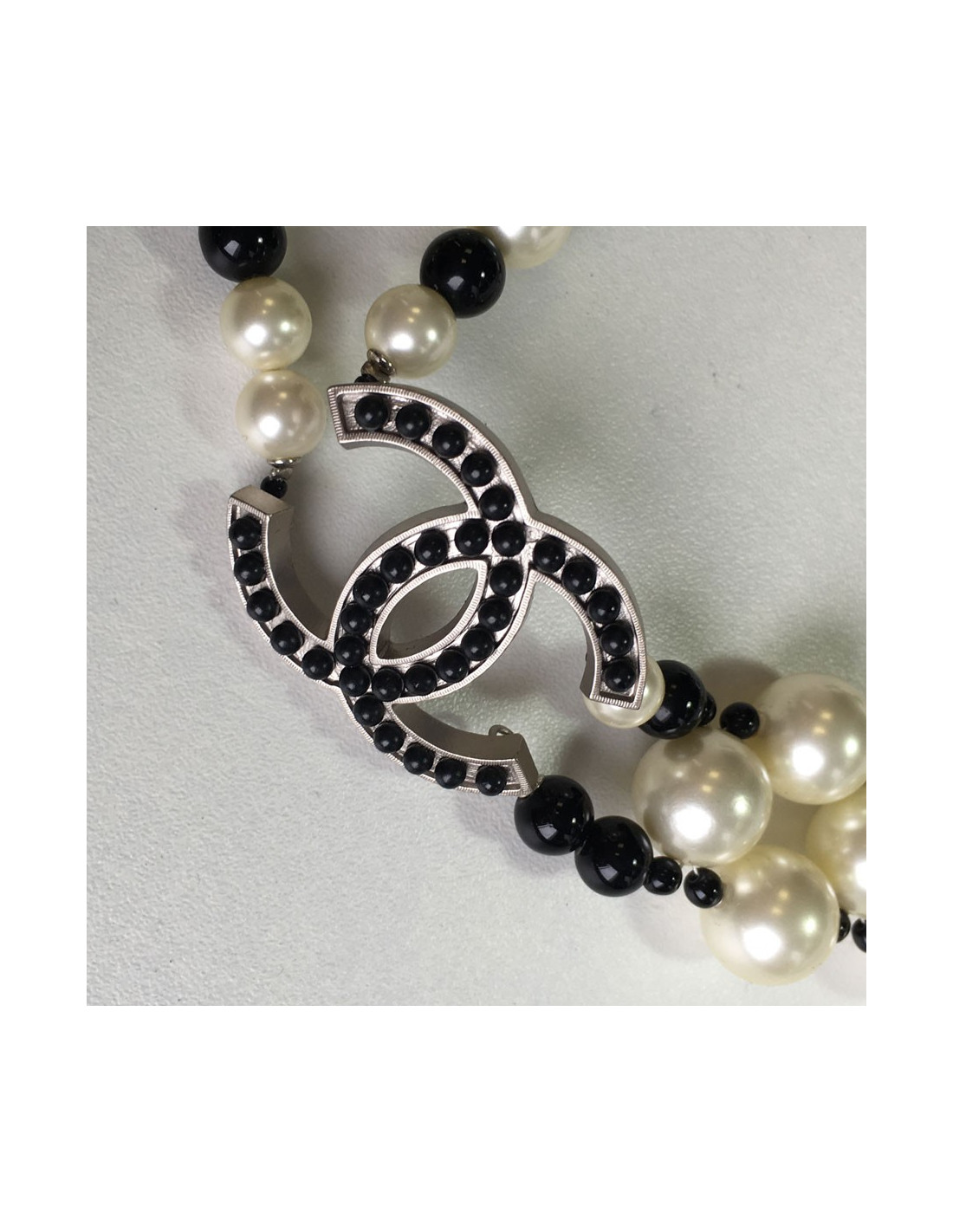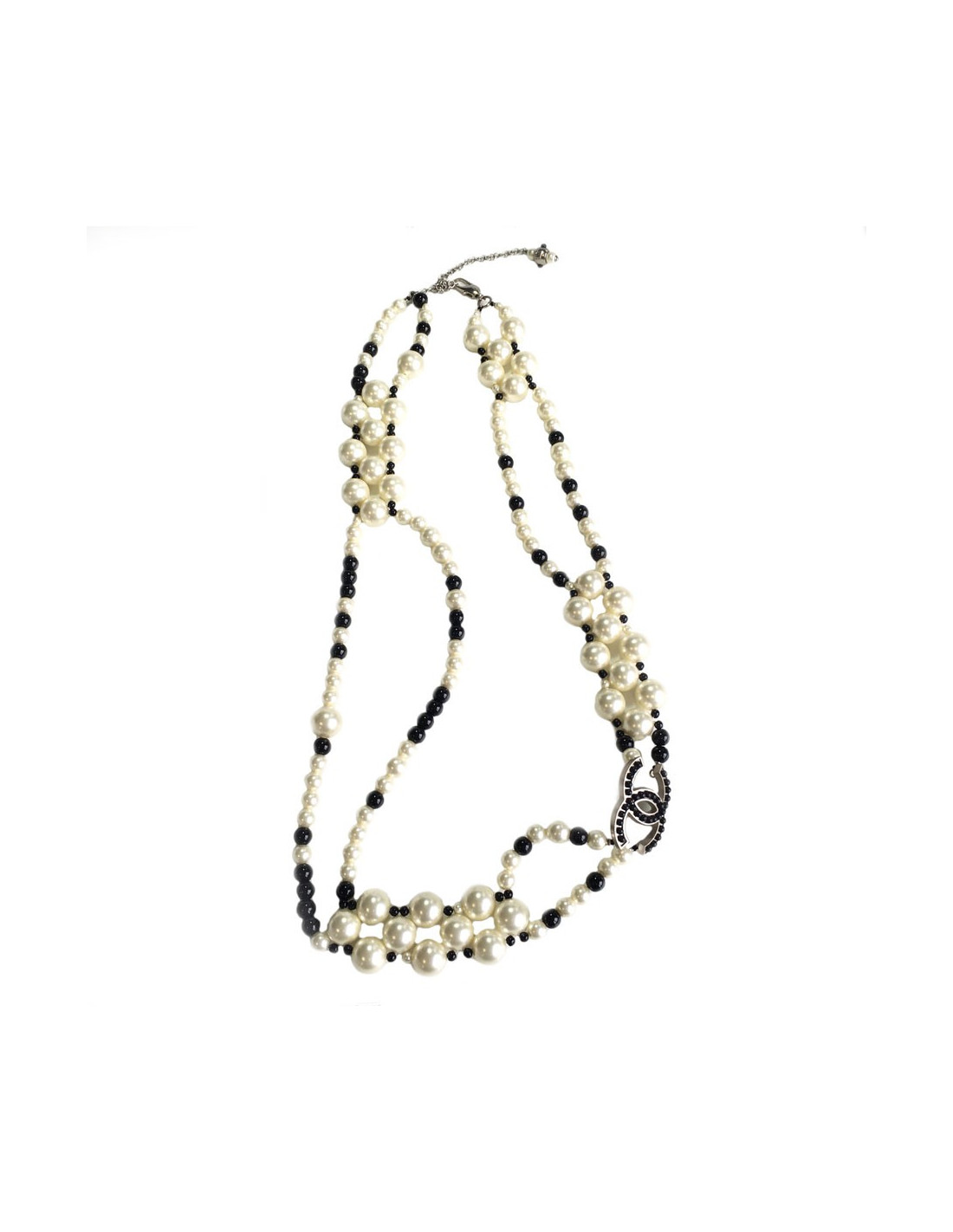 Sublime ceinture-sautoir CHANEL en perles nacrées et perles noires, un CC en métal argenté serti de petites perles. En très bon état.