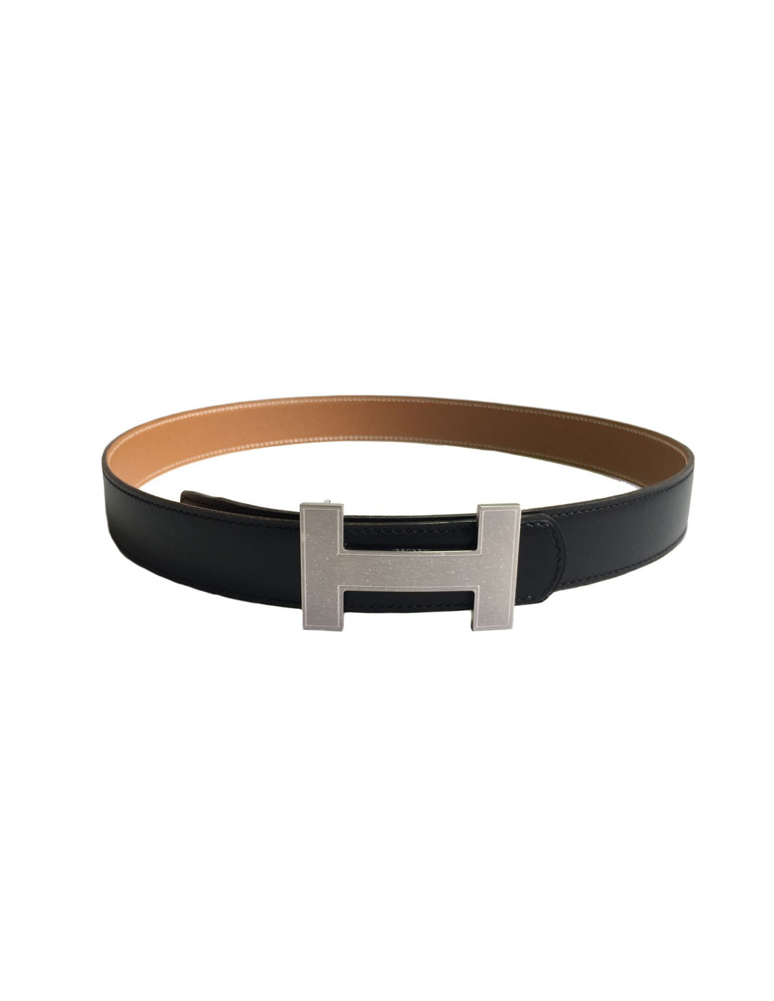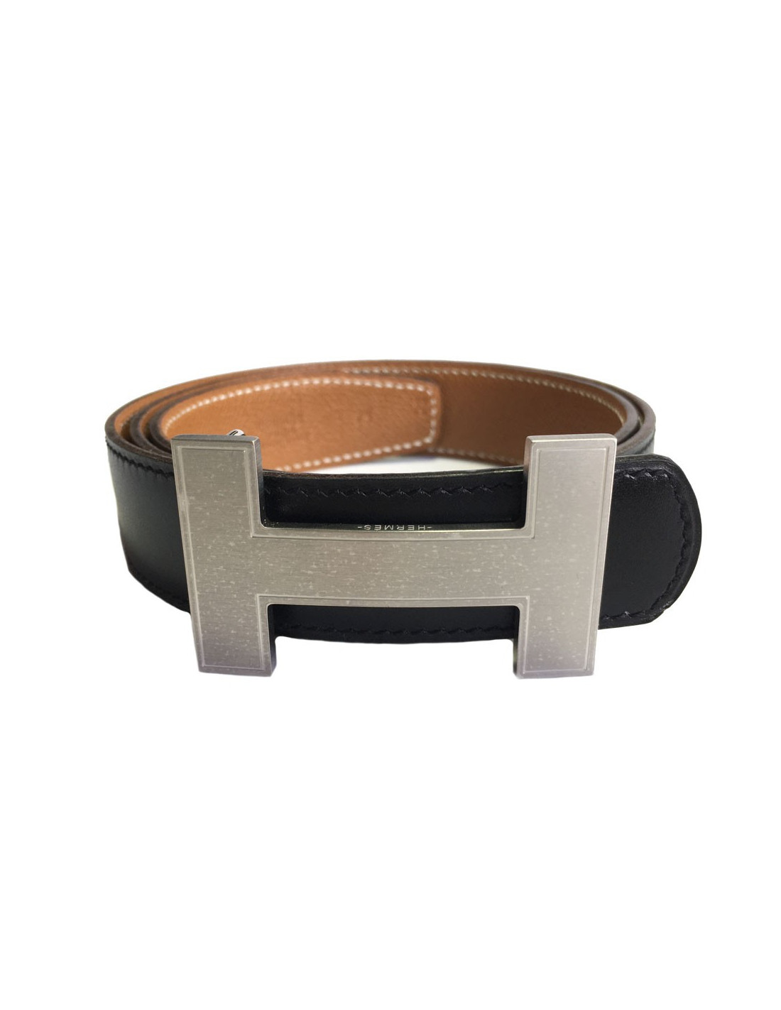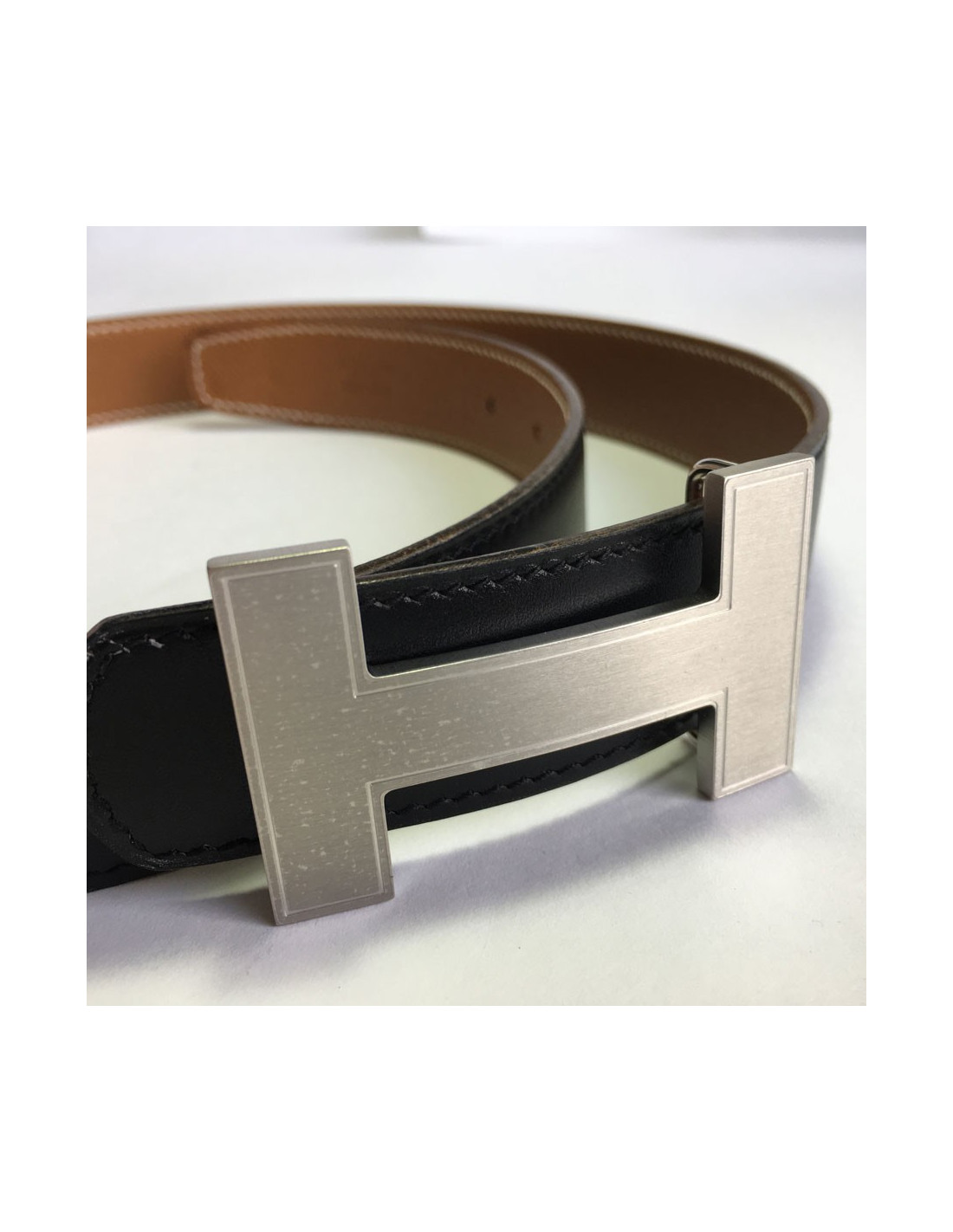 Ceinture HERMES en cuir box noir, réversible en cuir grainé gold. Boucle H en métal argenté brossé. Taille 75. Etat neuf. Lettre D dans un carré. Etat neuf