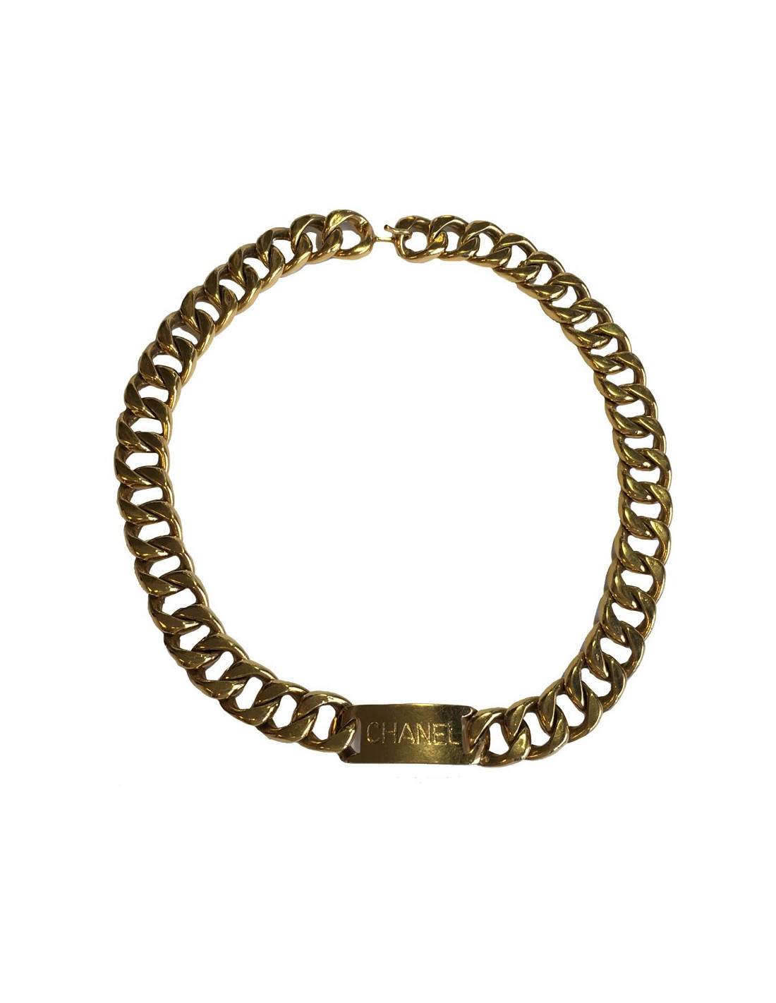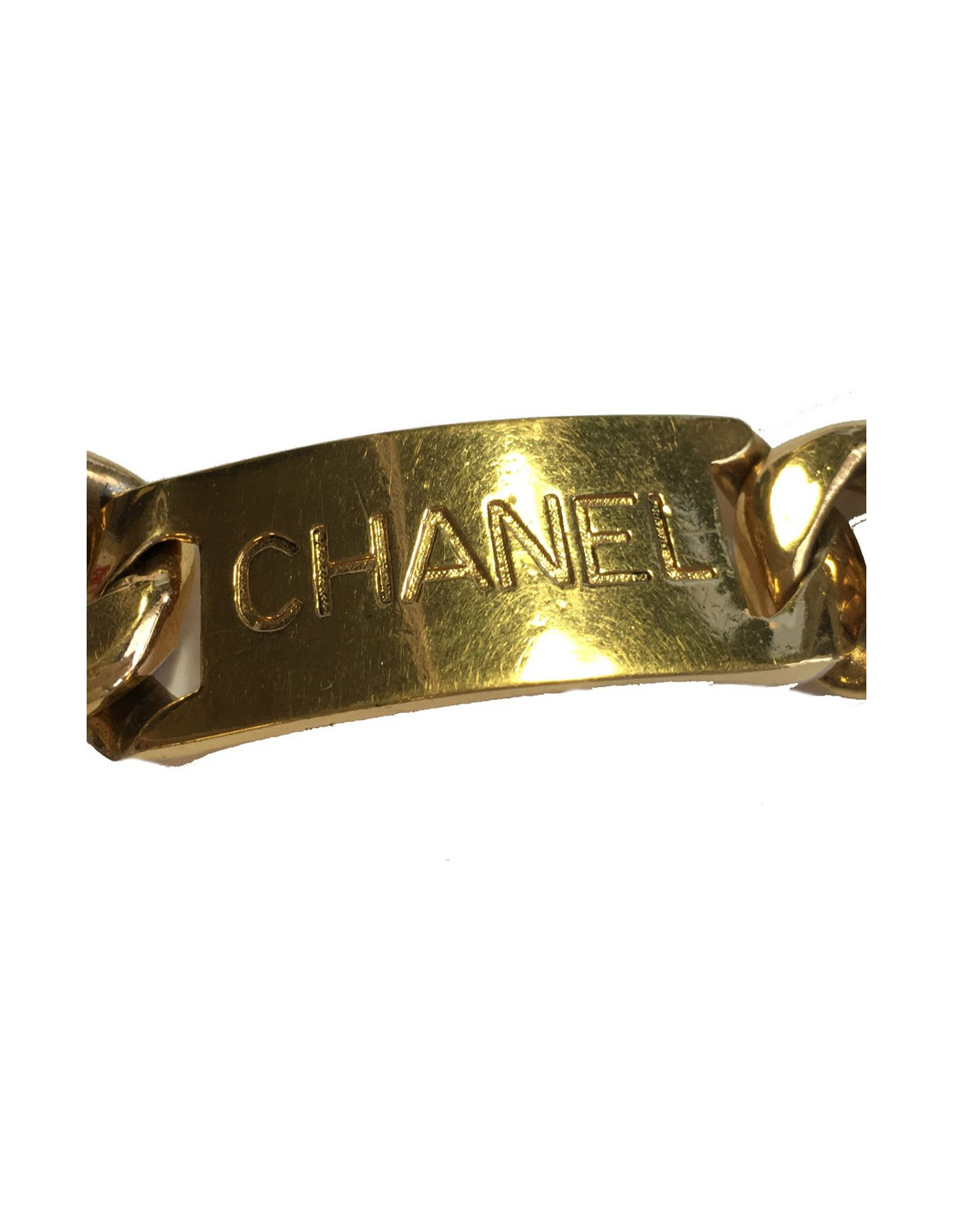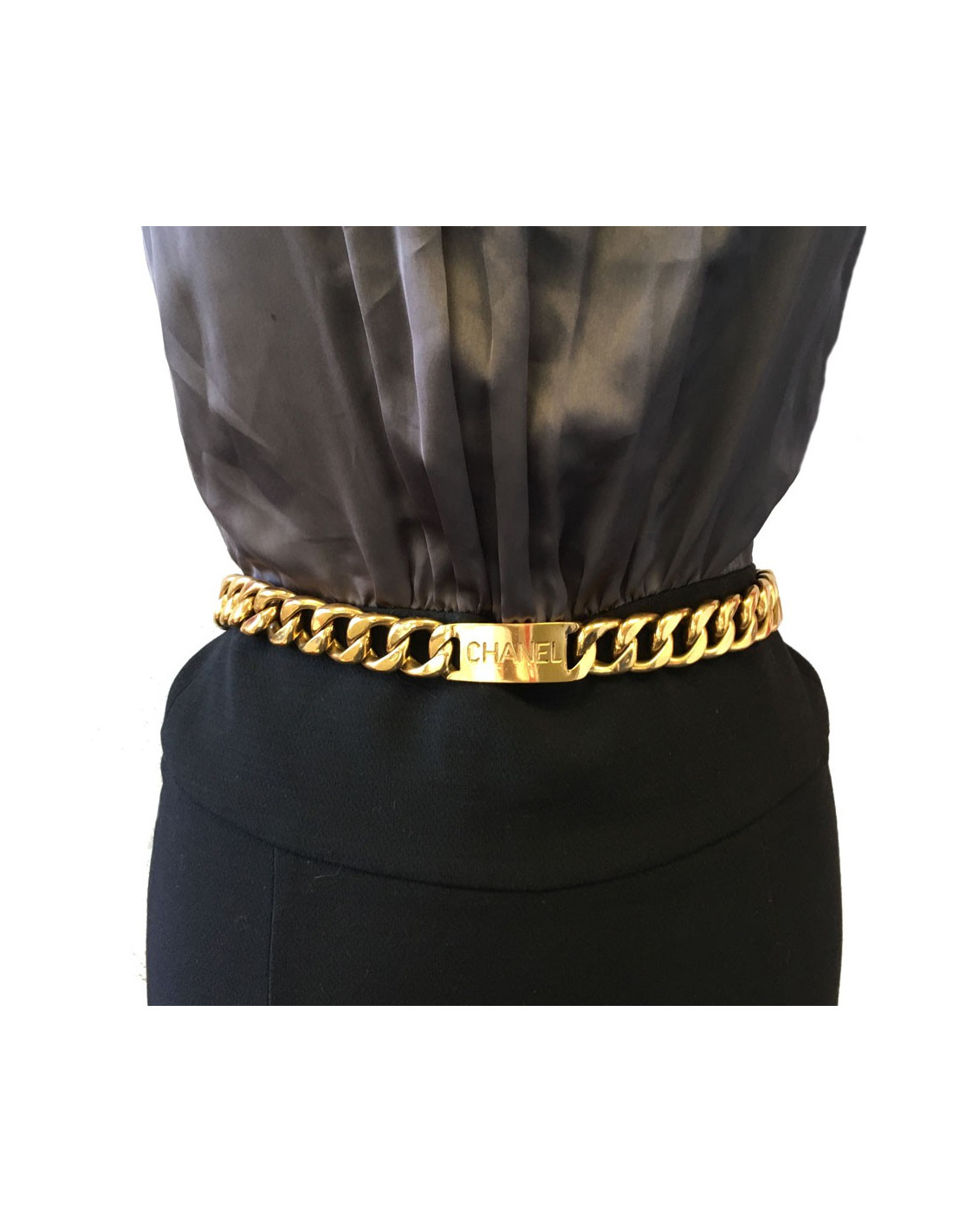 80's !! CHANEL belt with big mesh in gilded metal. In the center a plate with the CHANEL brand engraved on the front.