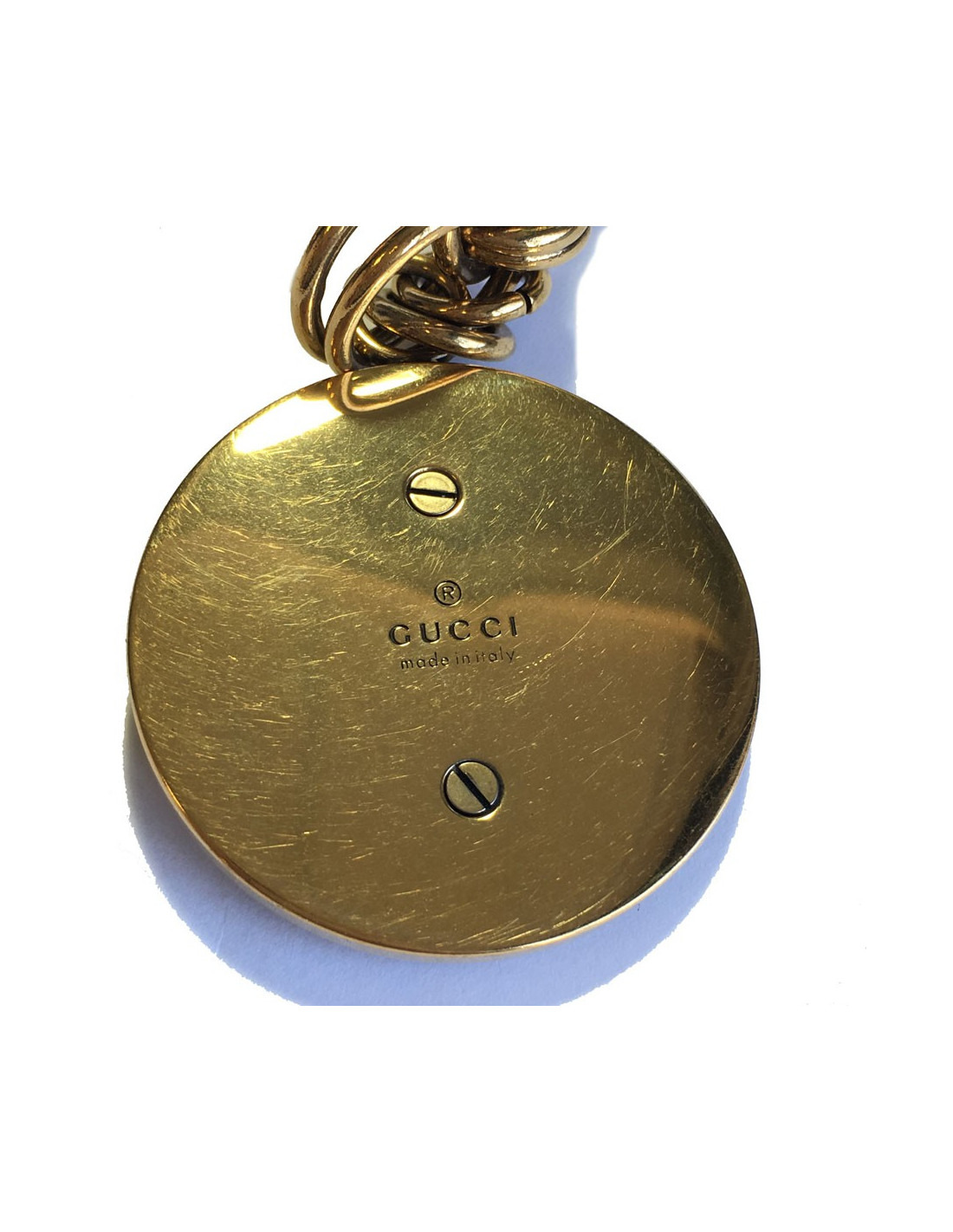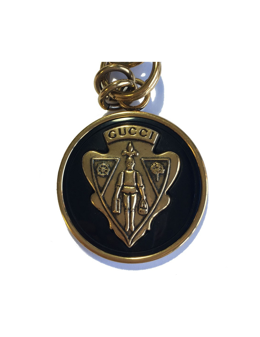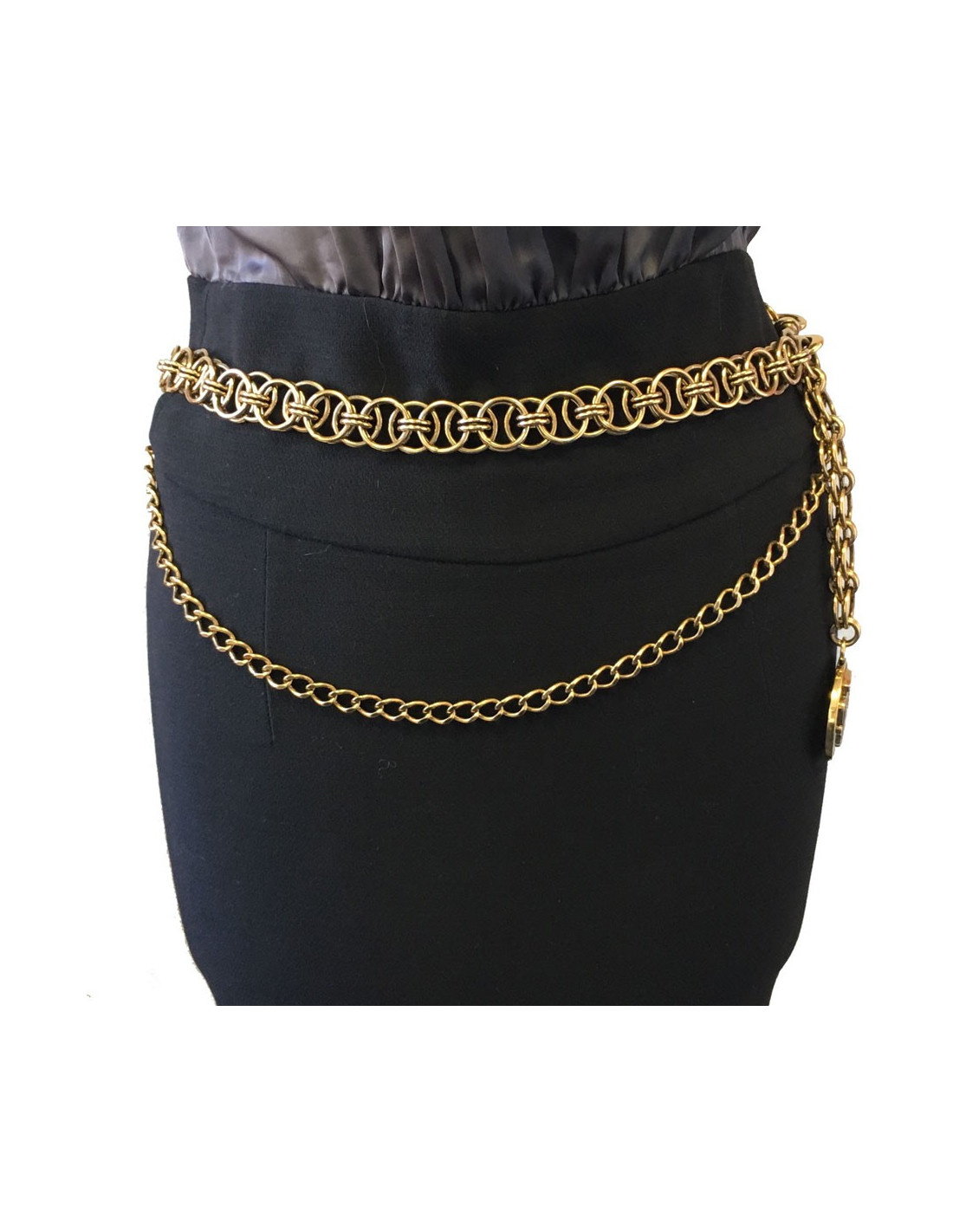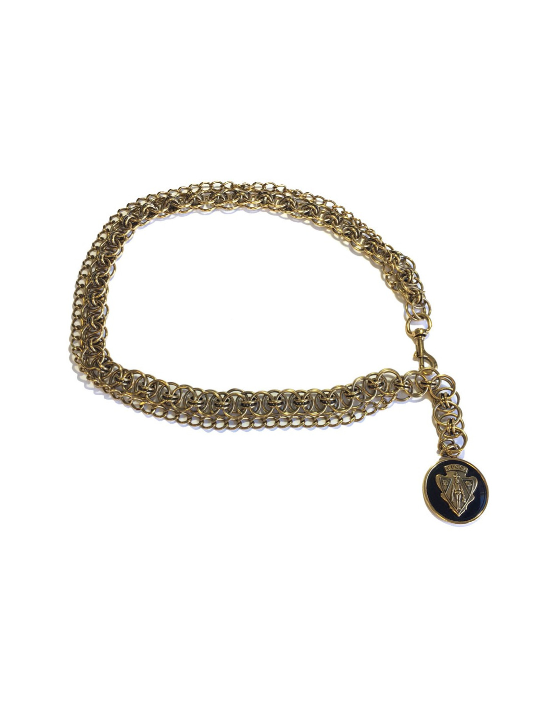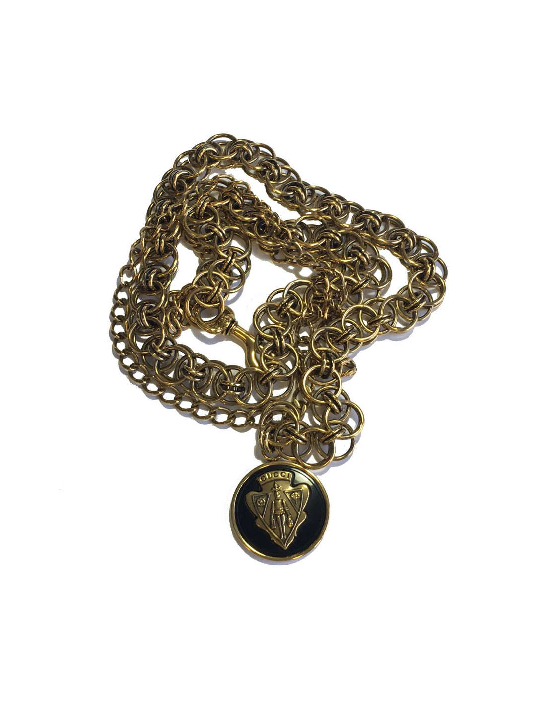 Ceinture sautoir GUCCI vintage. Deux chaînes dorées ( une large et une fine) se terminant par une pièce ronde dorée sur fond noir. En très bon état.