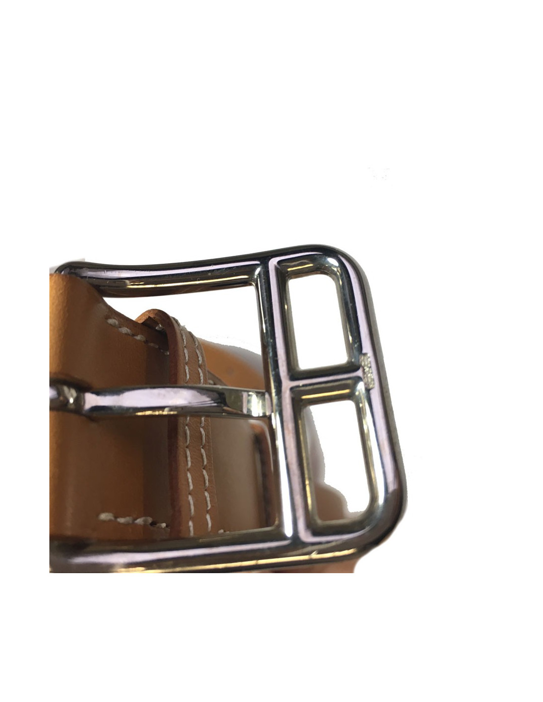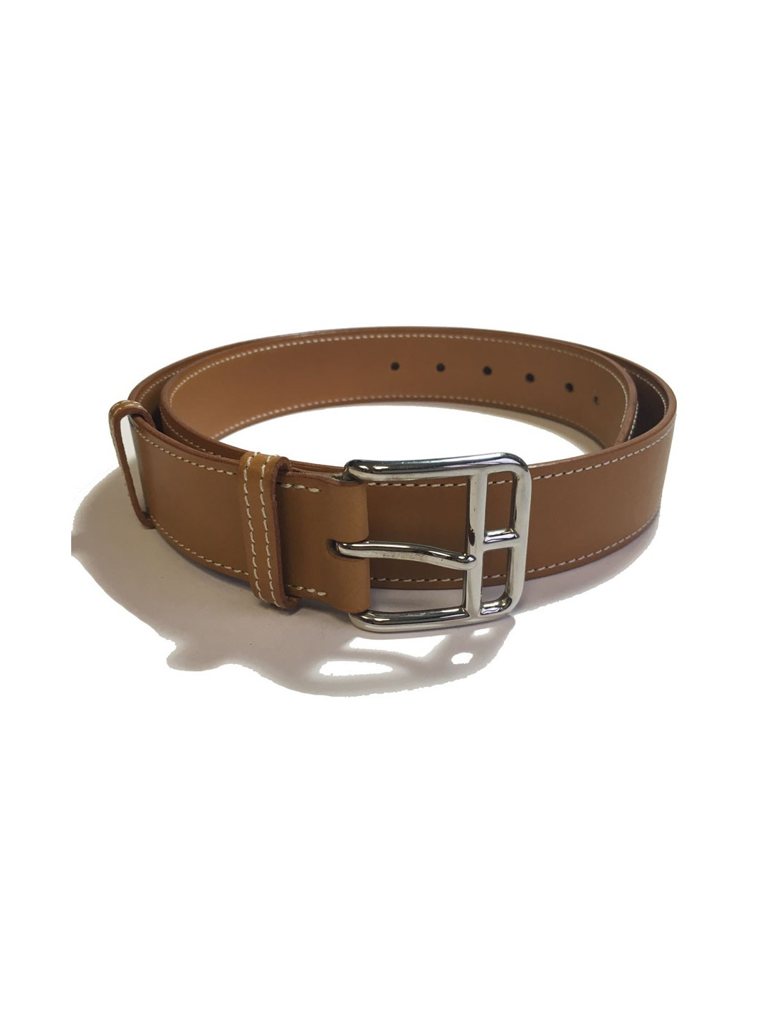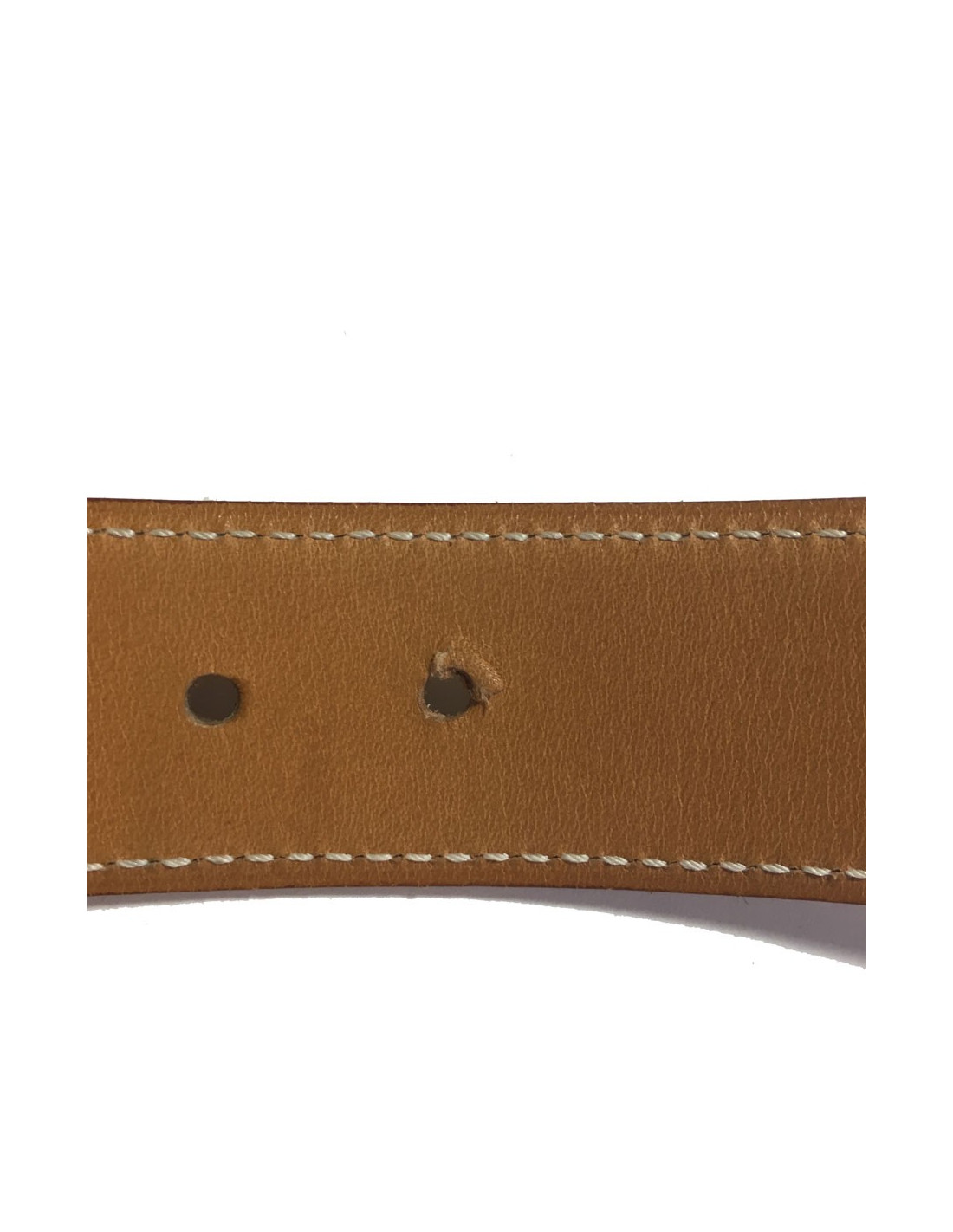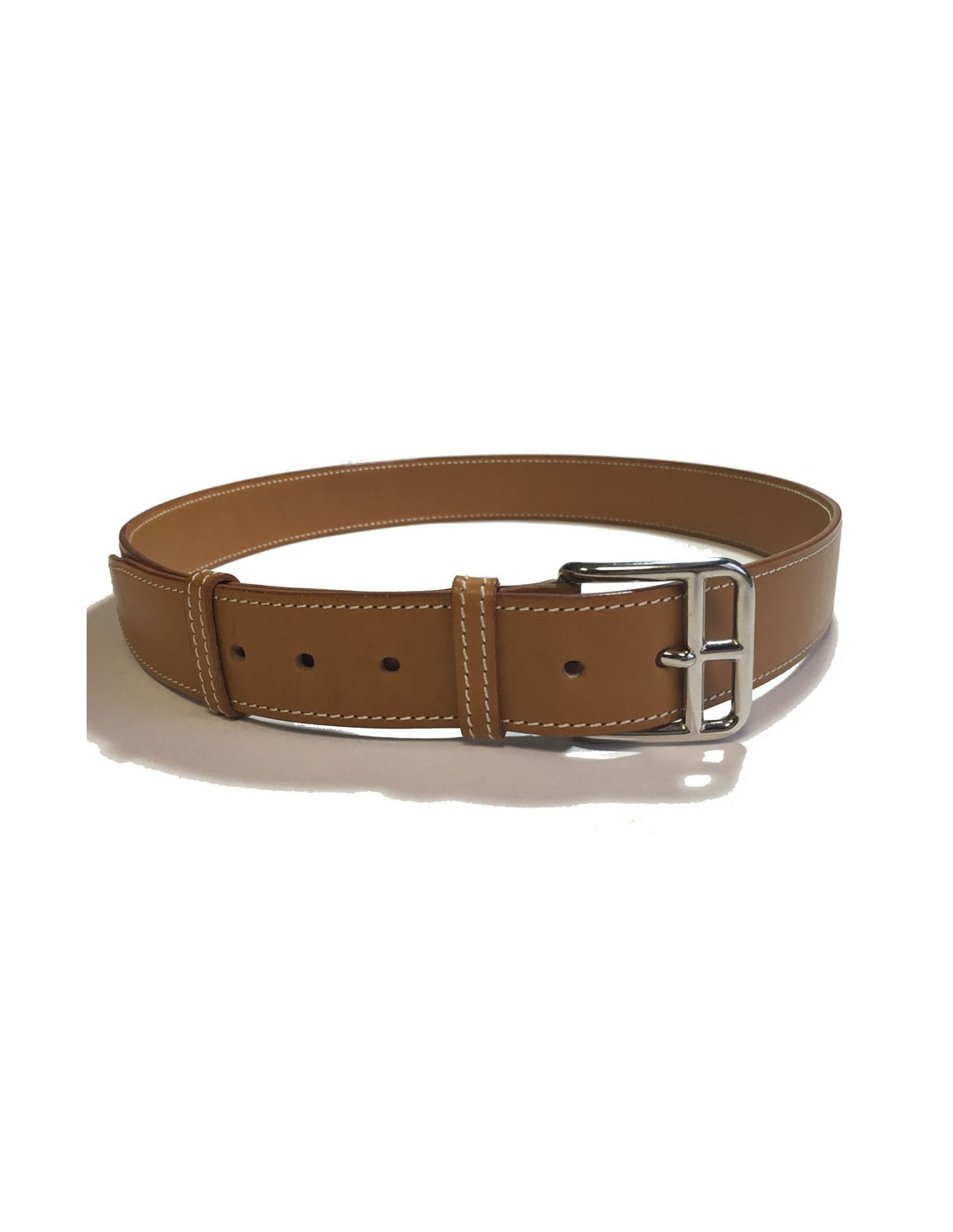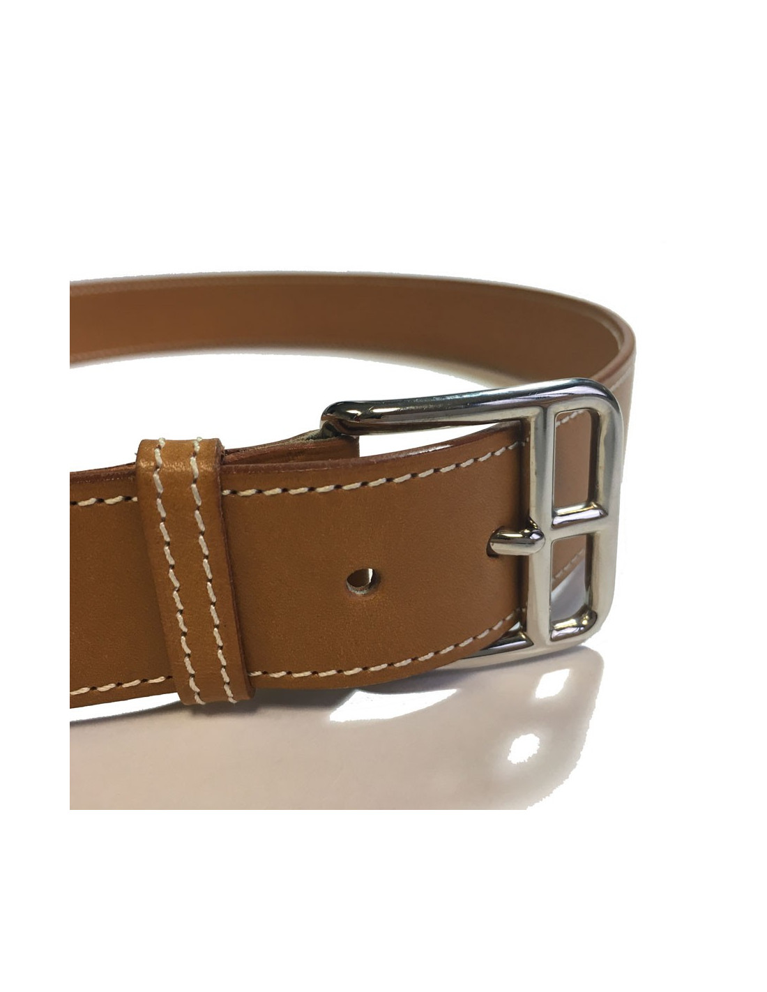 HERMES belt in gold leather, white stitching. Buckle in palladium metal. In very good condition. Micro scratches imperceptible on the leather.