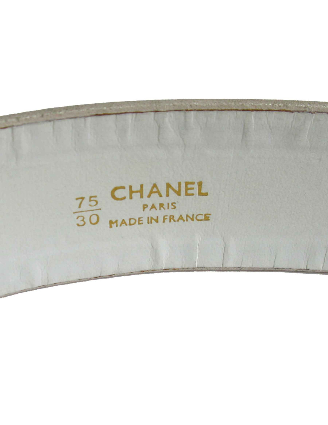 Chanel belt in white leather and gilded metal chain. Clasp in gilded metal. CHANEL inscribed on the clasp. A golden medal completes the belt.