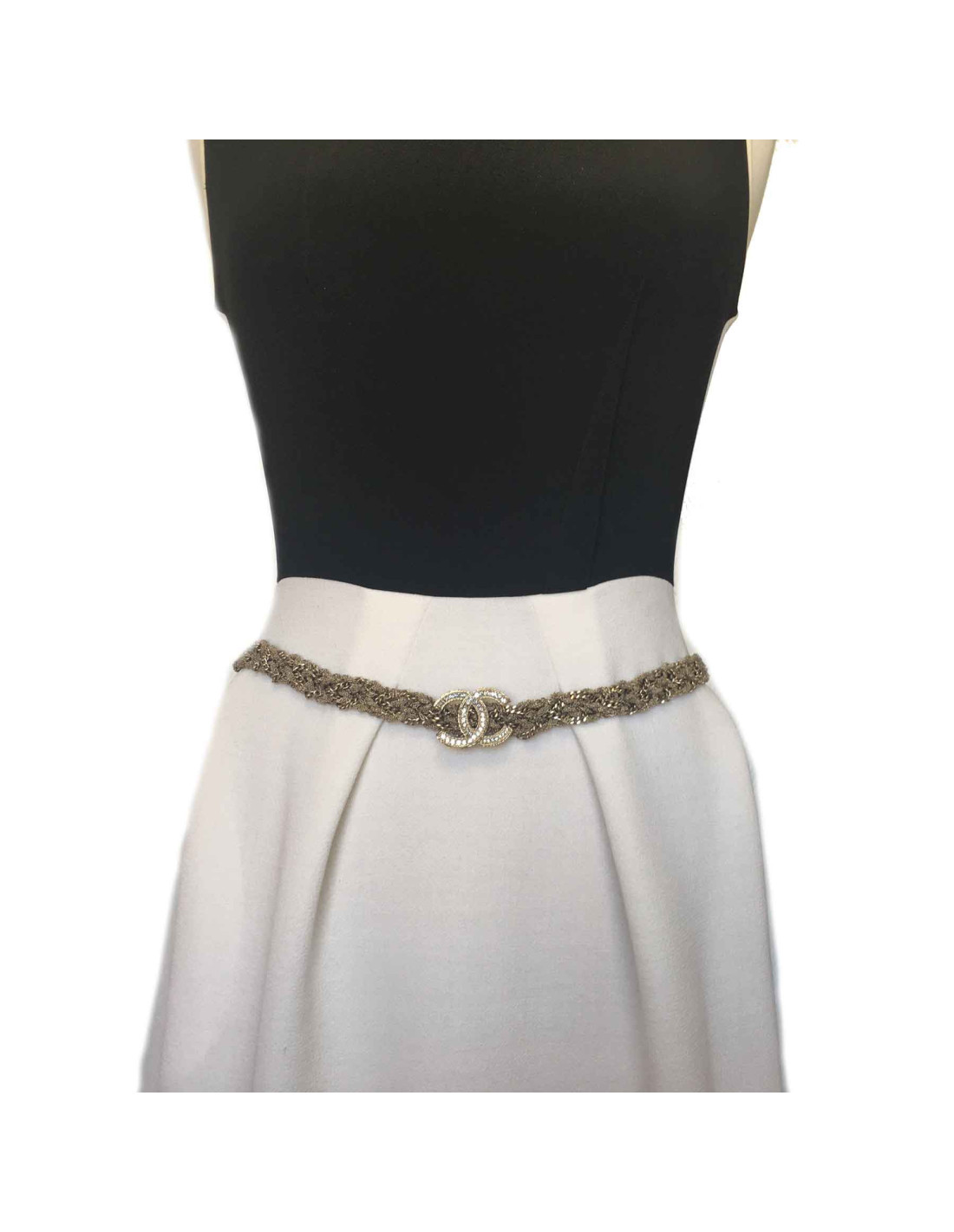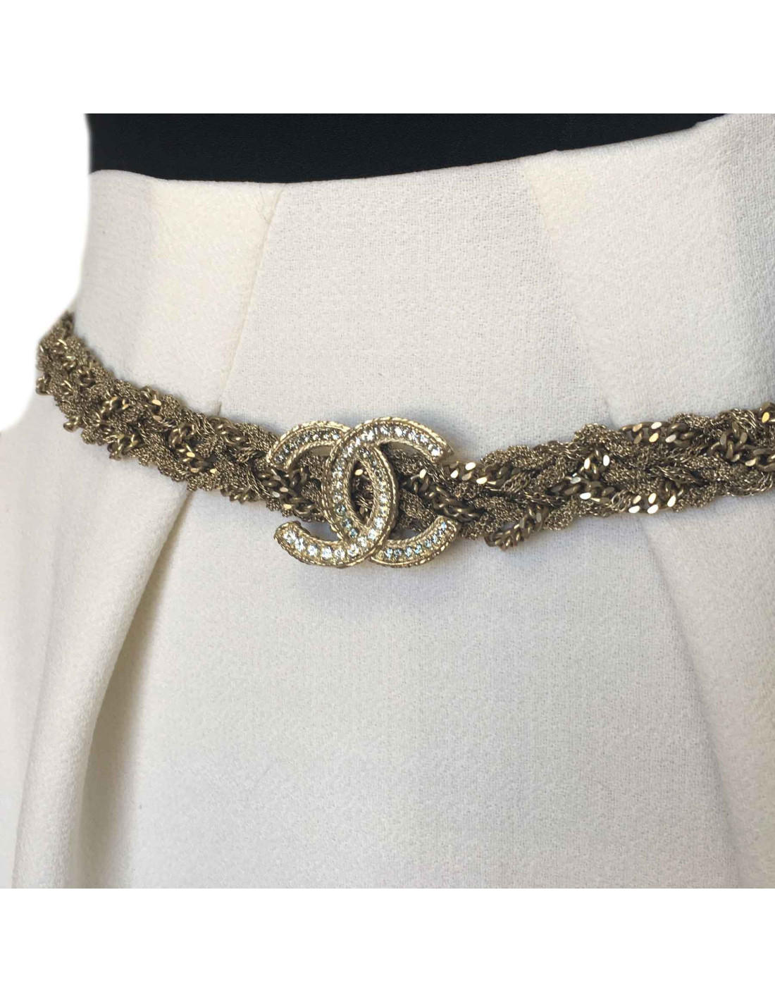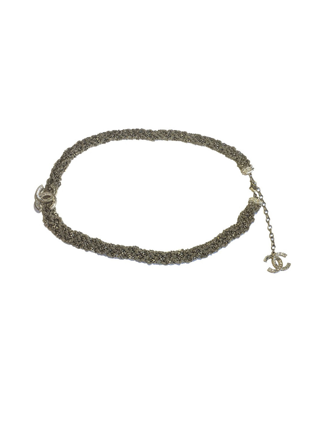 Beautiful Chanel belt, different interlaced chains in pale gold metal. It is decorated with two beautiful double C gold metal, set with rhinestones. It's a limited series.